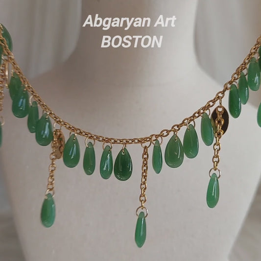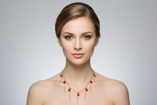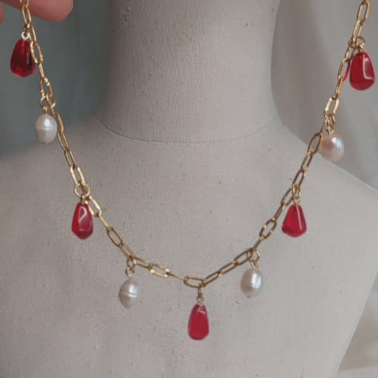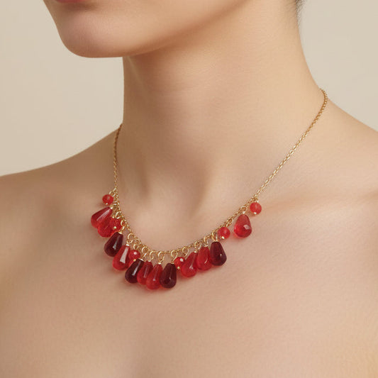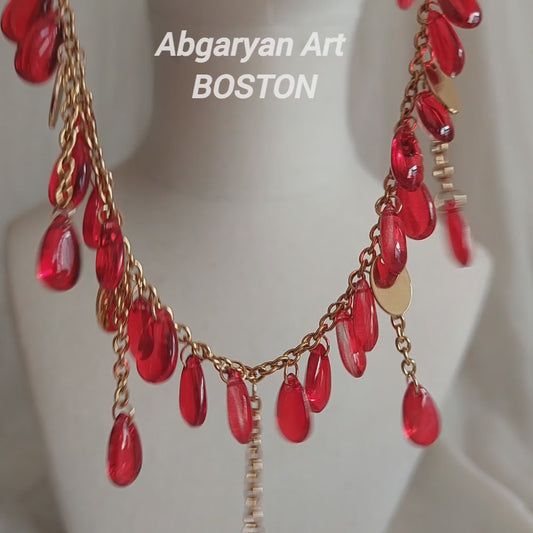 Handmade red drop glass beads necklace with hanging chains