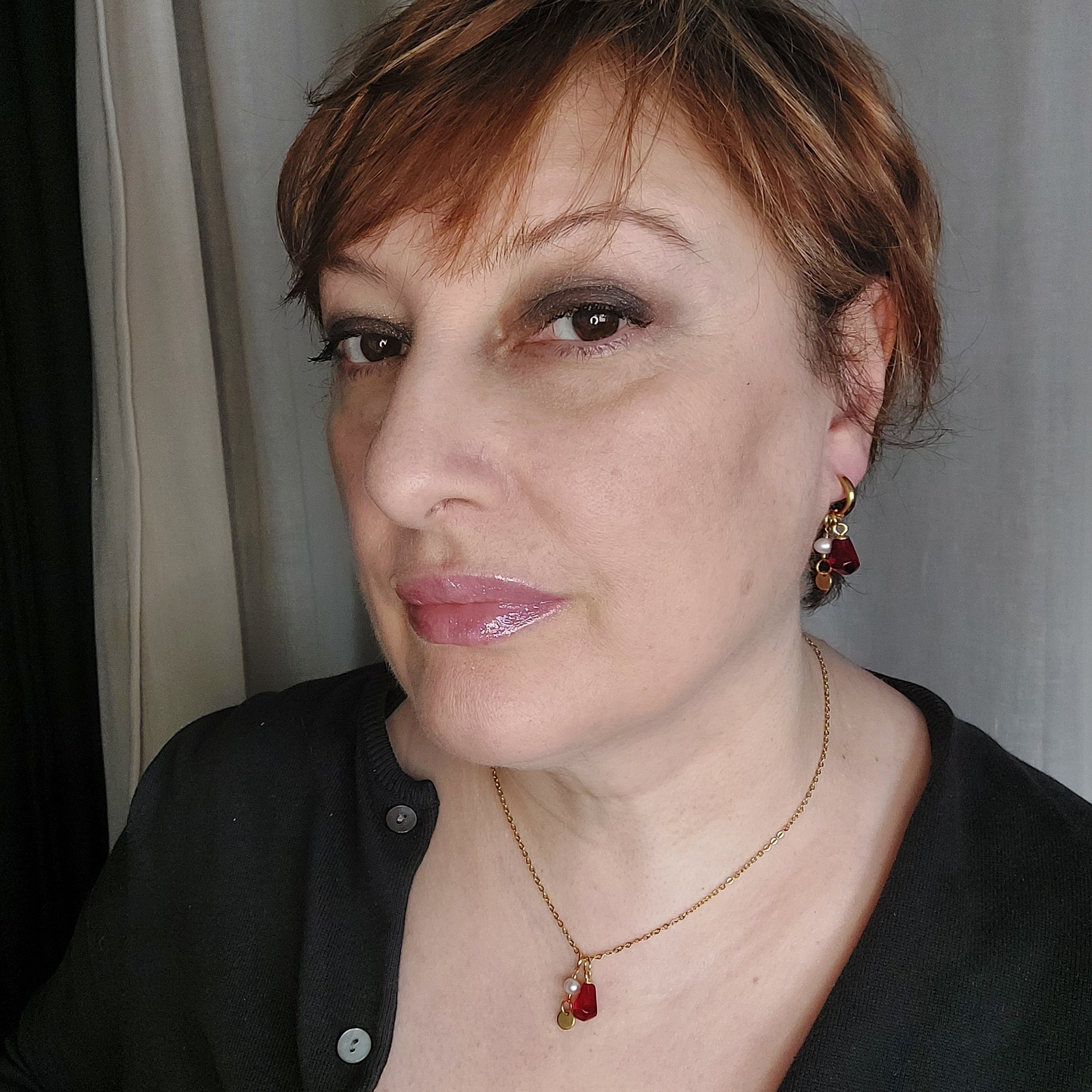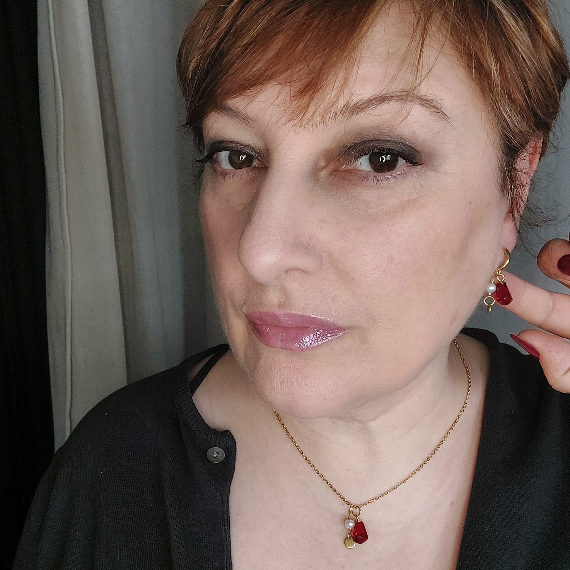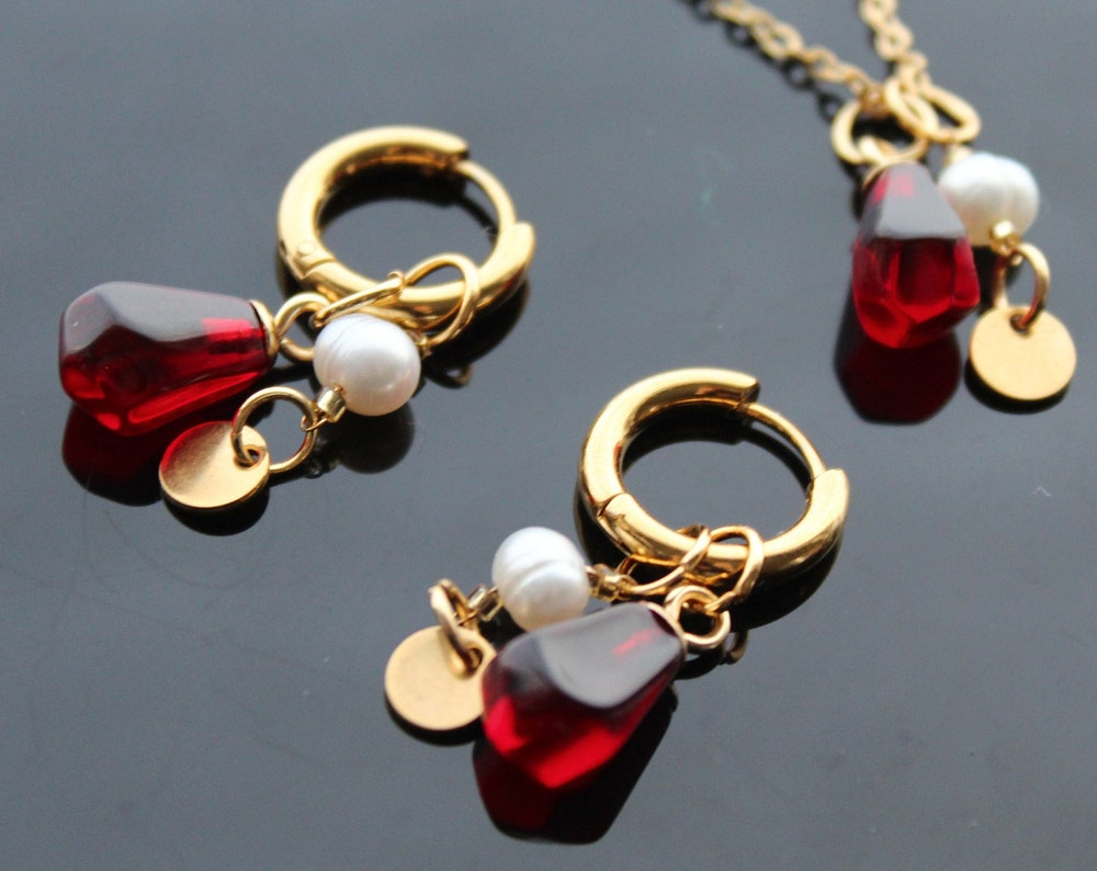 This unique handmade jewelry set features delicate pomegranate seeds, beautifully paired with gold plated stainless steel parts and natural pearls. Handcrafted with care, this set exudes elegance and sophistication. Elevate your style with the natural beauty of pomegranate seeds and timeless luxury of pearls.