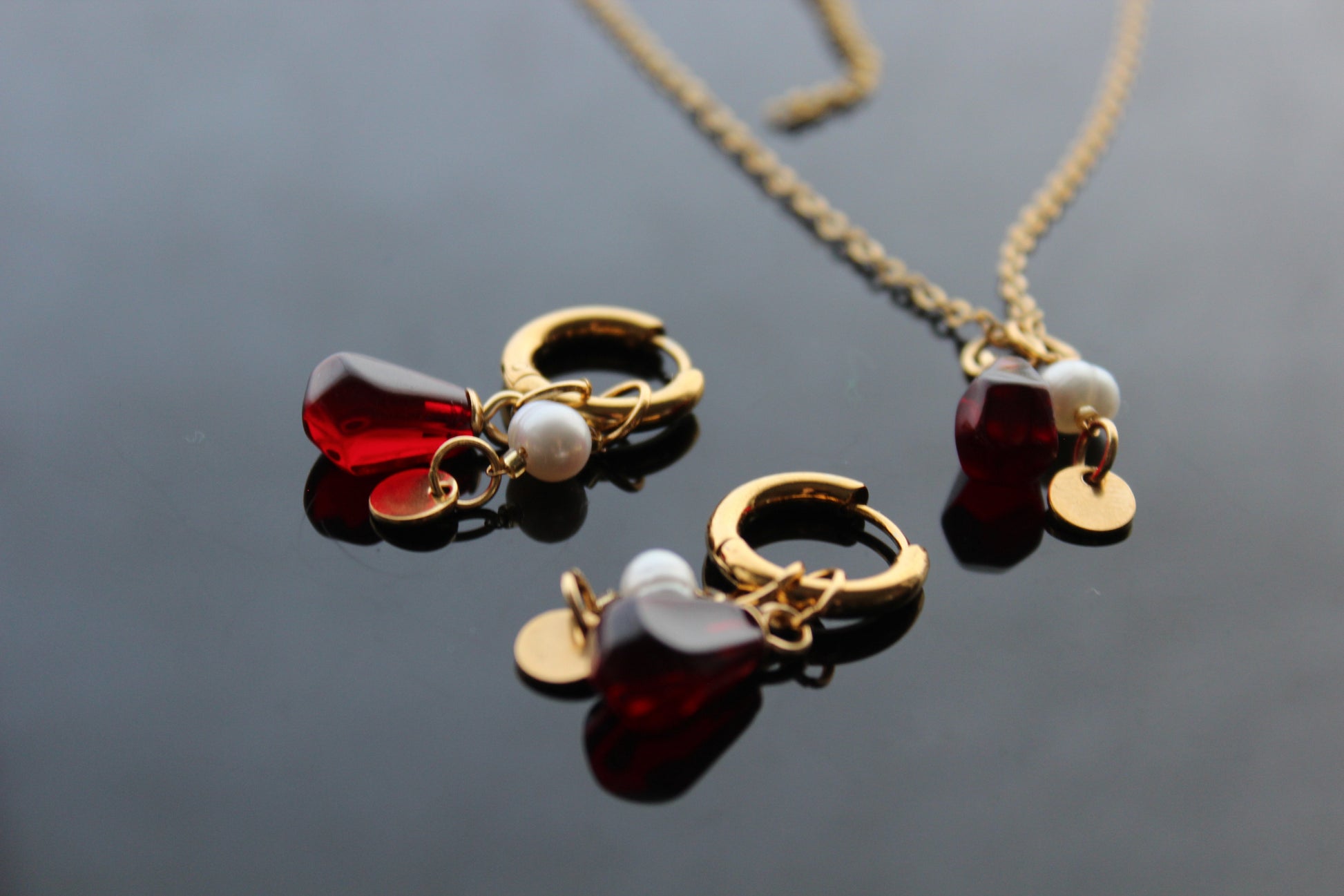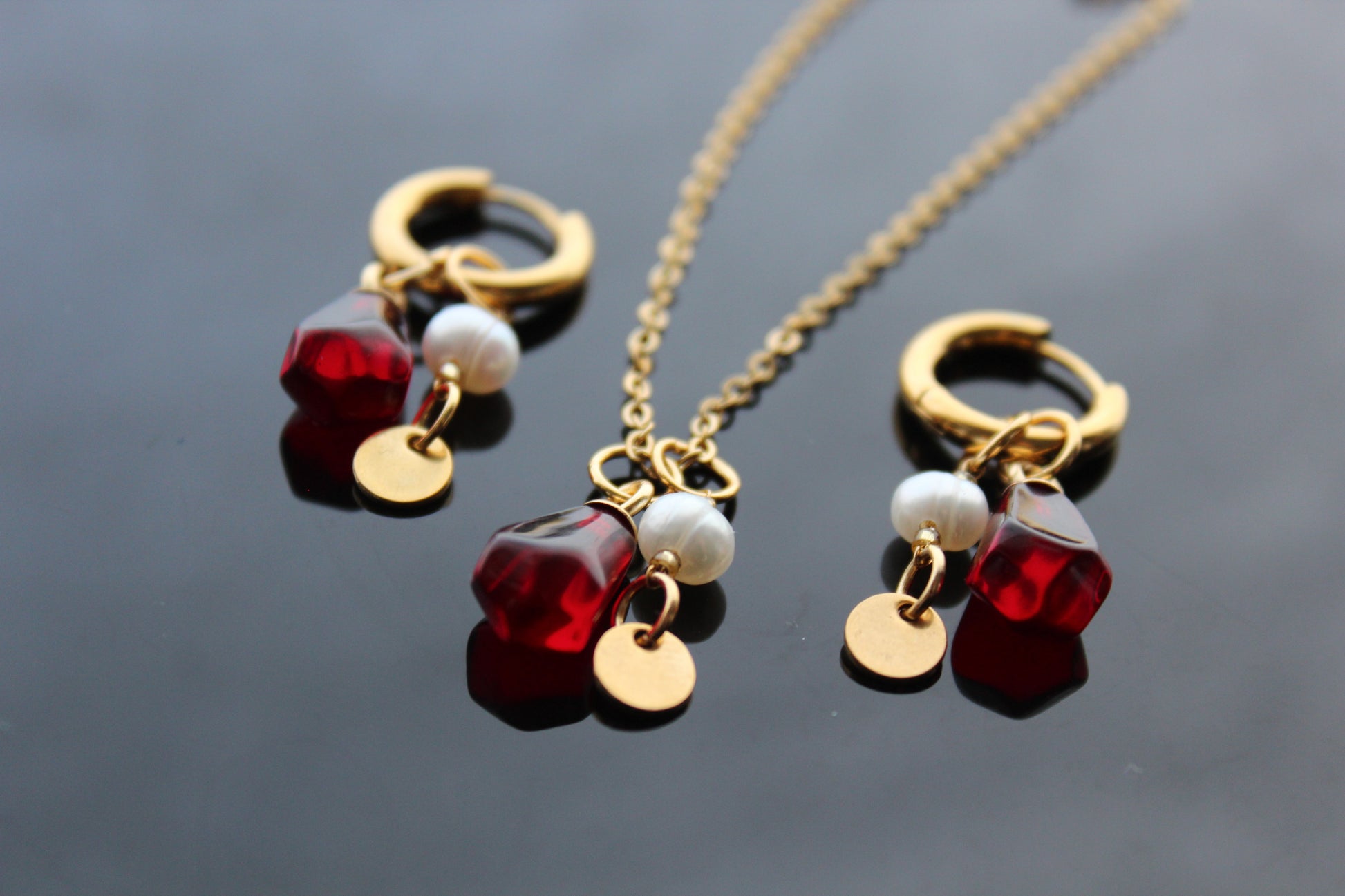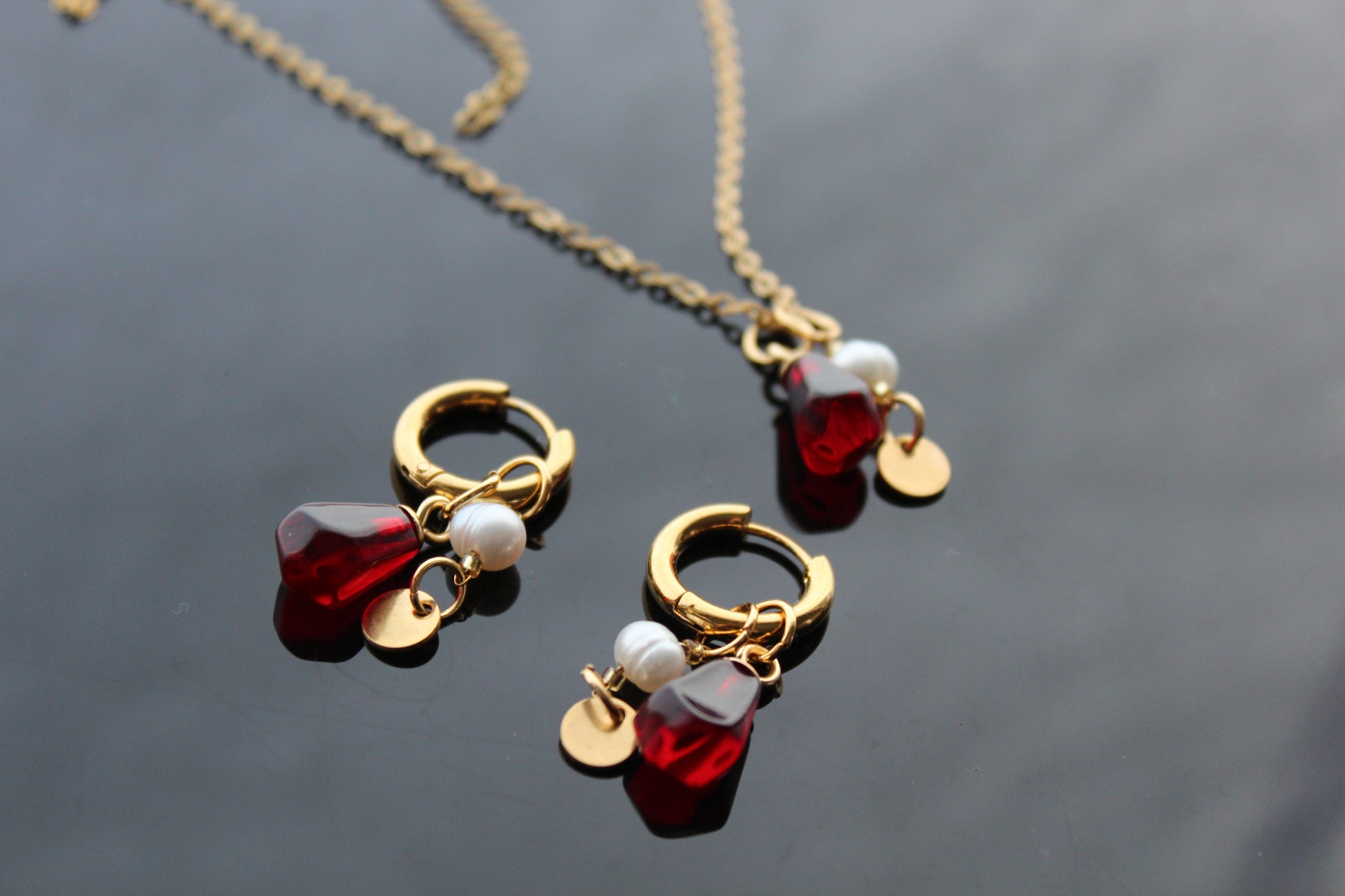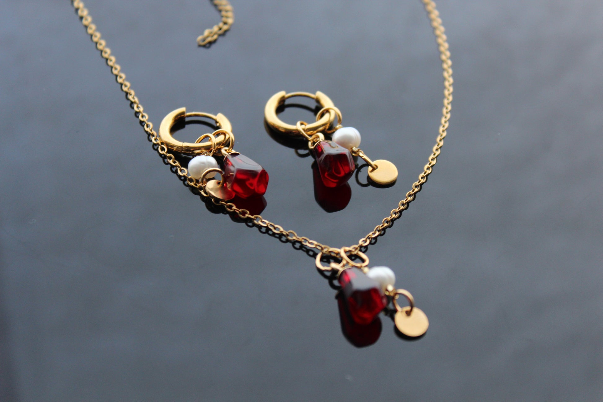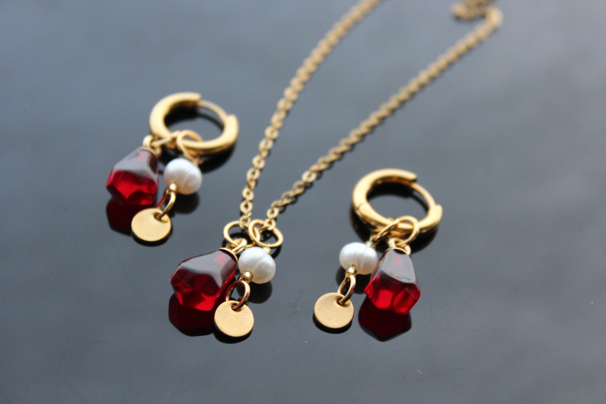 Handmade pomegranate seeds jewelry set with gold plated stainless steel parts and natural perls