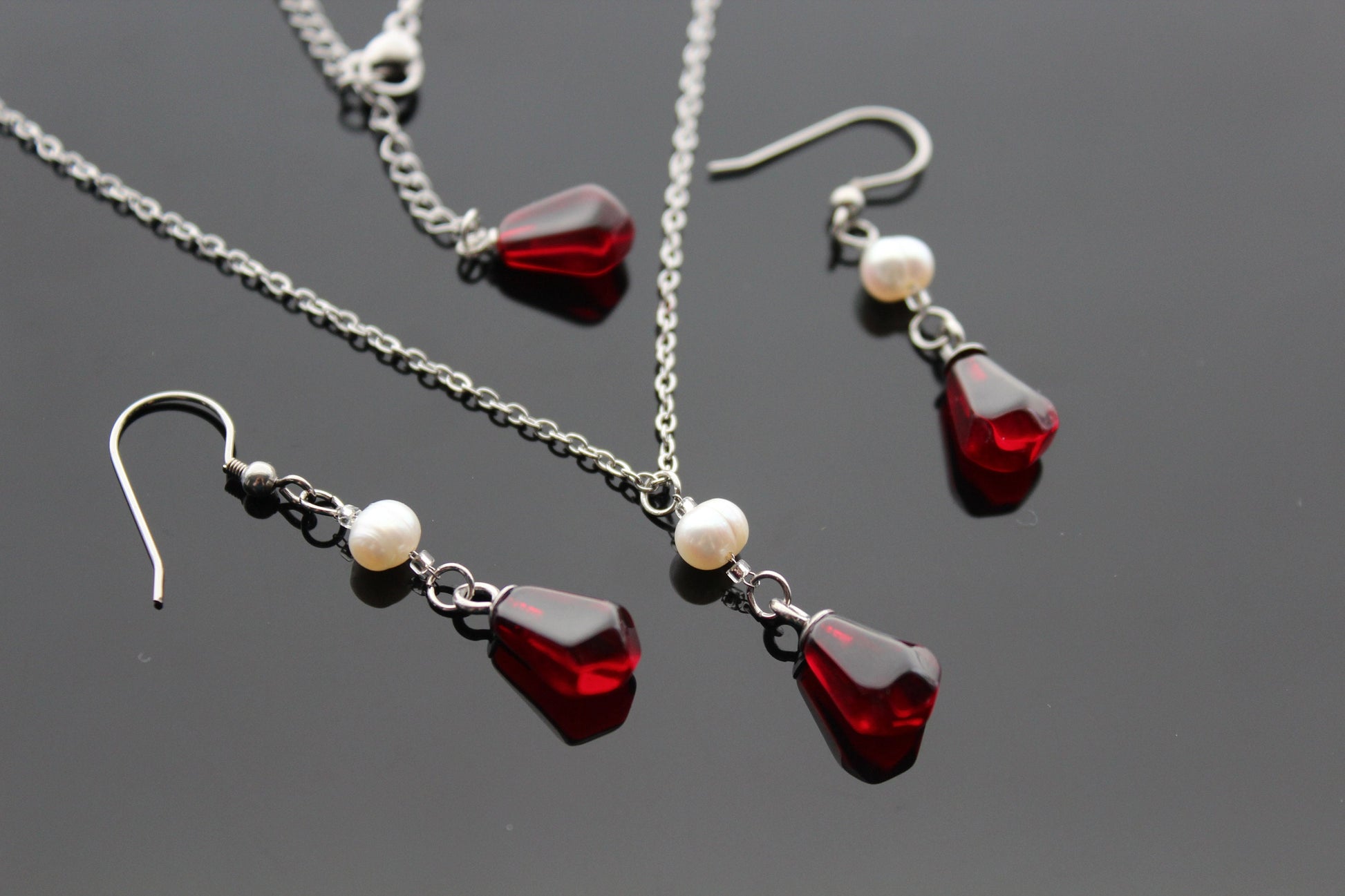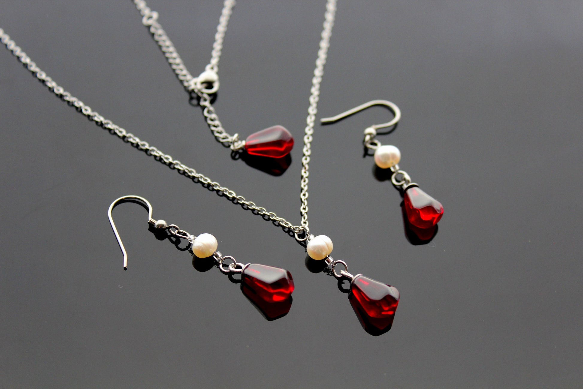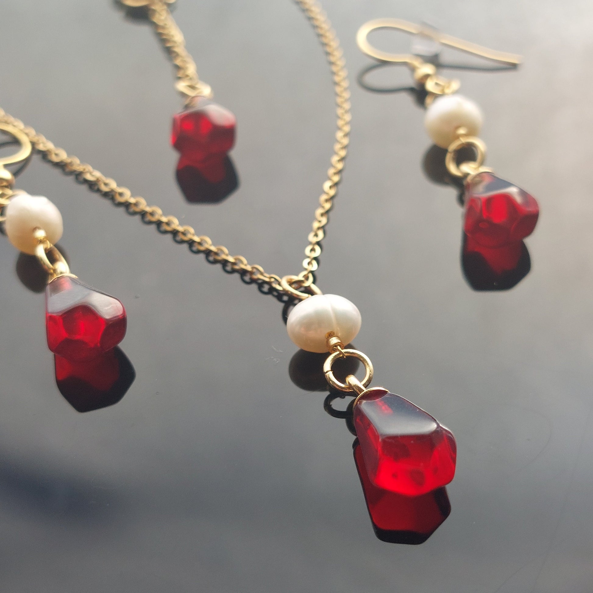 This high-quality handmade jewelry set features a pomegranate design, made of resin and natural pearls with stainless steel accents. In Armenian and Jewish cultures, pomegranates symbolize fertility, love, and abundance. Each mature pomegranate contains 365 seeds, representing one for each day of the year, and they are also seen as a symbol of power.