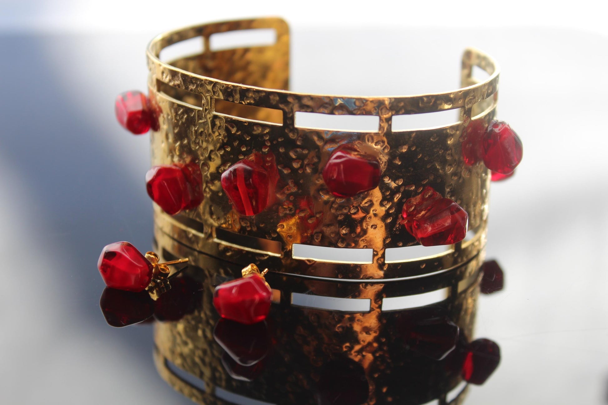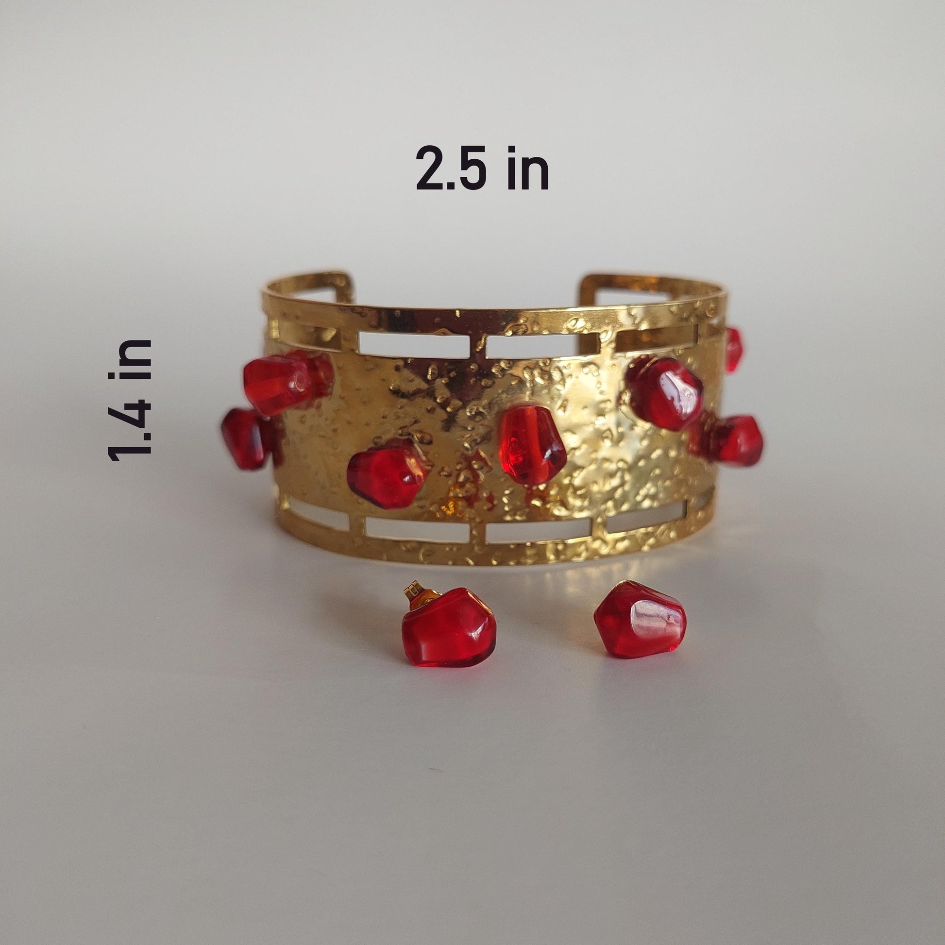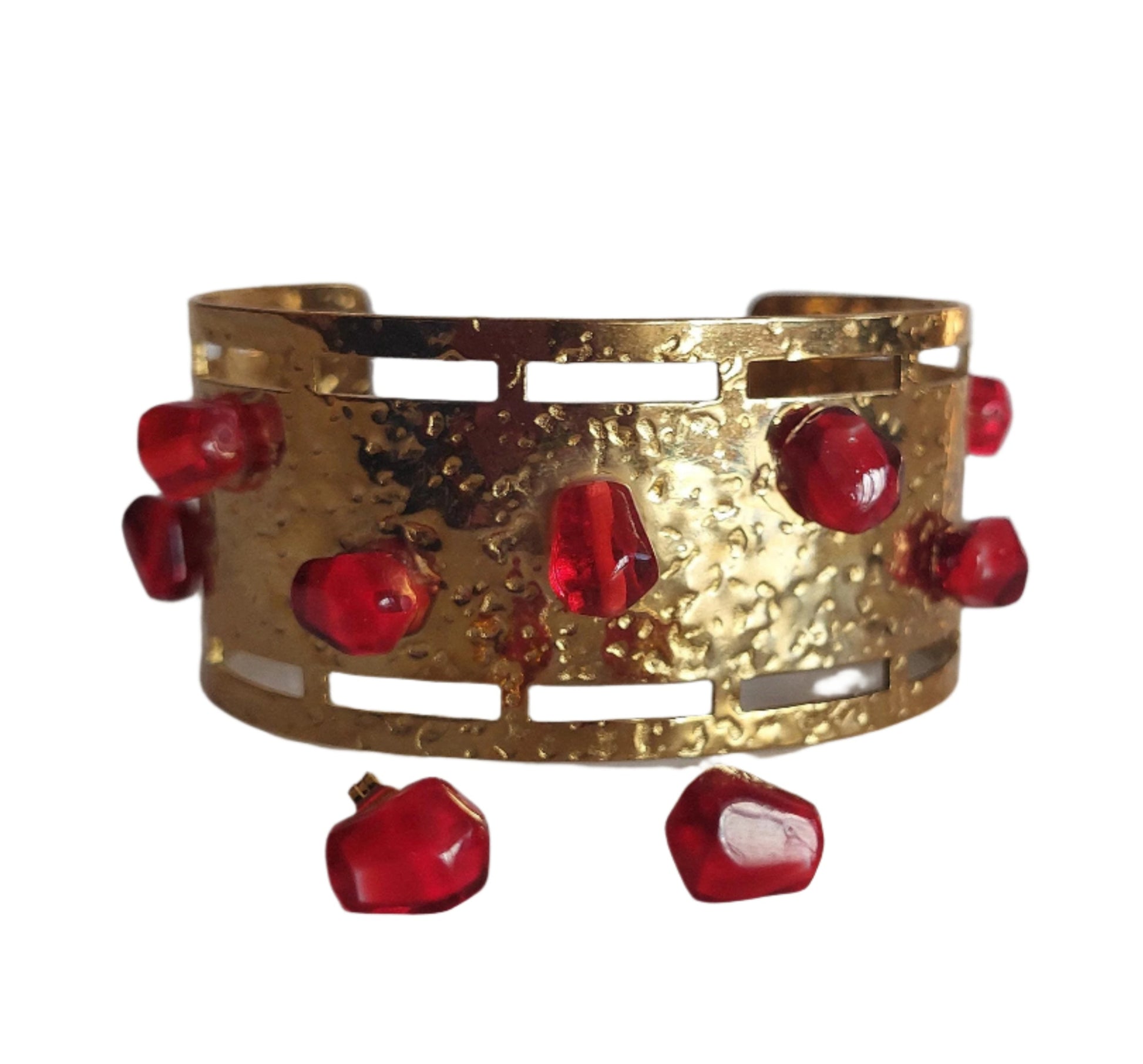 One bracelet showcases vibrant red pomegranate-inspired resin beads.