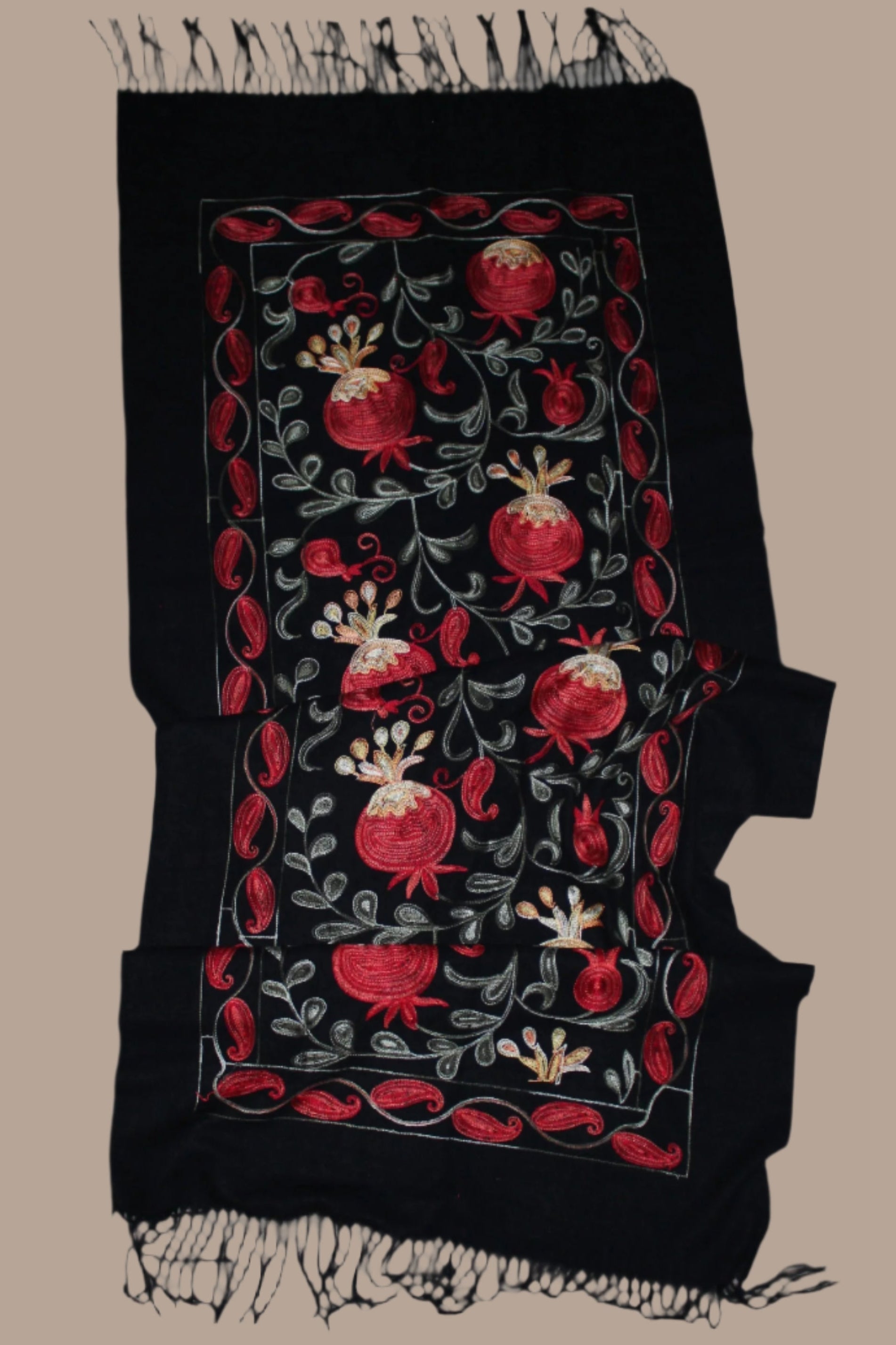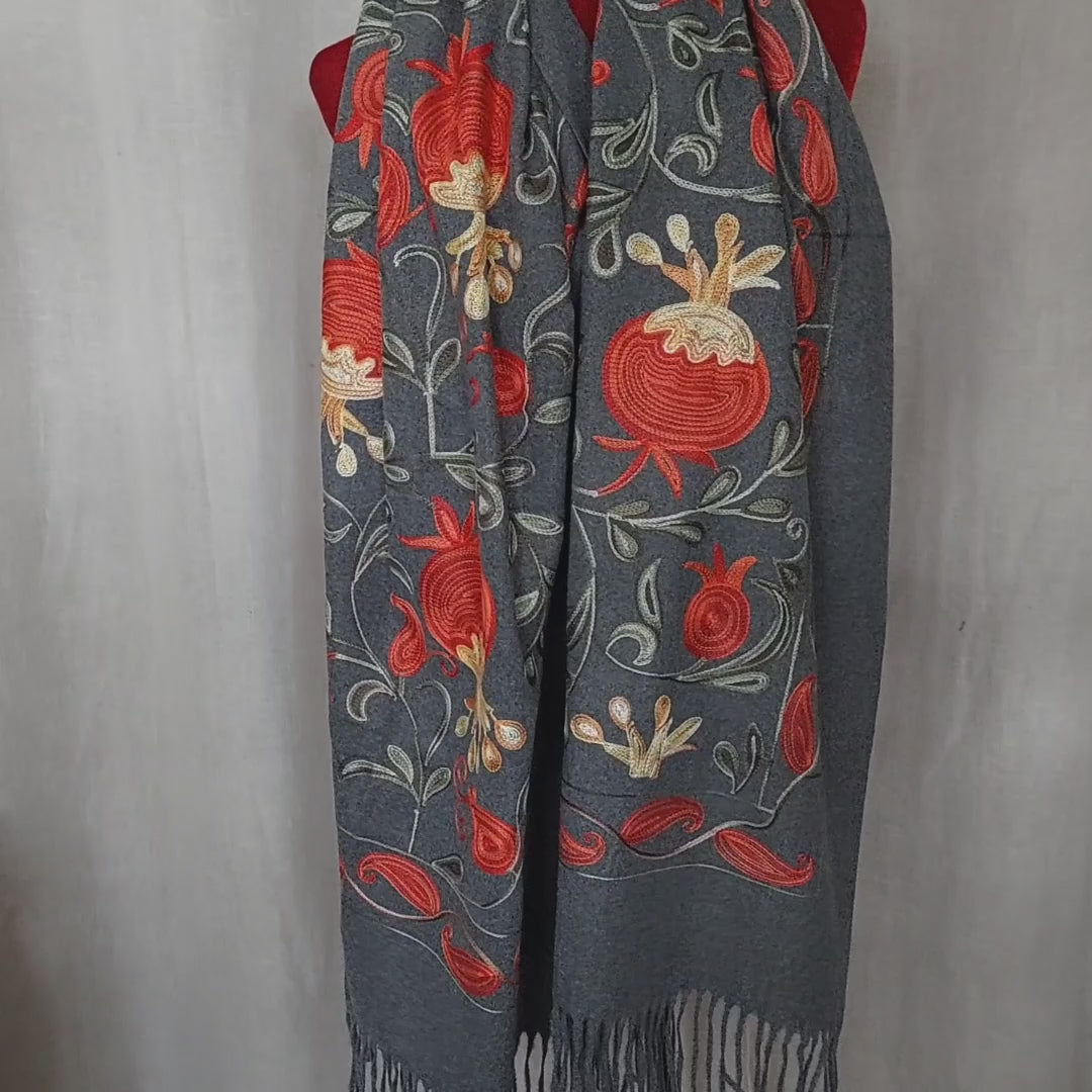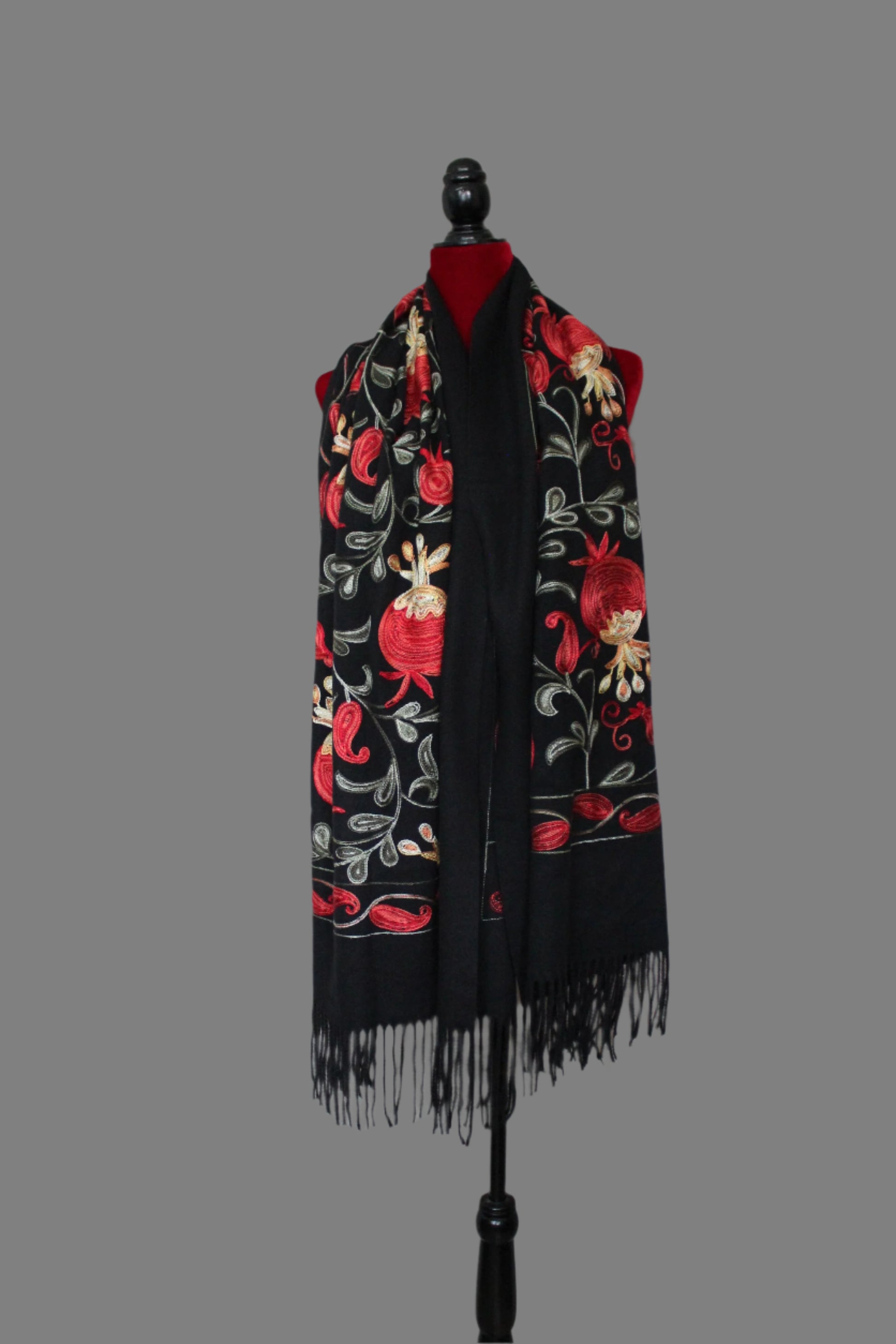Indulge in luxury with our Embroidered Cashmere Scarf. Crafted with soft cashmere, this black and gray scarf is adorned with intricately embroidered pomegranates, symbolizing abundance and prosperity. Stay warm and stylish with this timeless accessory.