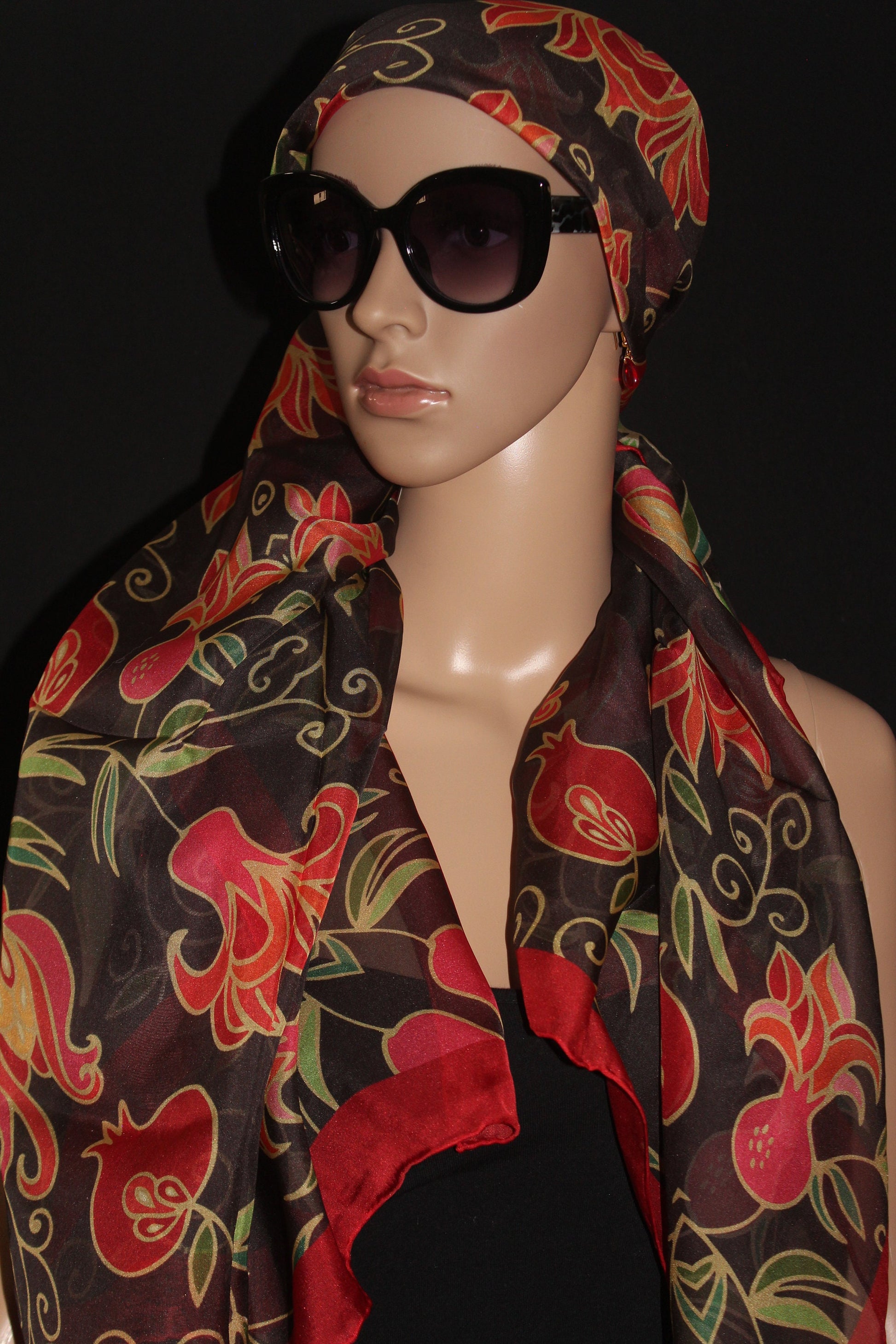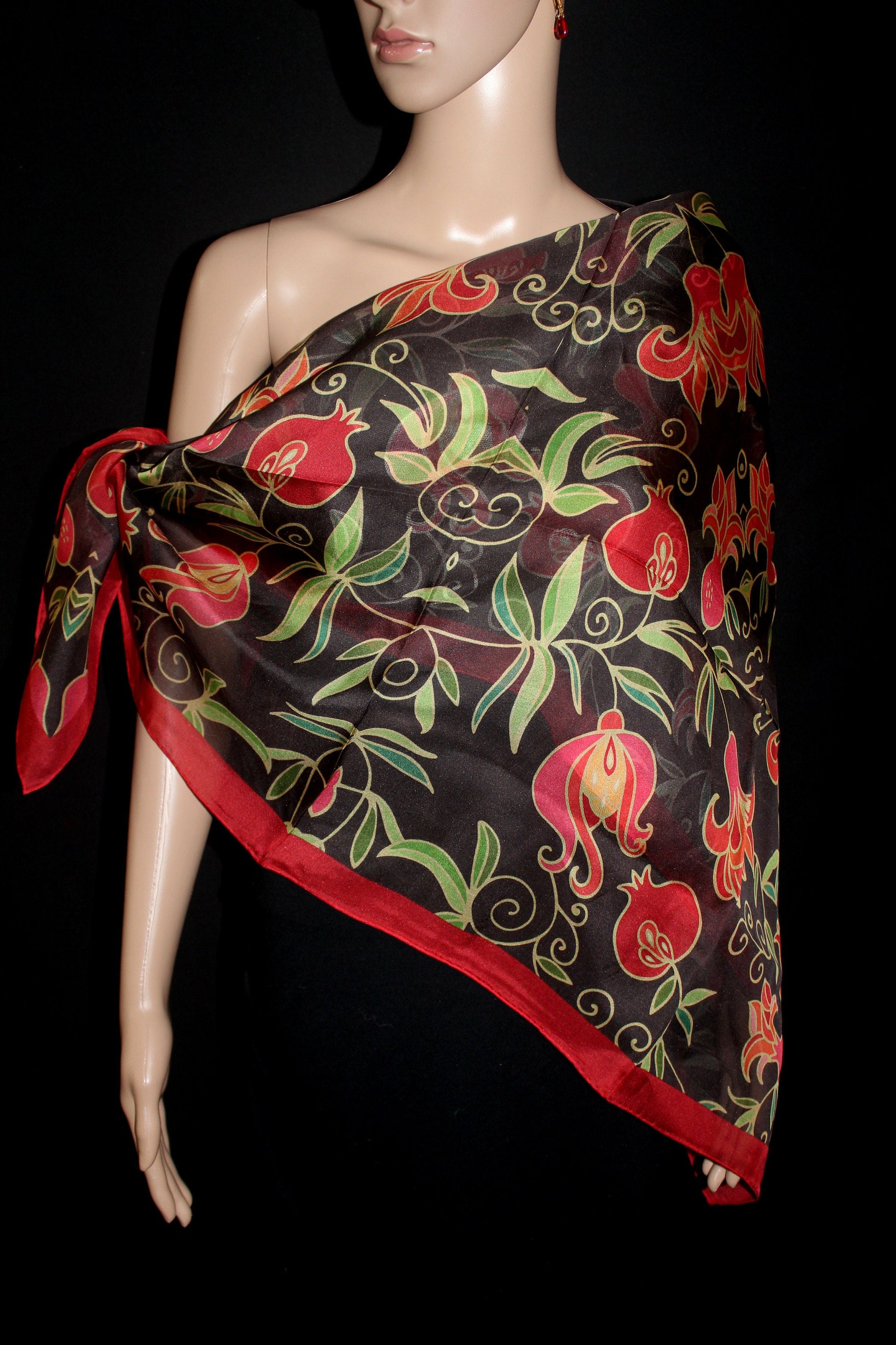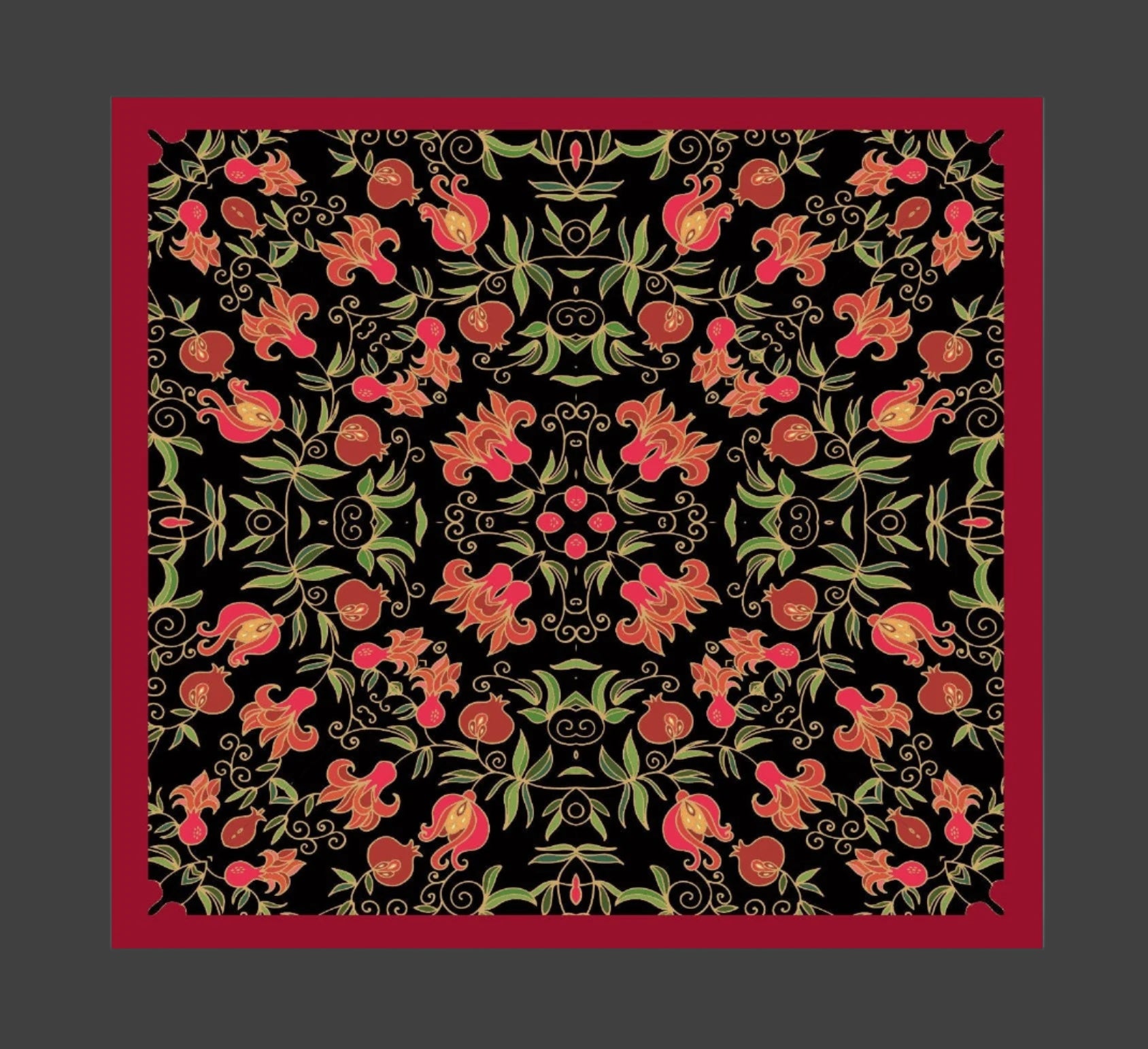 Embrace the allure of the pomegranate with this luxurious silk scarf. The rich symbolism of the fruit, combined with the intricate design, makes this a sophisticated and meaningful accessory