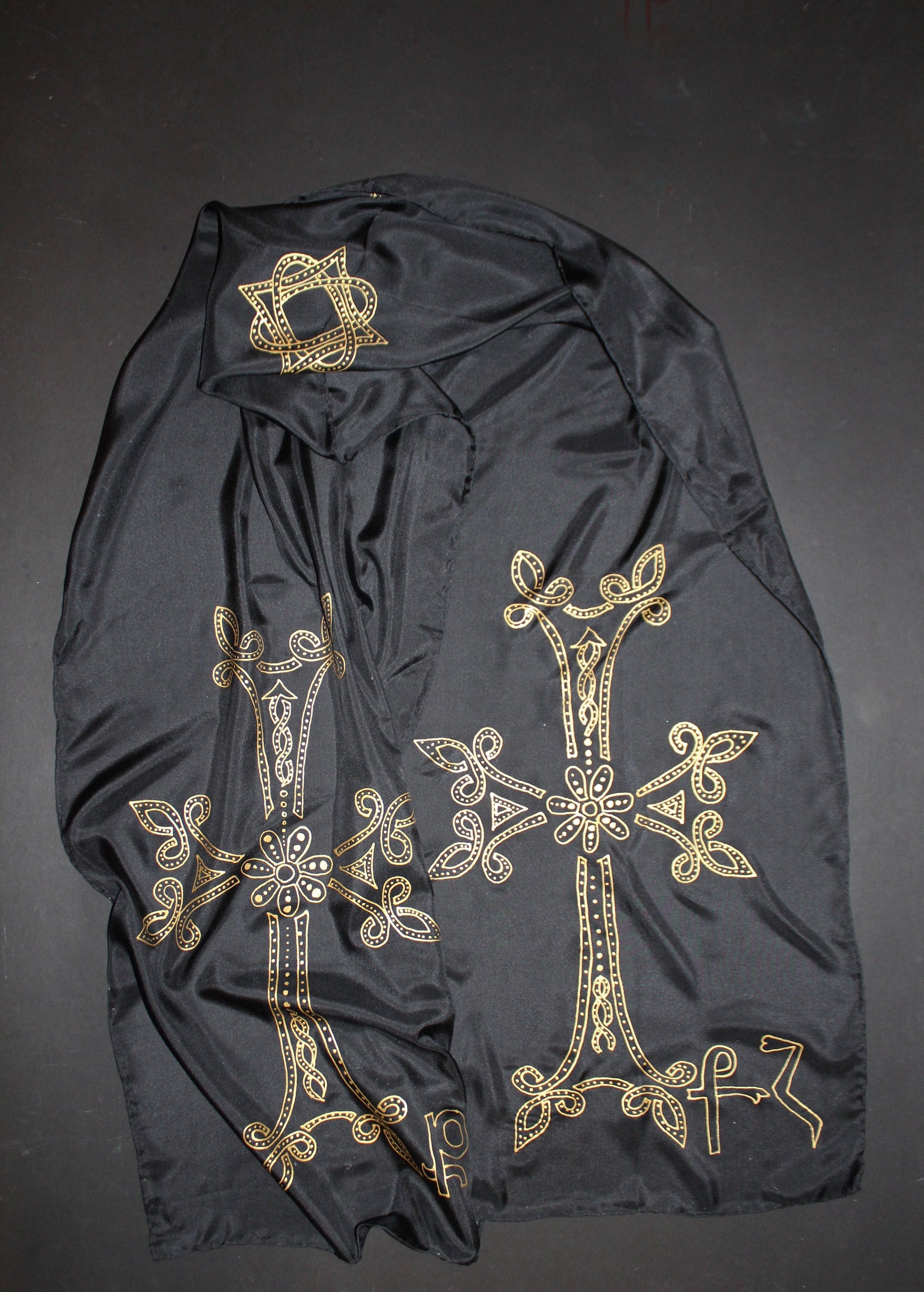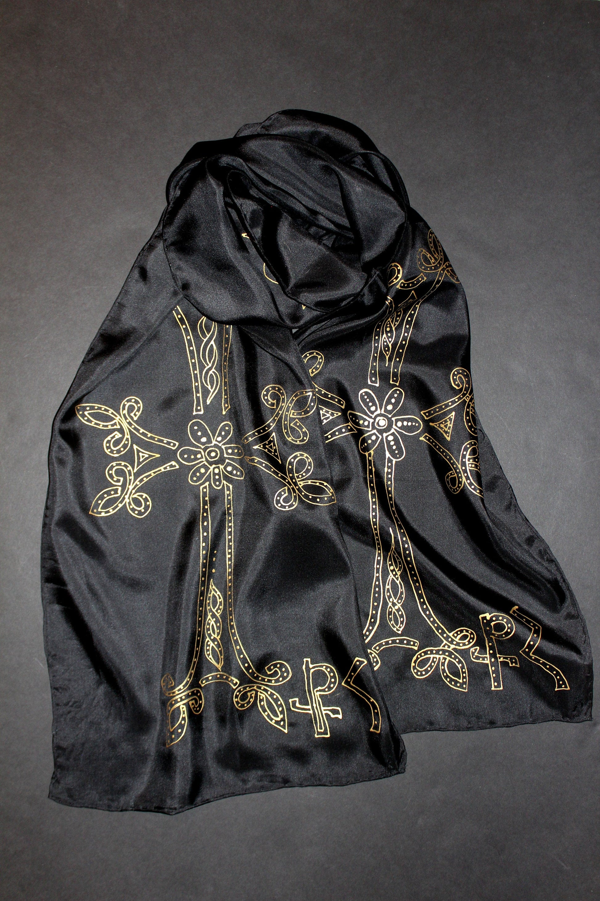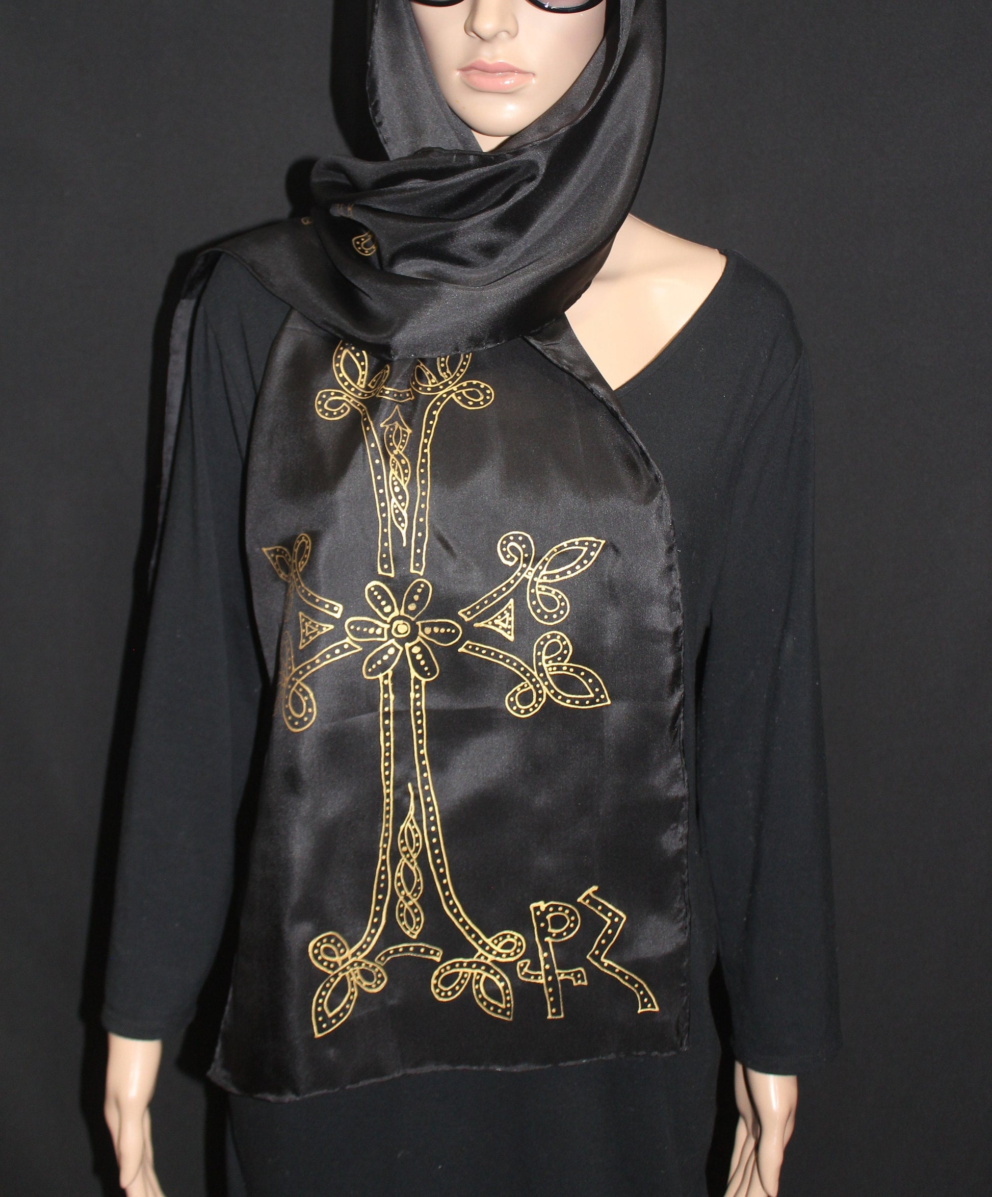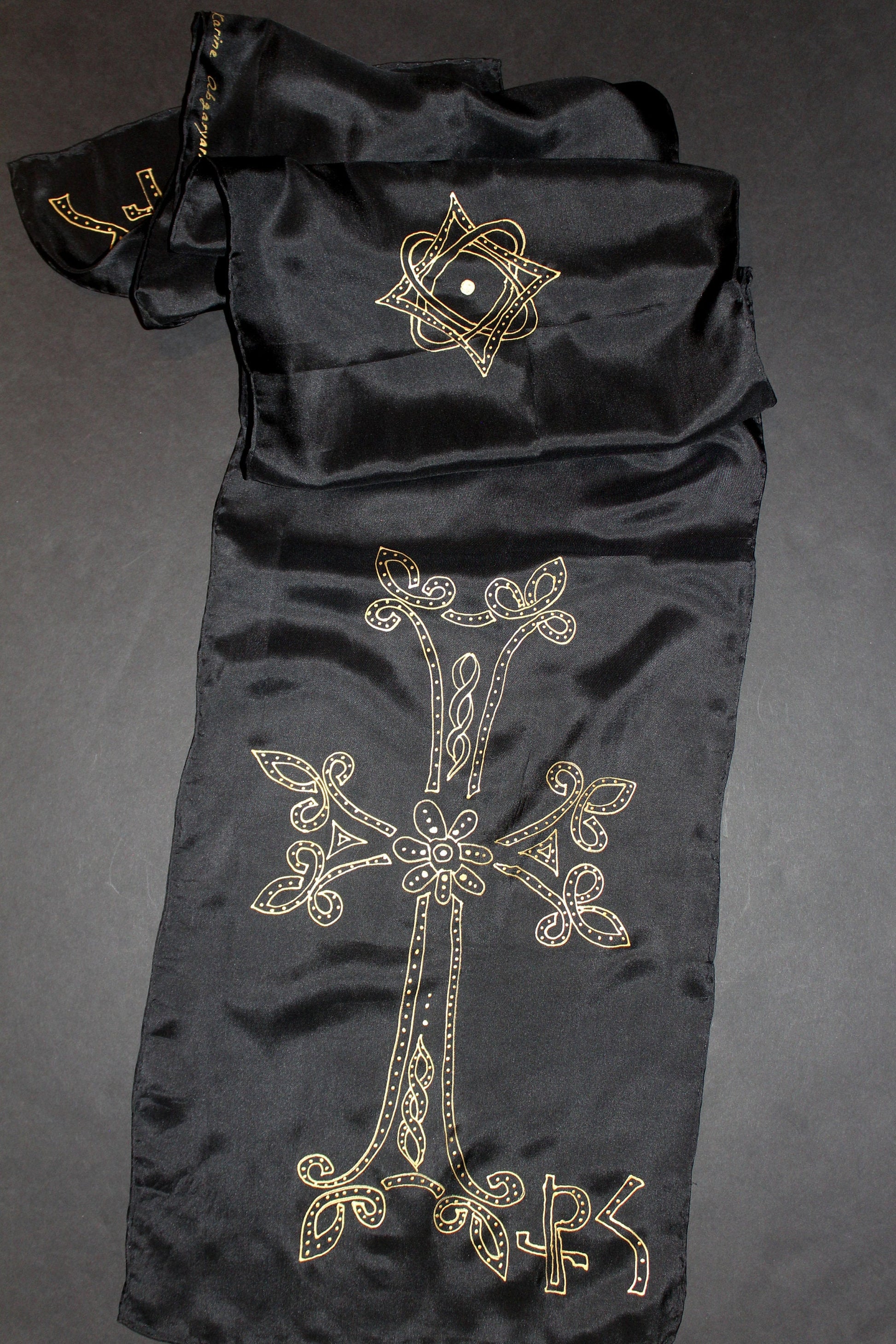 This is Armenian Cross hand-painted silk scarf. The scarf is predominantly black with gold-colored Armenian crosses on it. The scarf is made of silk, as it has a smooth and lustrous appearance.