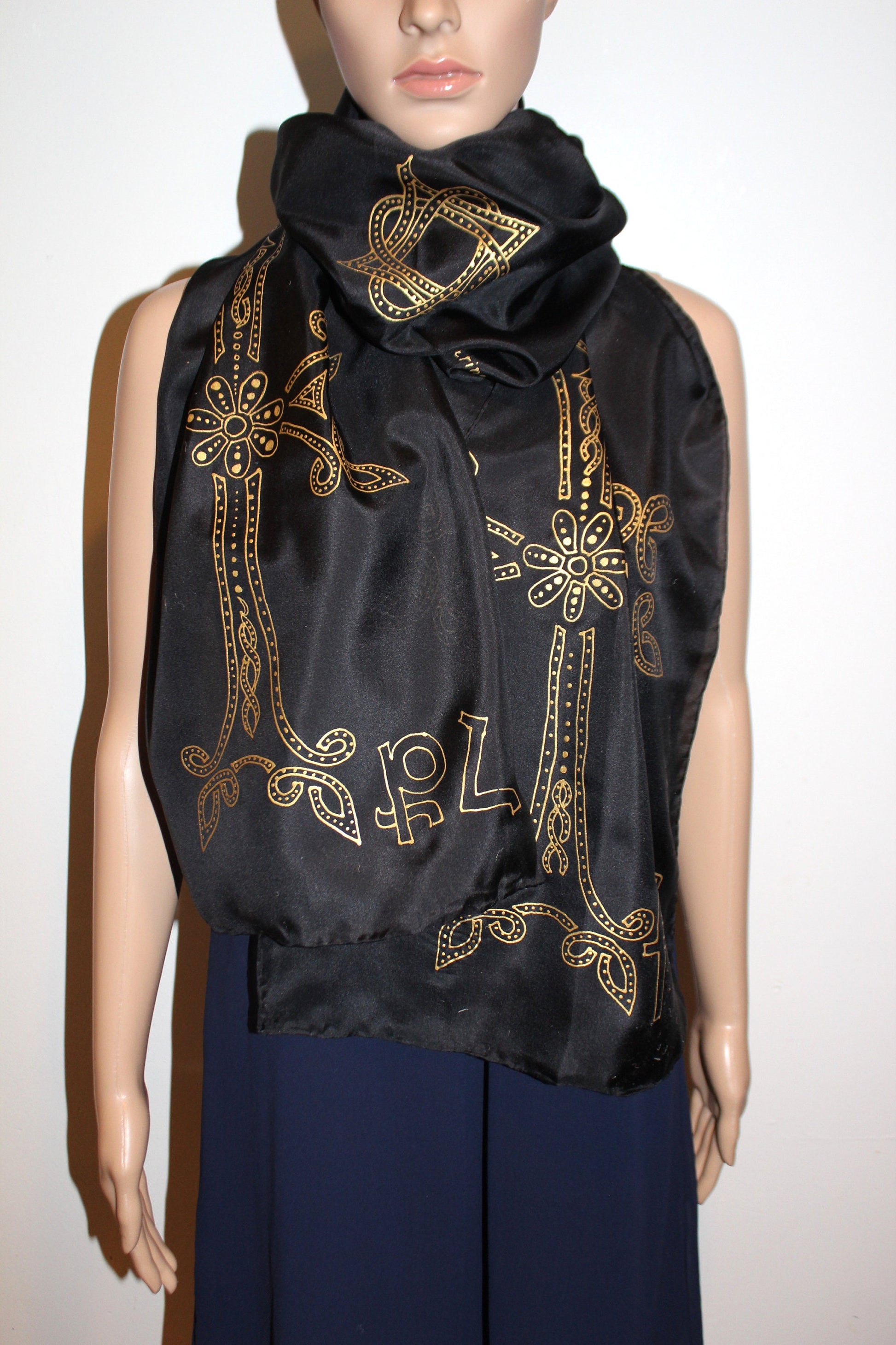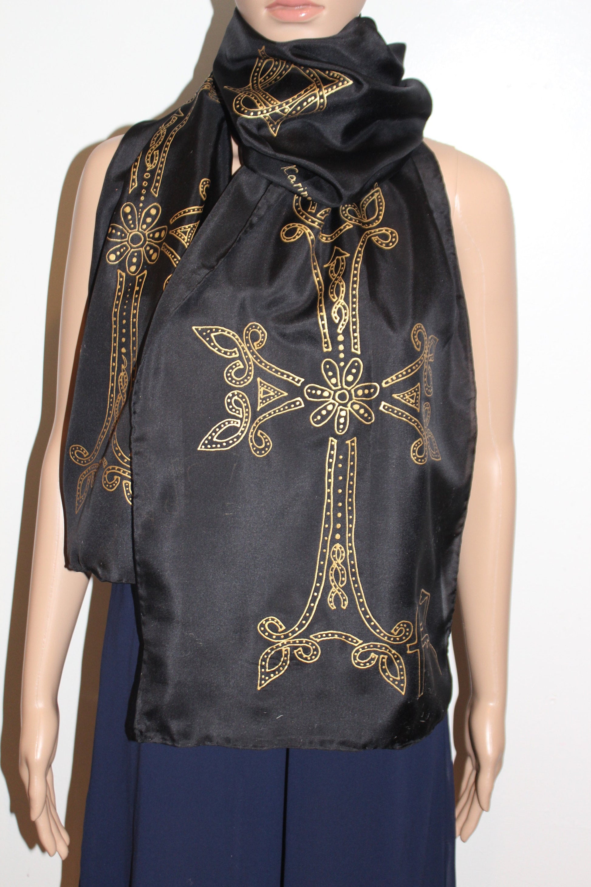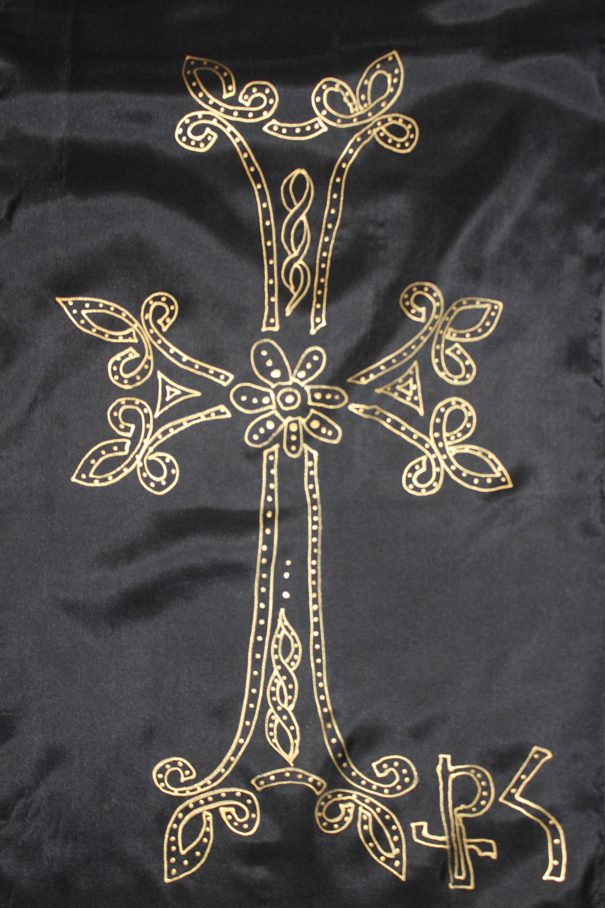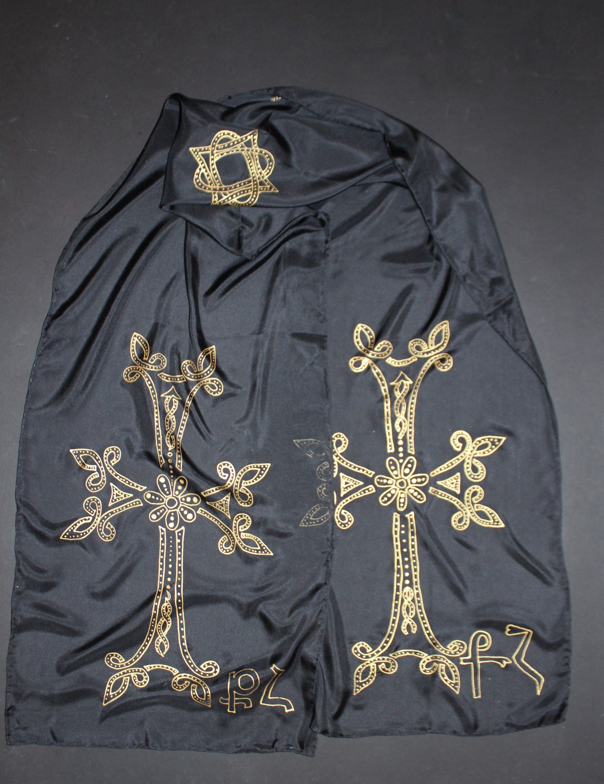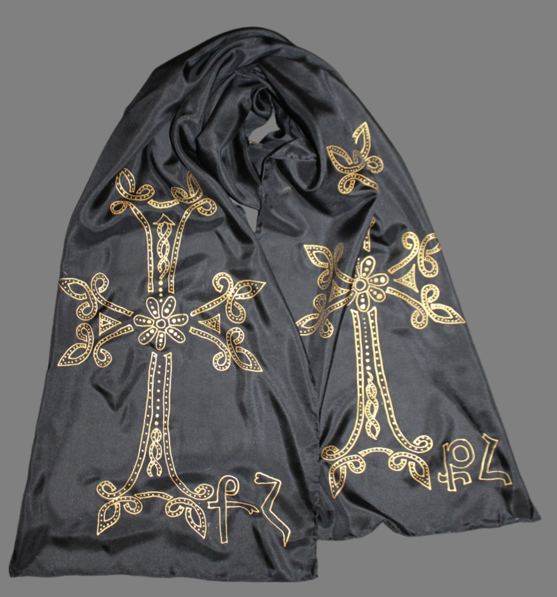 This is Armenian Cross hand-painted silk scarf. The scarf is predominantly black with gold-colored Armenian crosses on it. The scarf is made of silk, as it has a smooth and lustrous appearance.