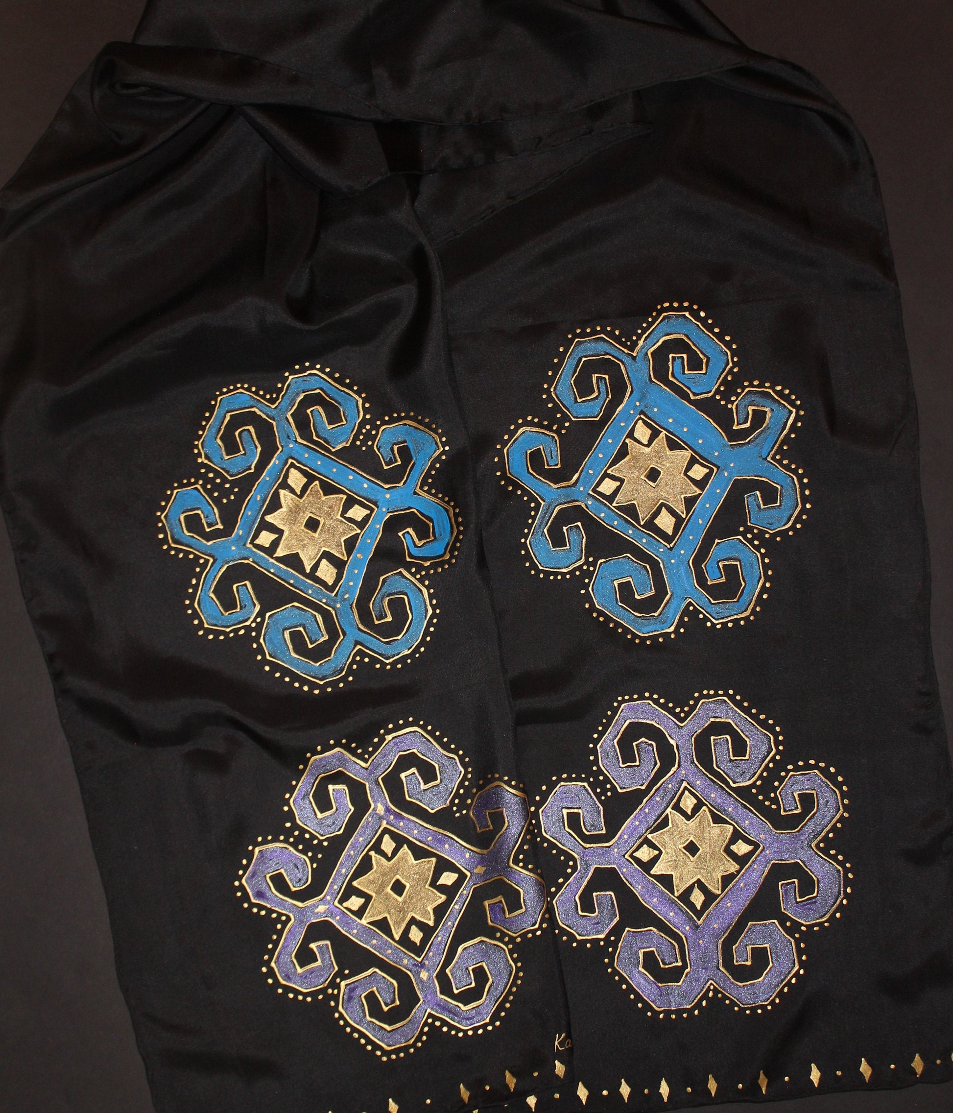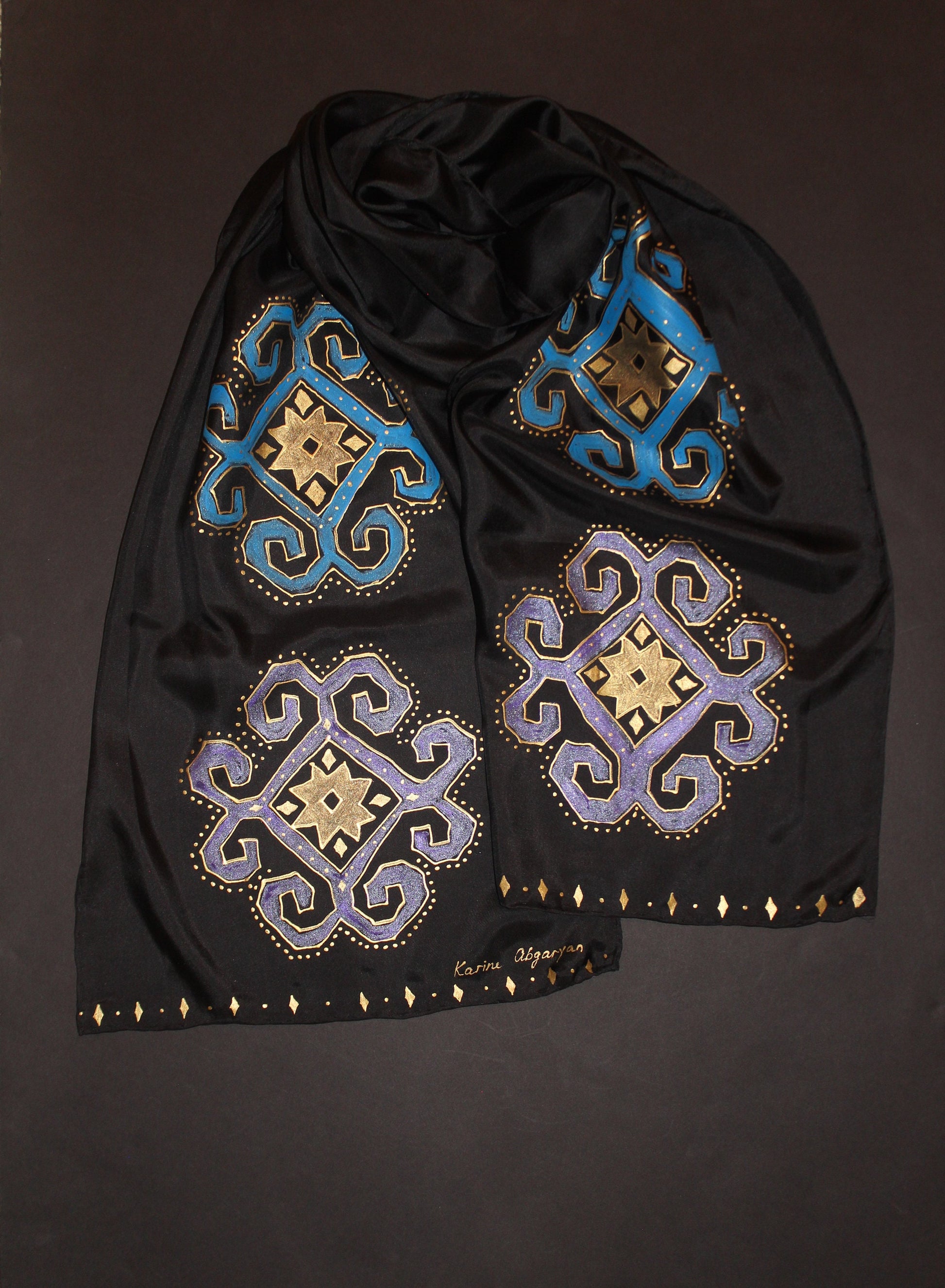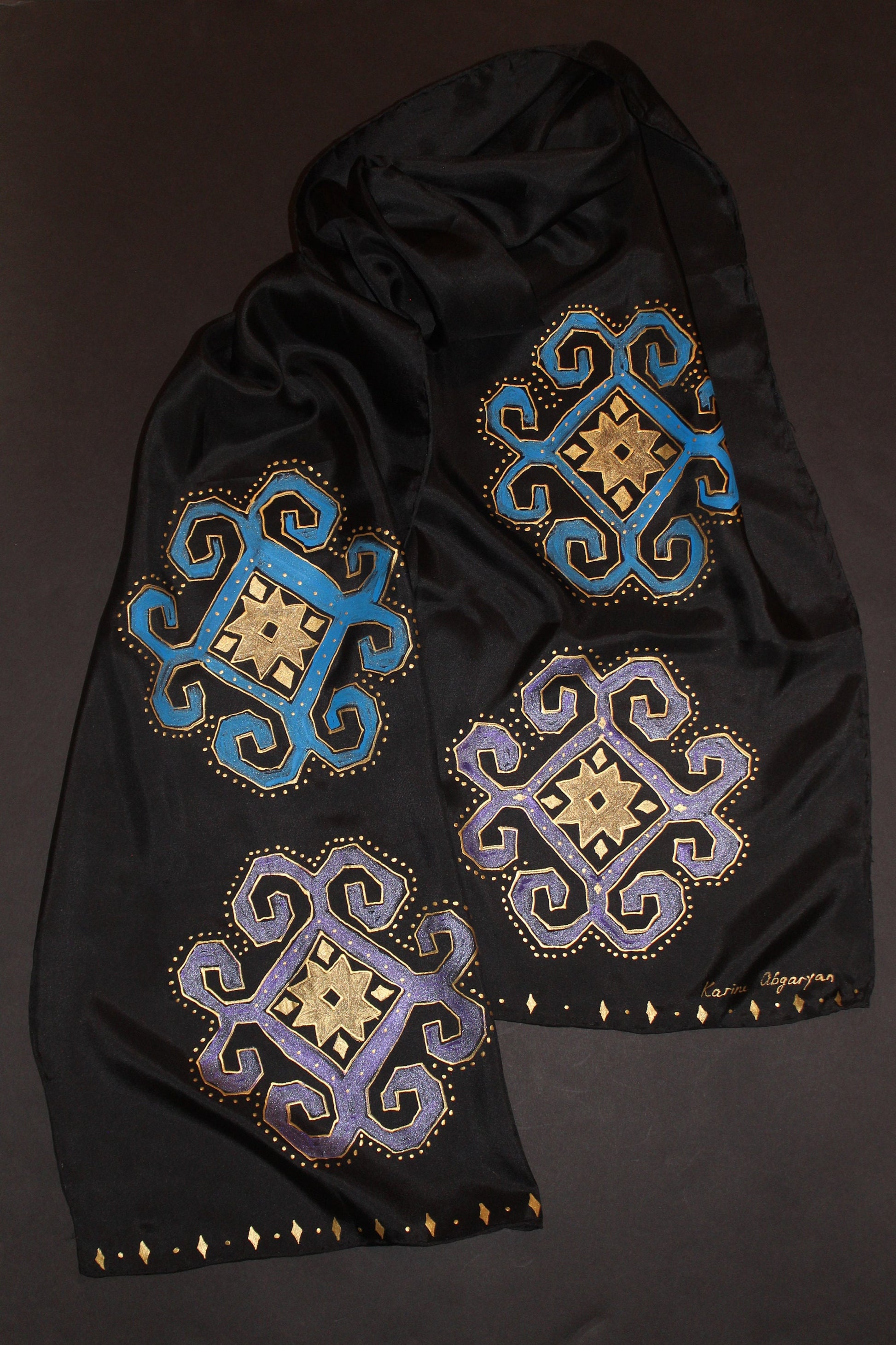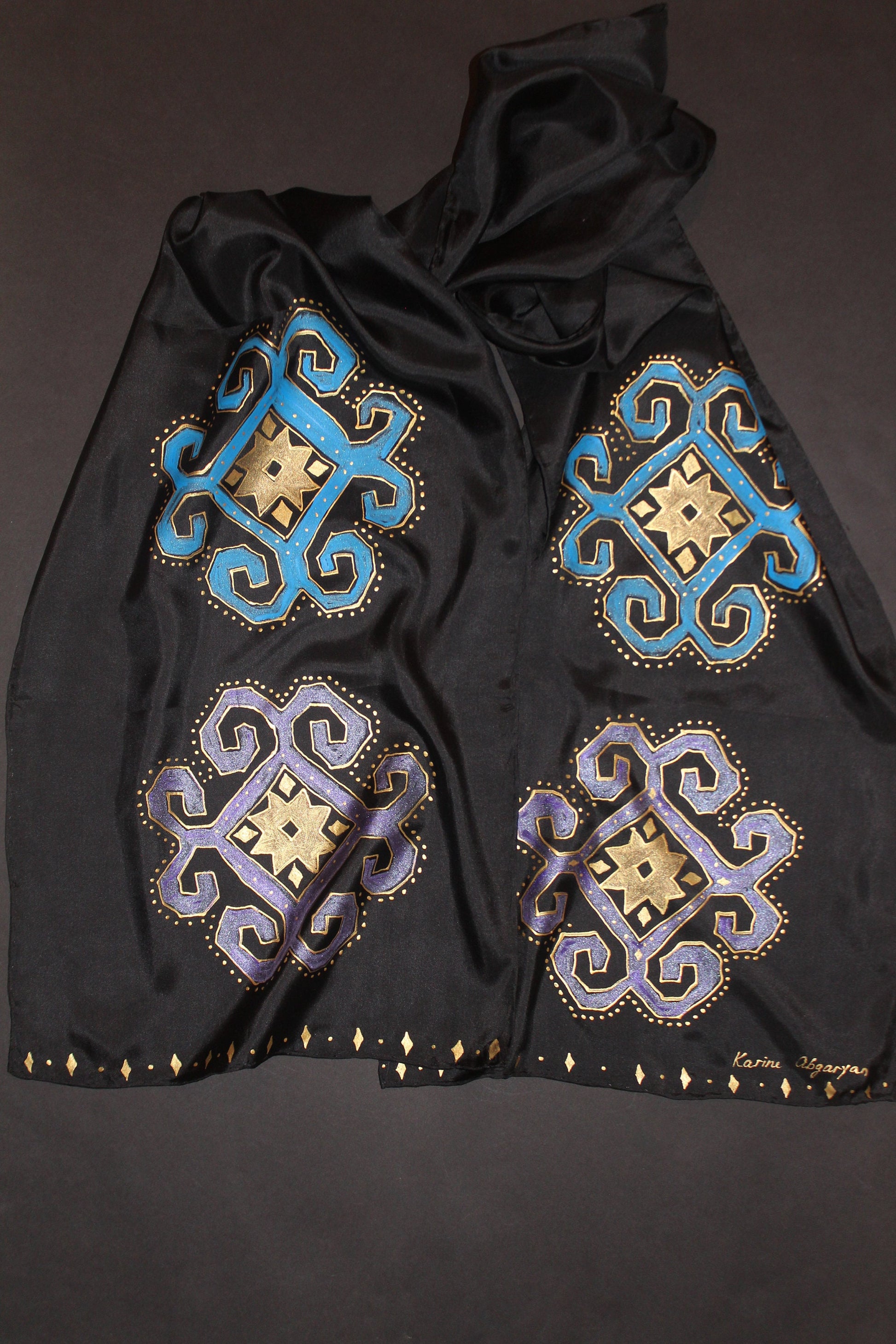 This exquisite scarf features intricate Armenian ornaments meticulously painted onto a luxurious black silk background. The vibrant colors and intricate details create a captivating piece of wearable art that celebrates Armenian culture and tradition.
