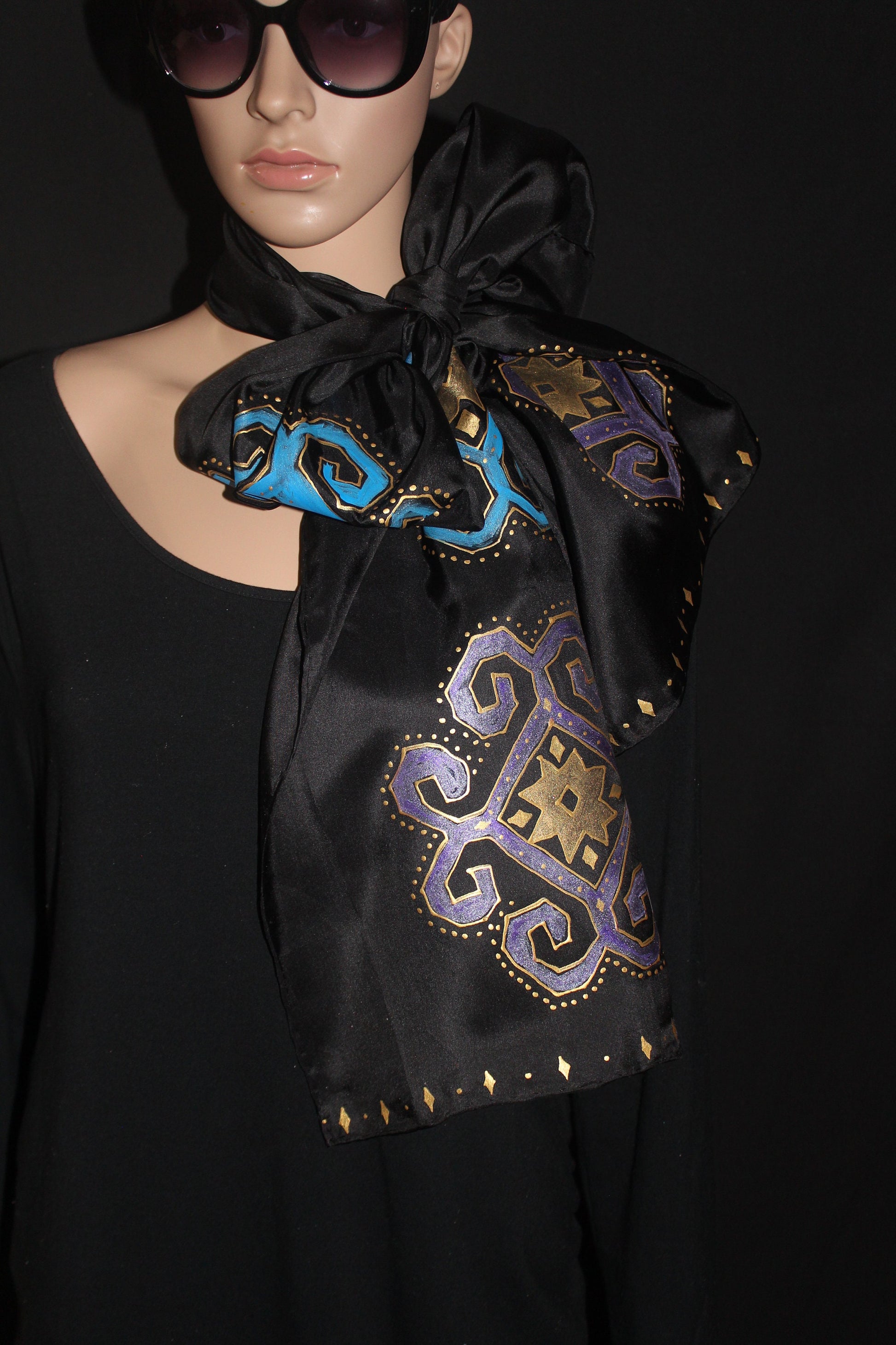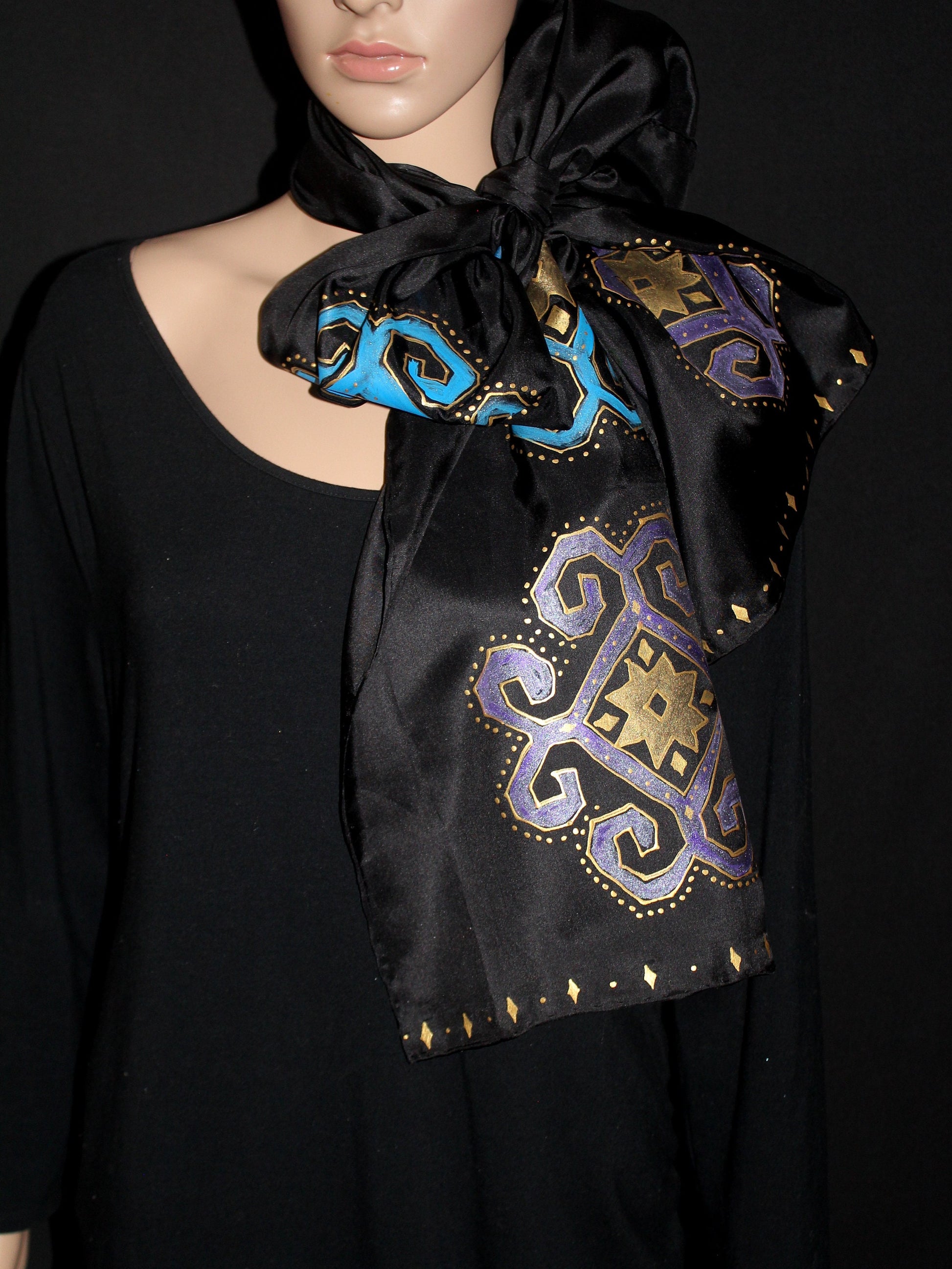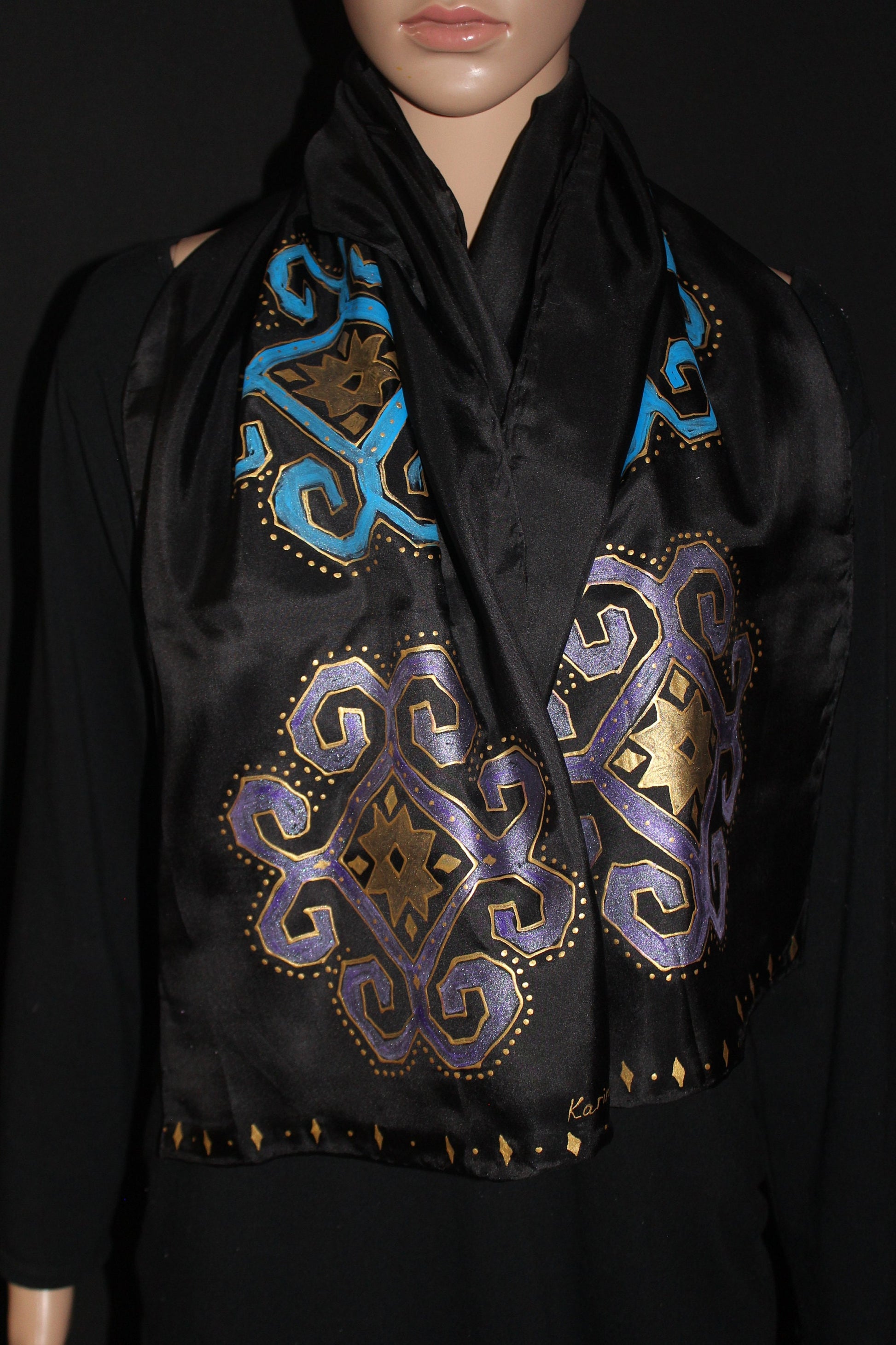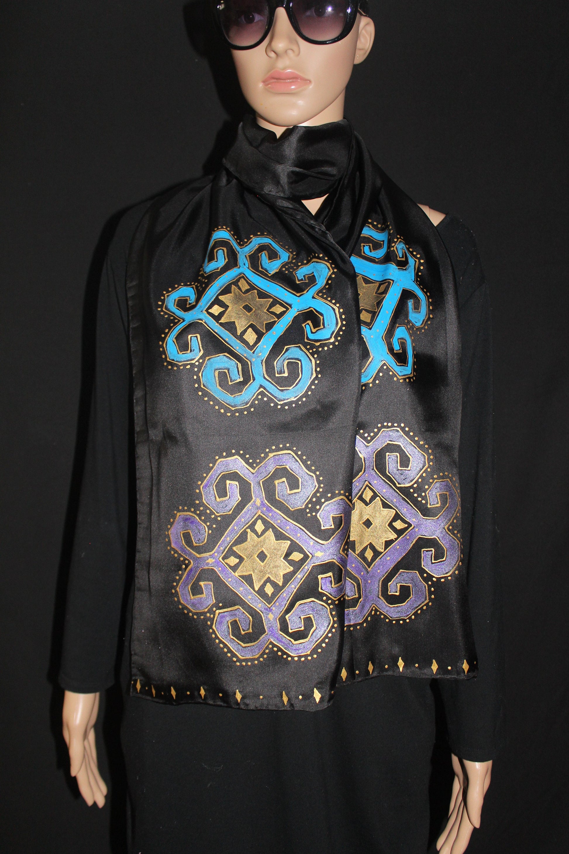 This exquisite scarf features intricate Armenian ornaments meticulously painted onto a luxurious black silk background. The vibrant colors and intricate details create a captivating piece of wearable art that celebrates Armenian culture and tradition.