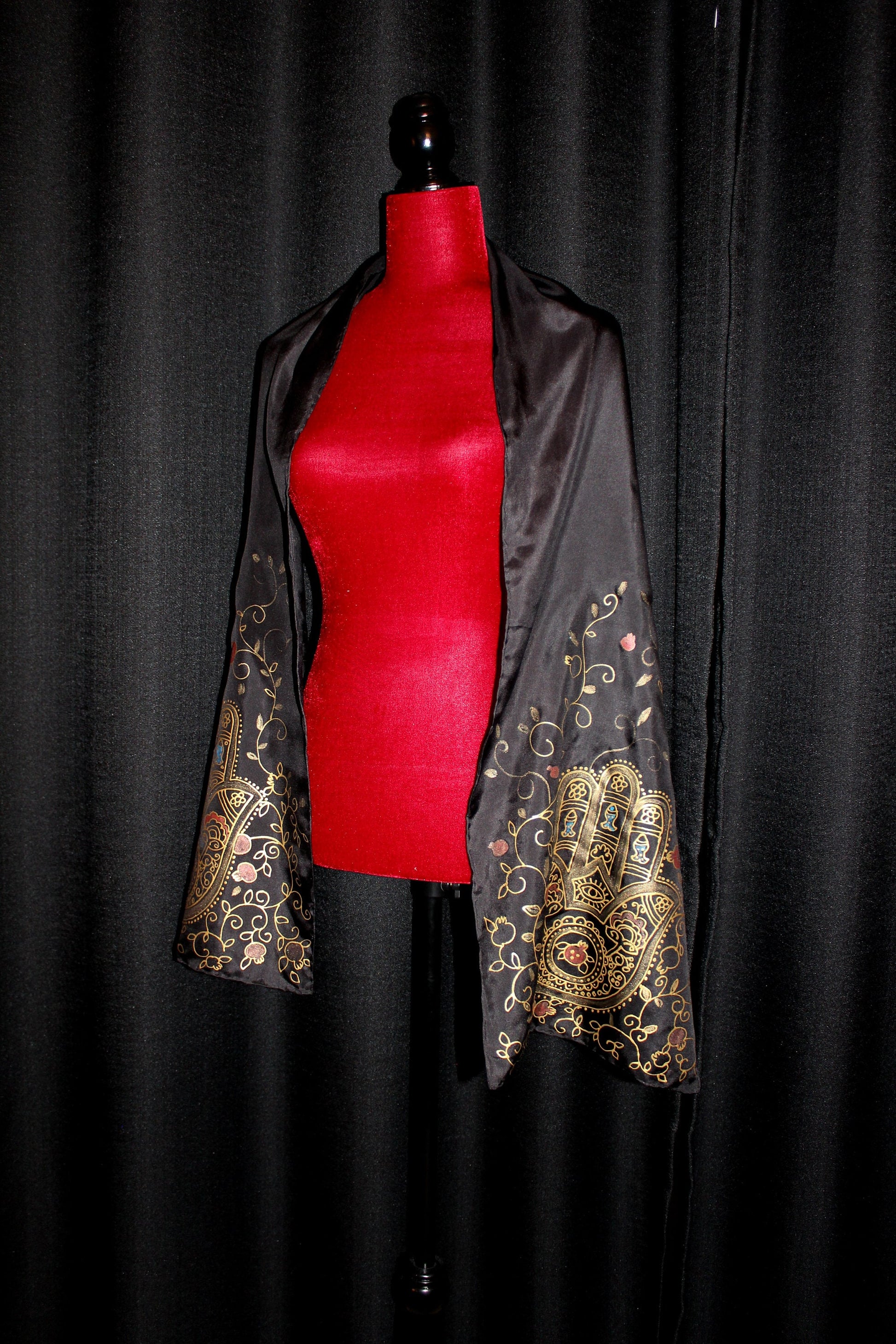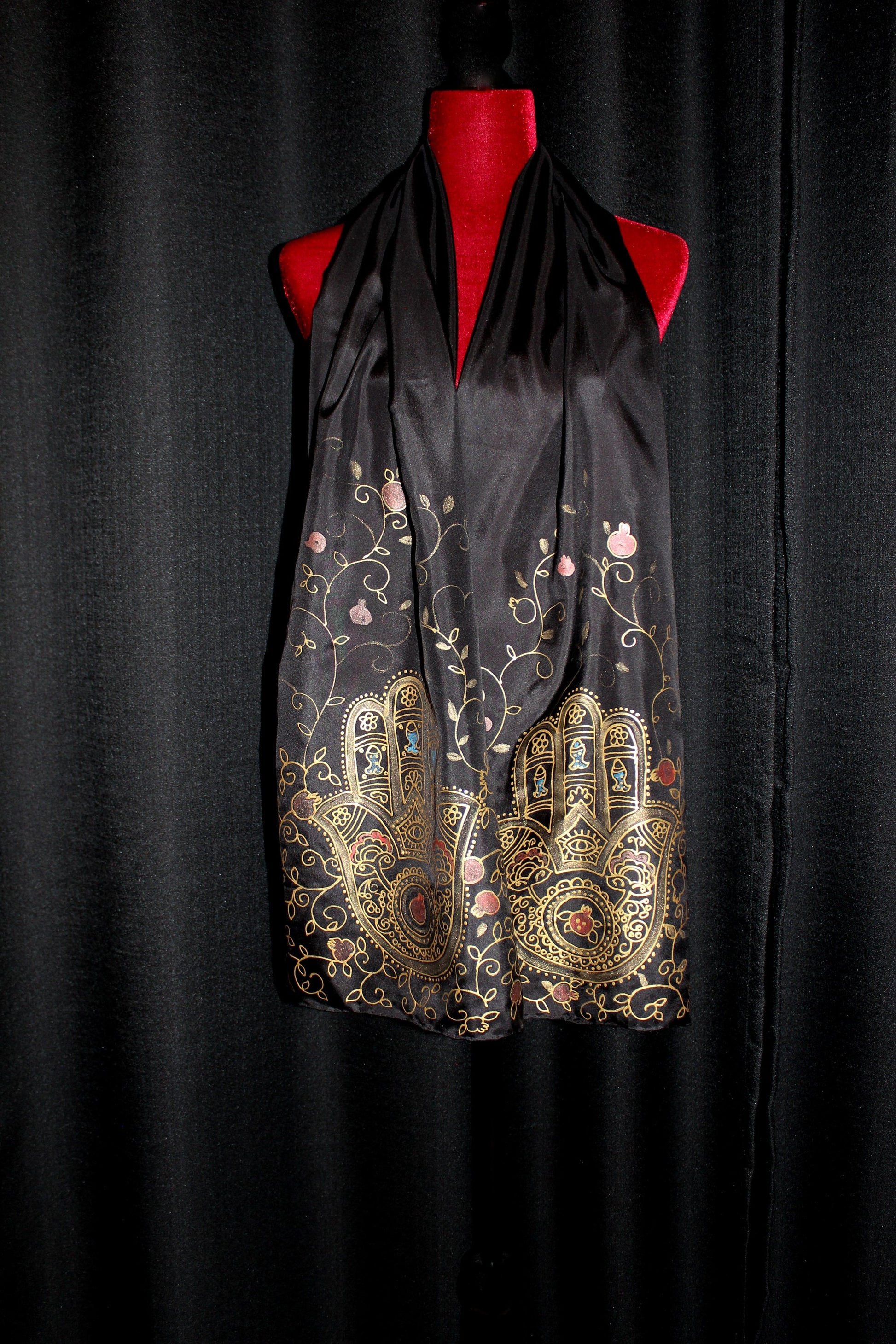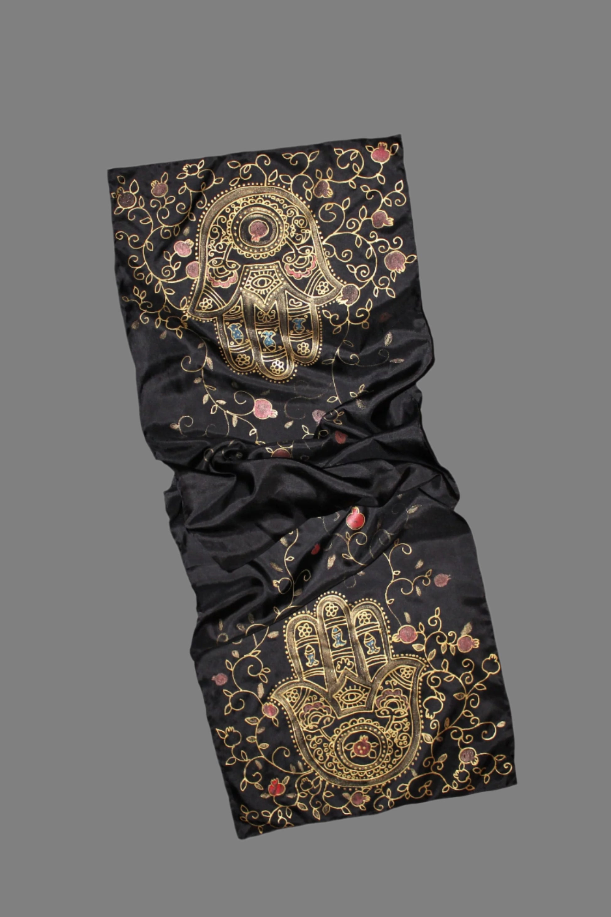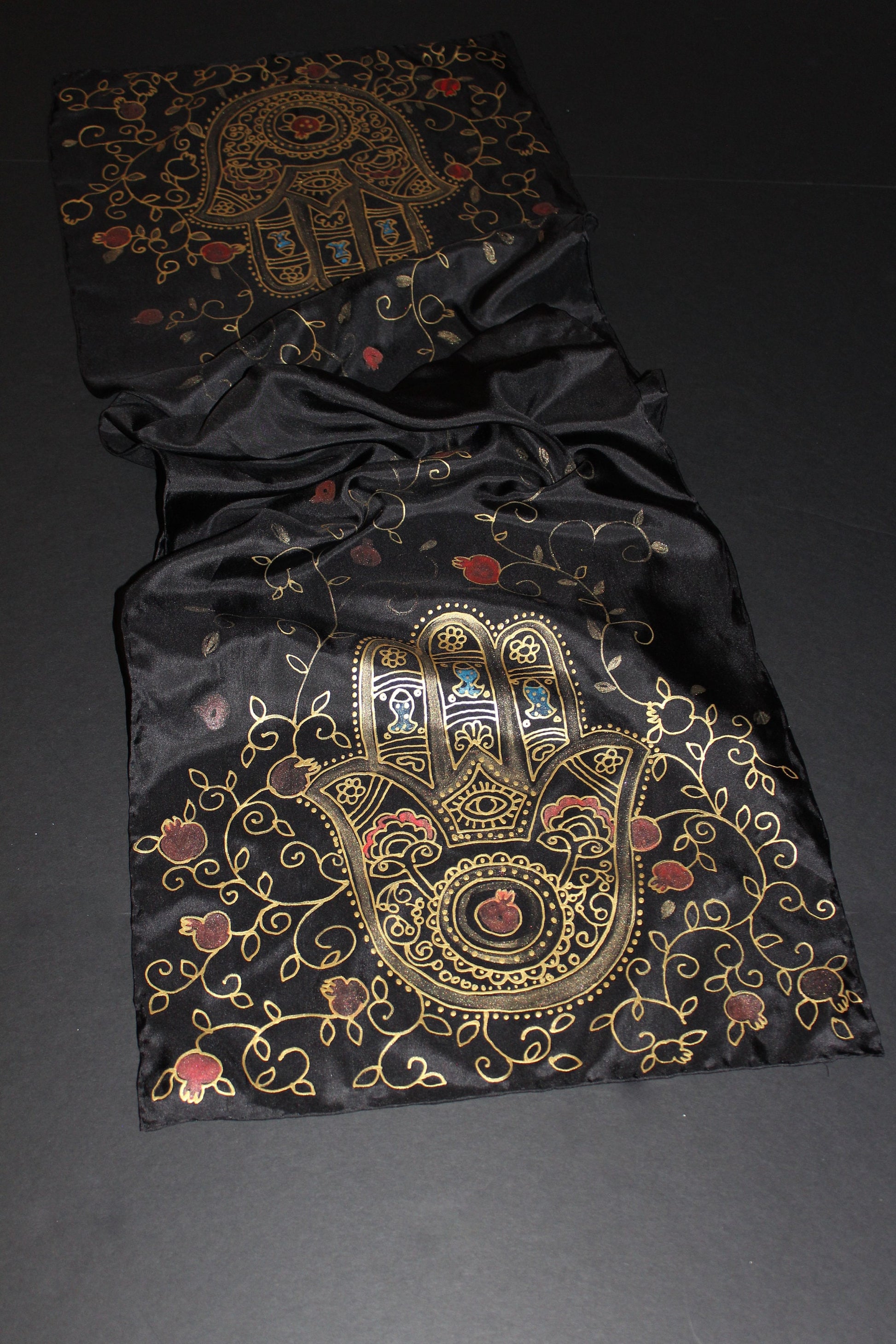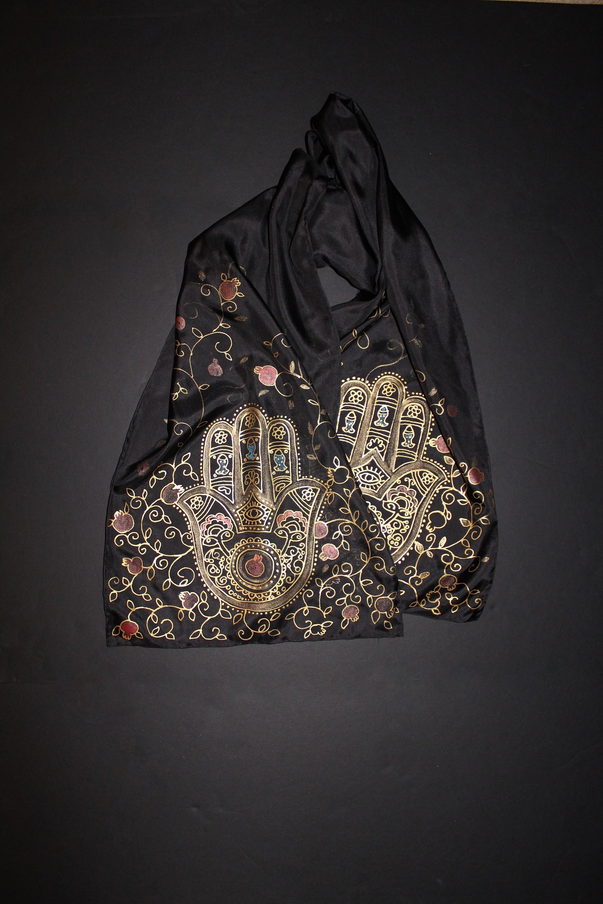 74-14in hand painted hamsa pomegranate silk scarf