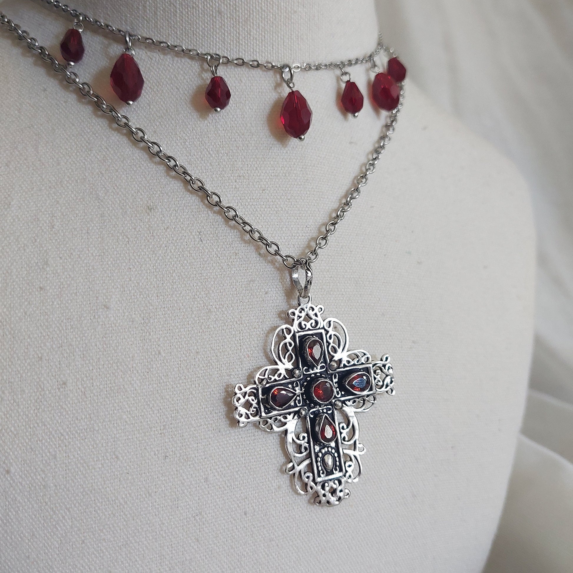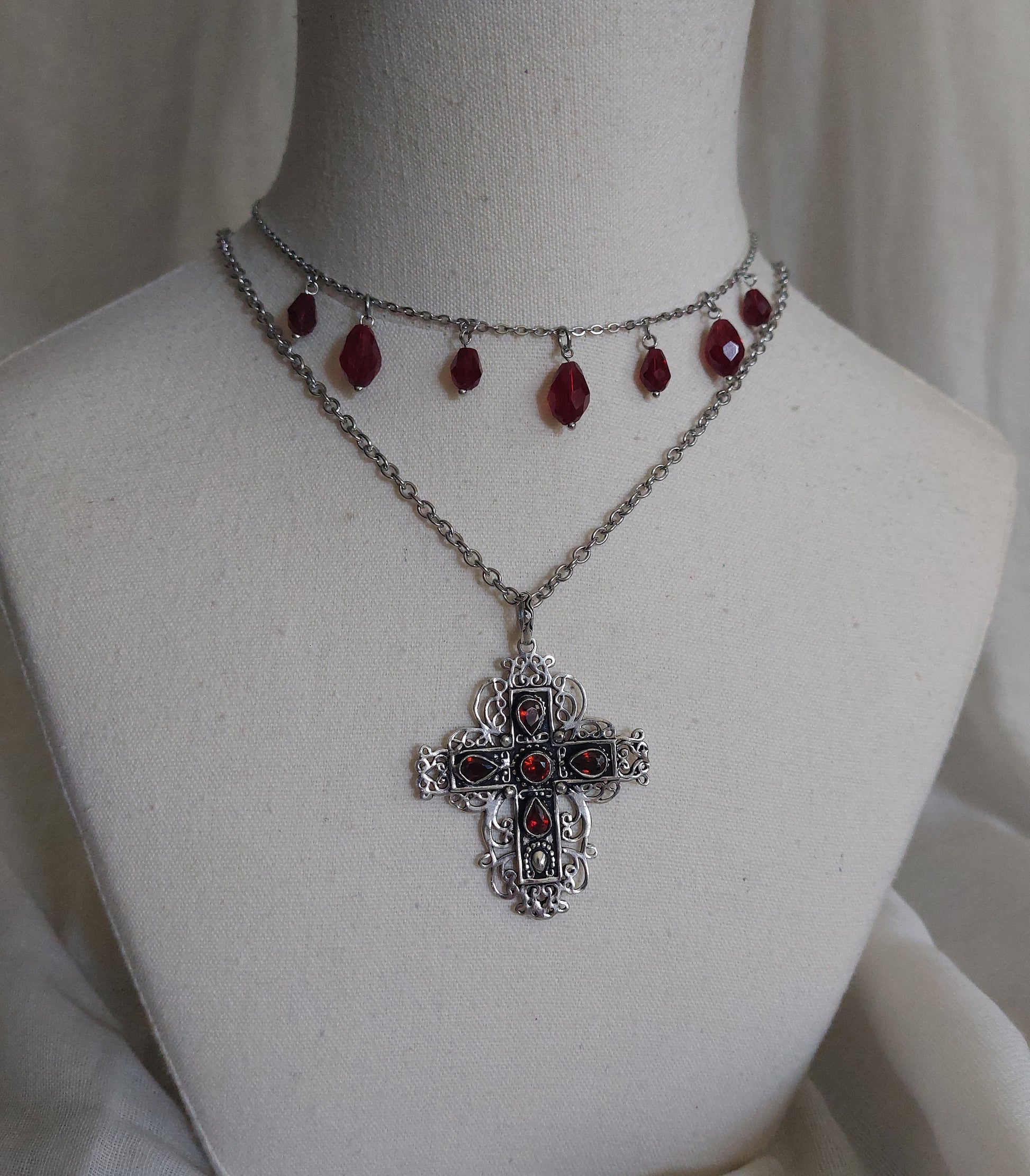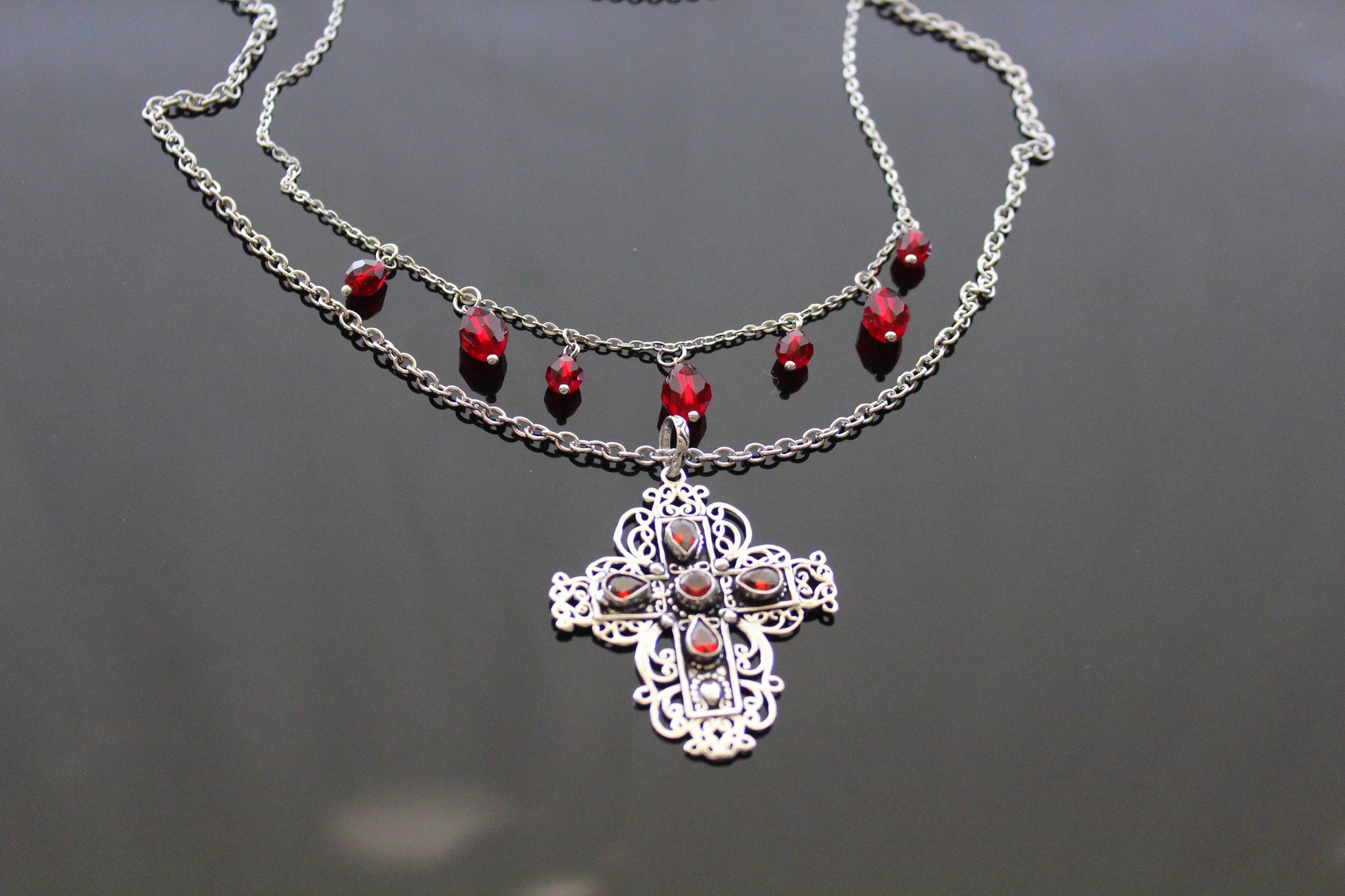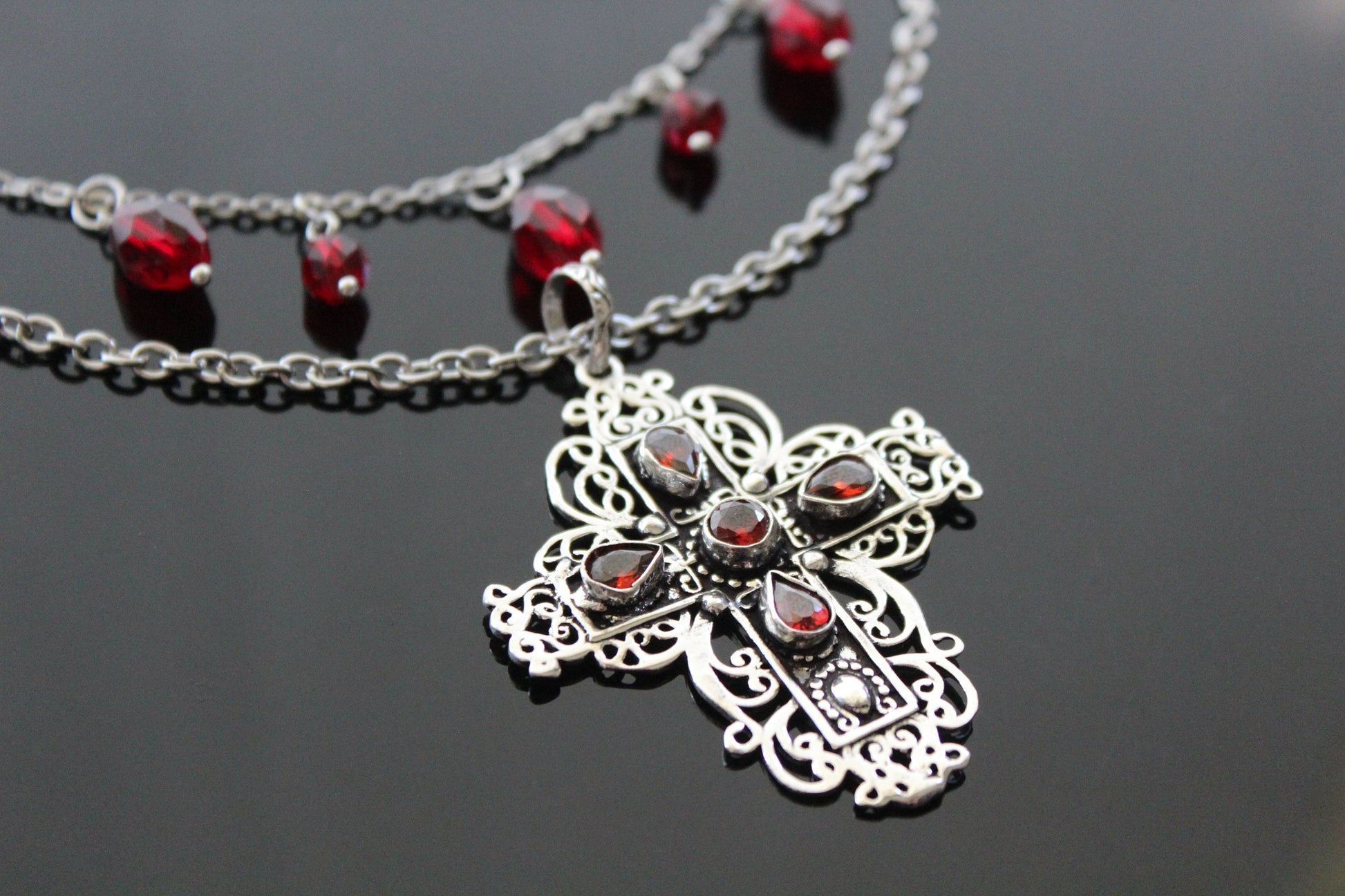 925 Sterling silver cross with natural garnet stones with stainless steel chain and Choker with glass beads, earrings