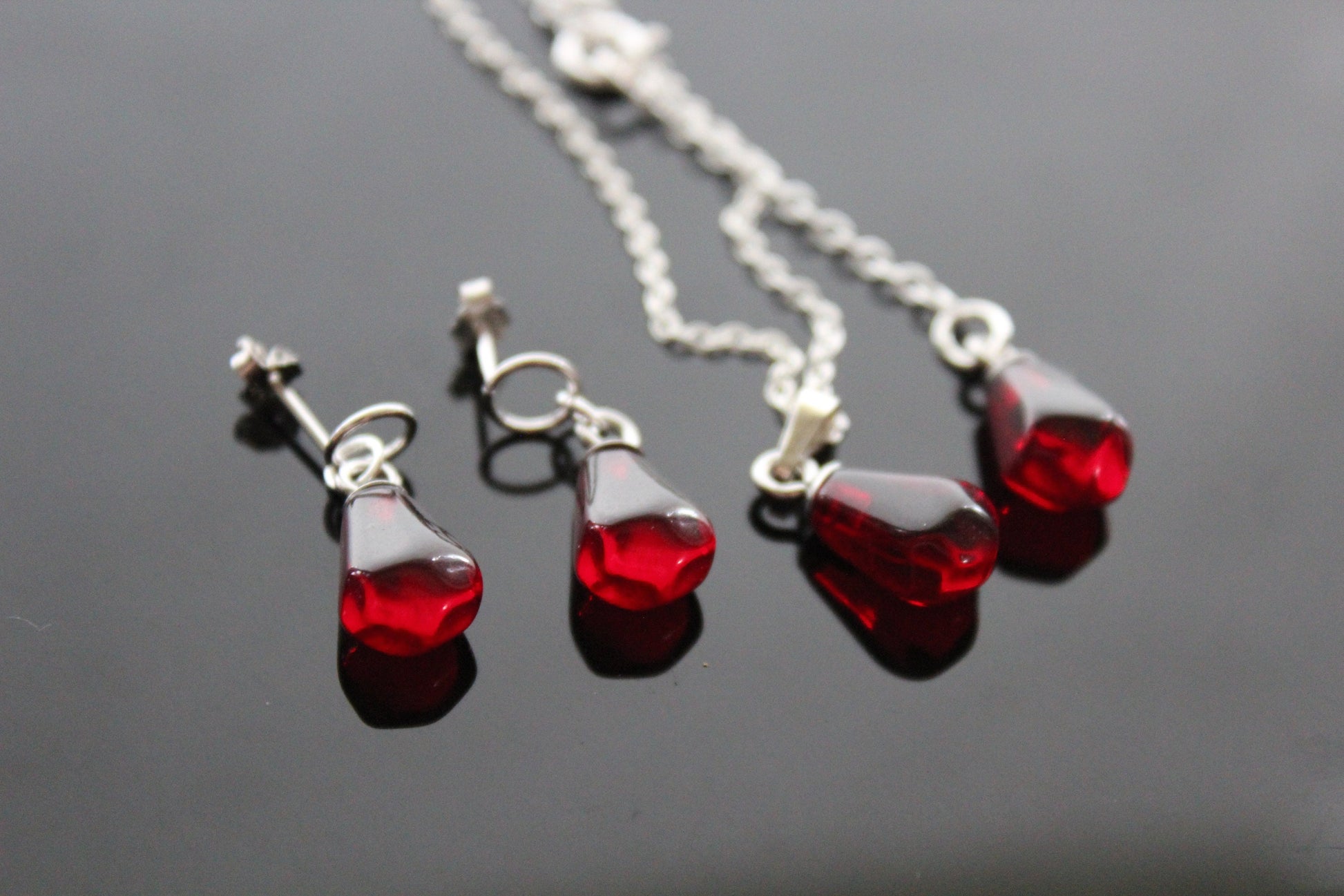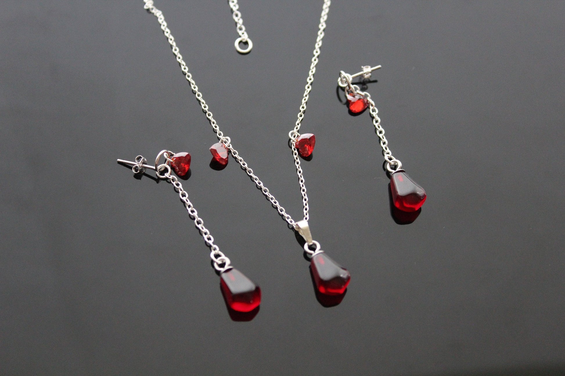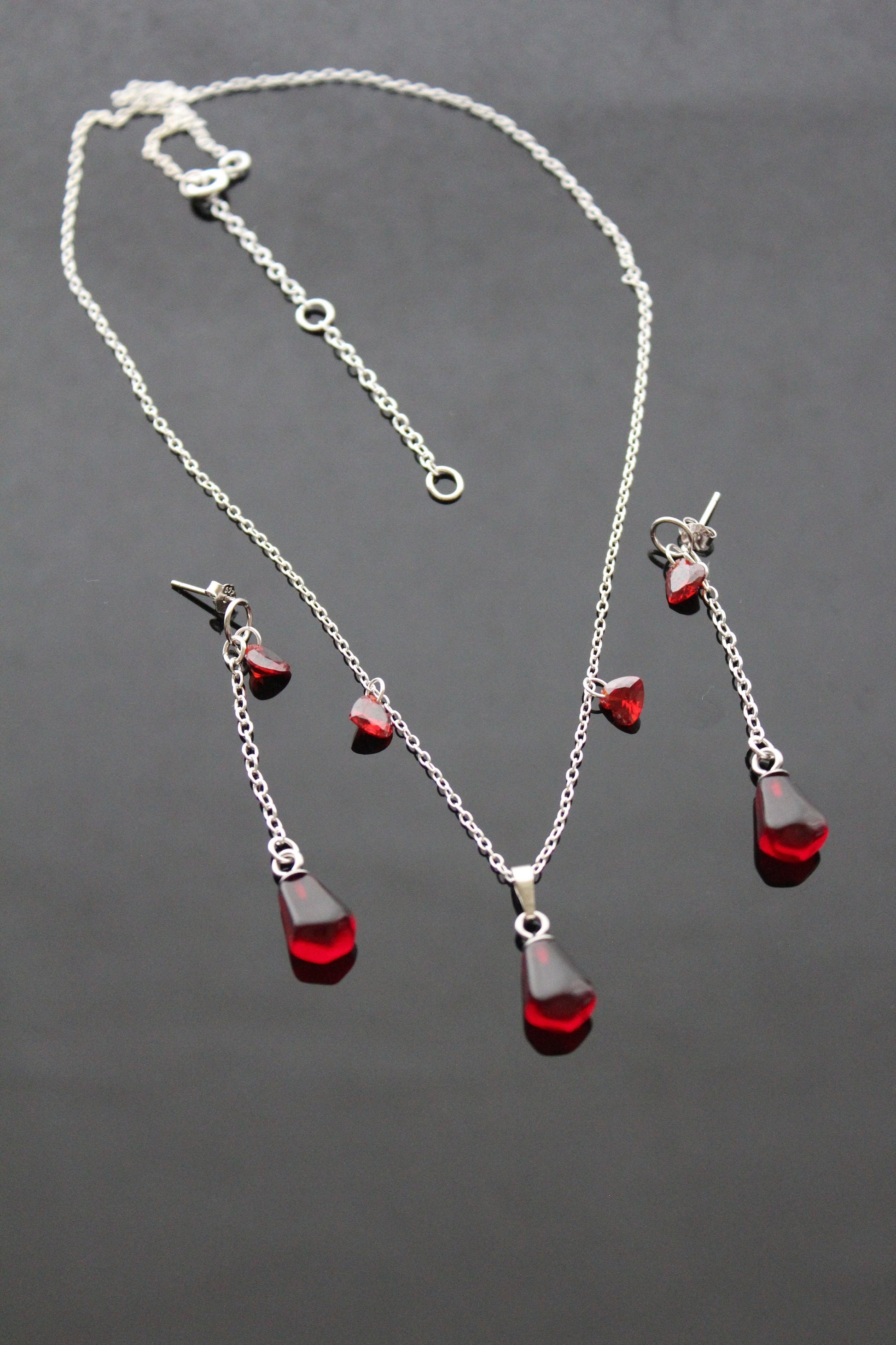 925 sterling silver pomegranate seeds jewelry set with Swarovski heart crystals and glass beads