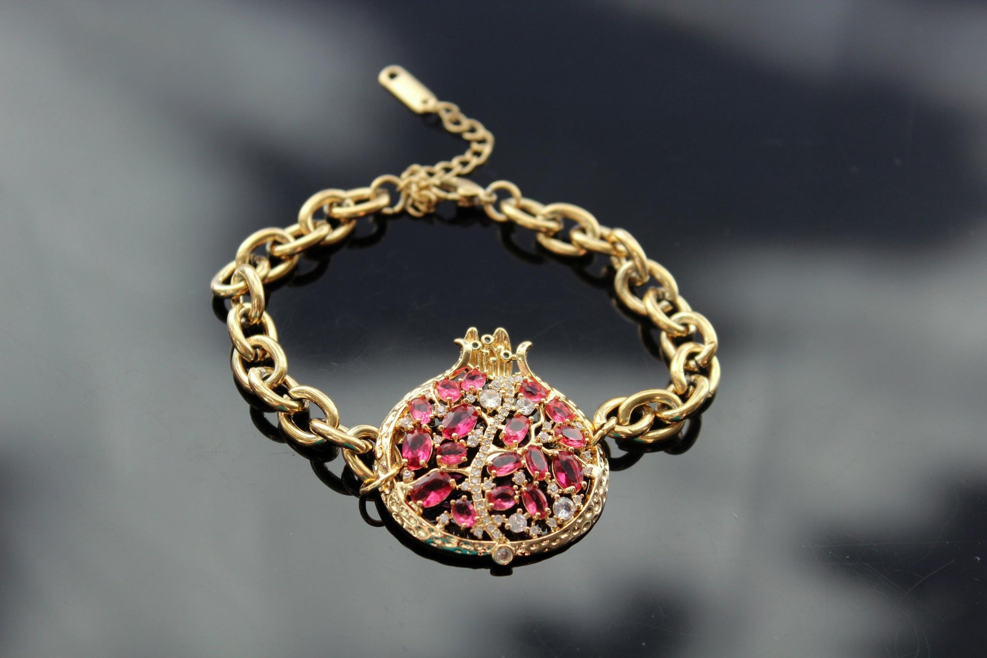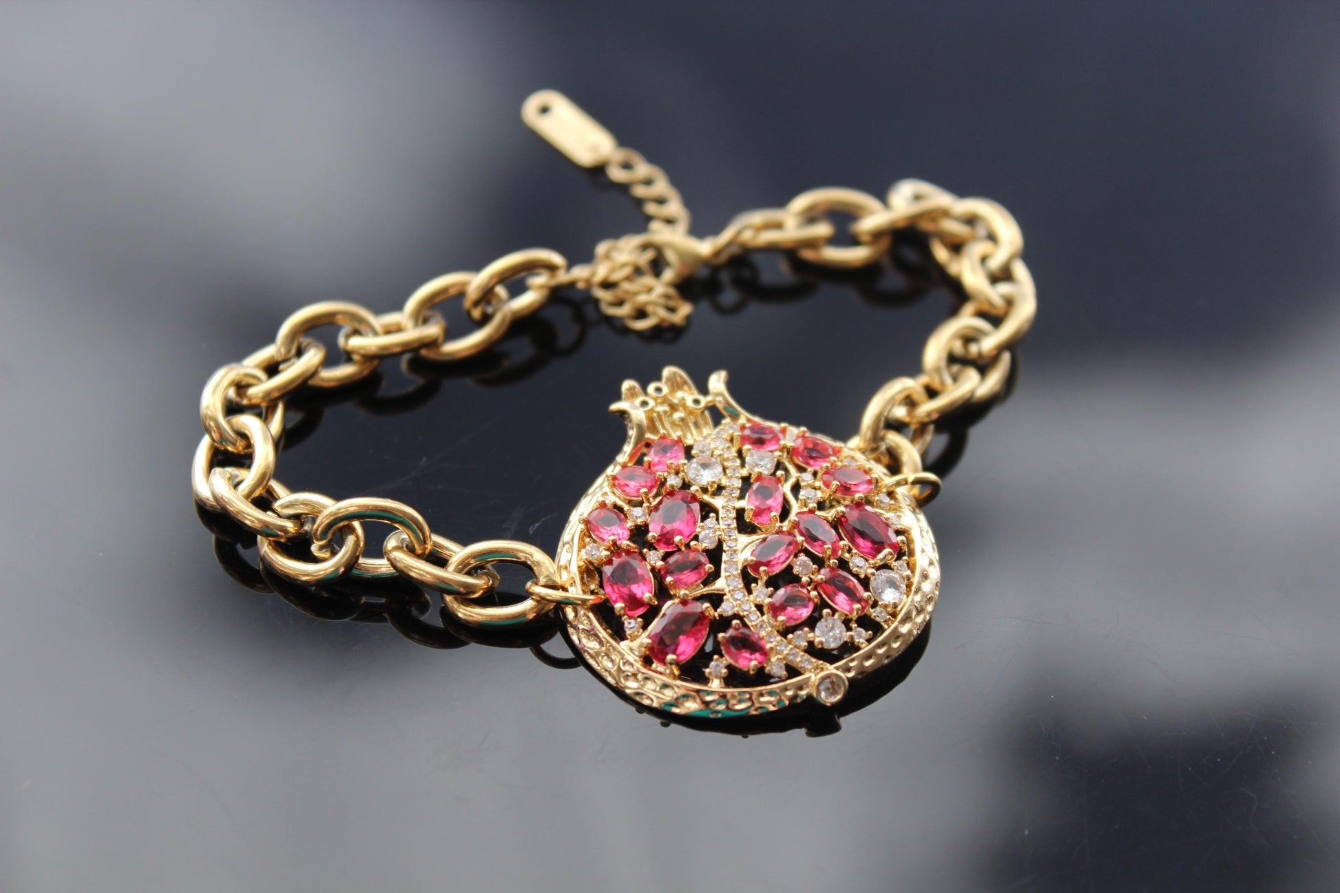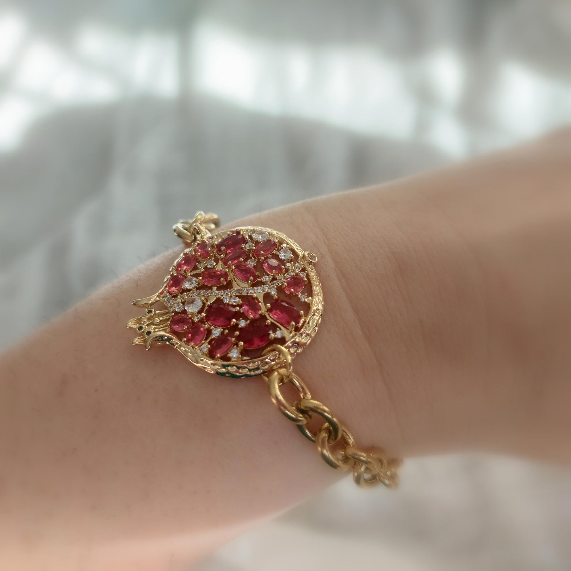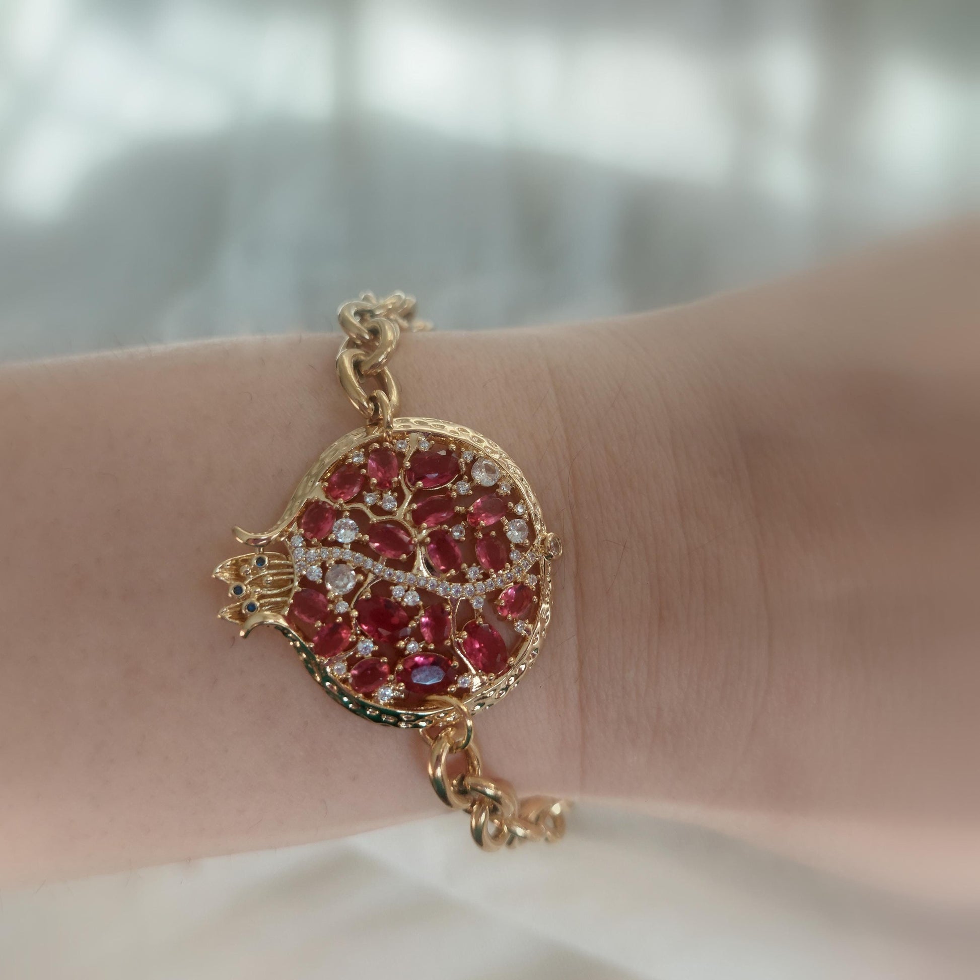 This exquisite bracelet features a radiant pomegranate centerpiece, crafted from 14K gold-plated stainless steel and adorned with sparkling crystals and zircons. The pomegranate, a symbol of prosperity, abundance, and love, carries deep meaning across many cultures, making this piece not just a stunning accessory but also a celebration of heritage and unity.