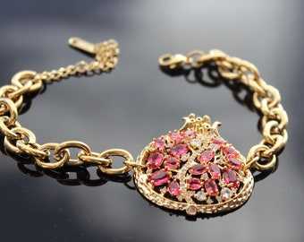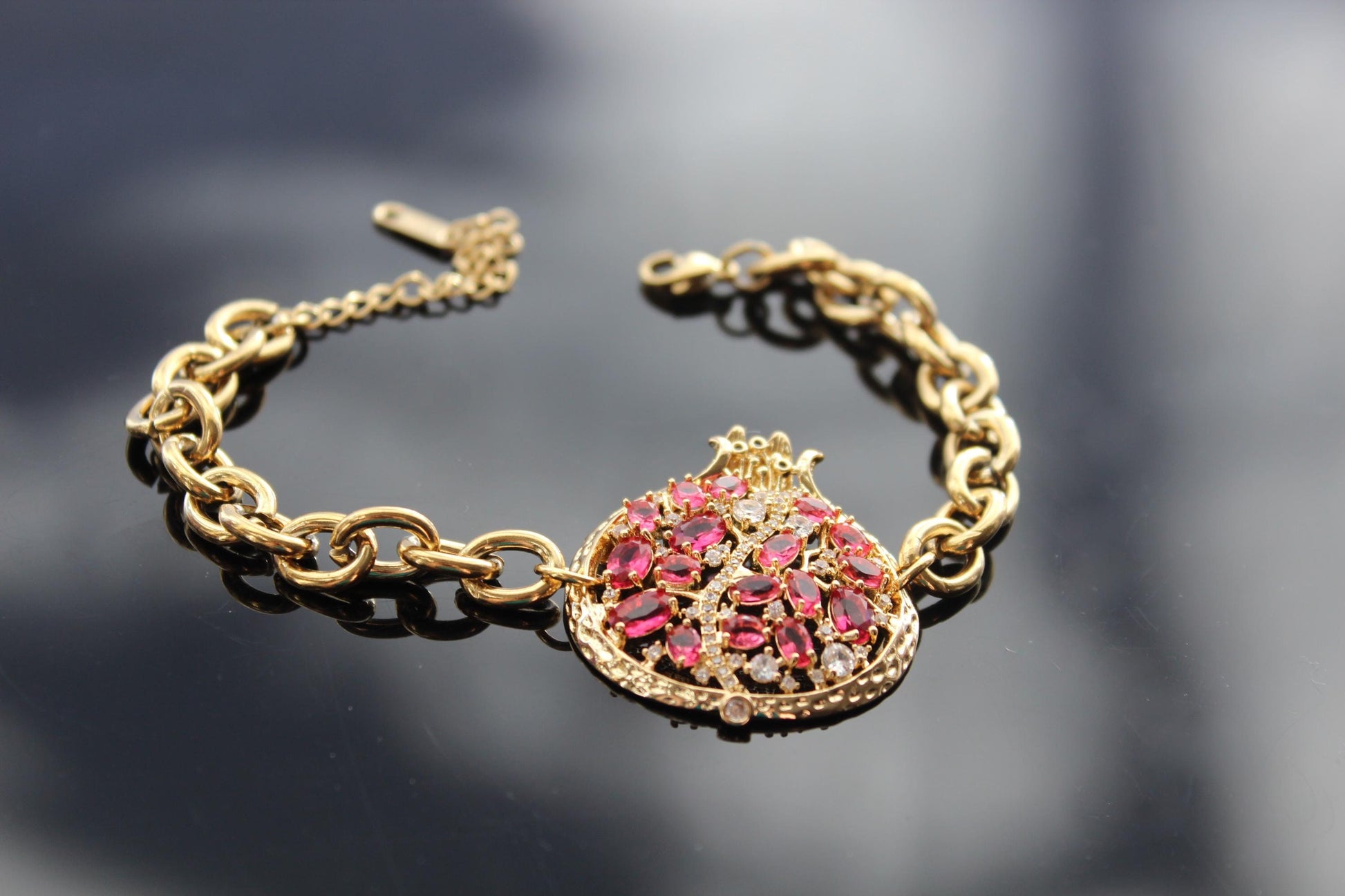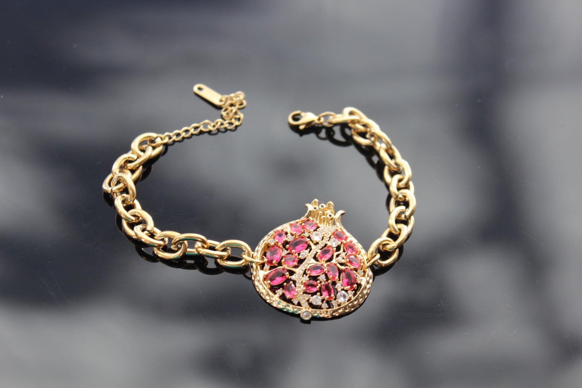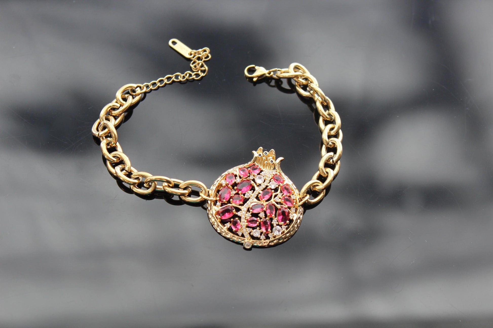 This exquisite bracelet features a radiant pomegranate centerpiece, crafted from 14K gold-plated stainless steel and adorned with sparkling crystals and zircons. The pomegranate, a symbol of prosperity, abundance, and love, carries deep meaning across many cultures, making this piece not just a stunning accessory but also a celebration of heritage and unity.