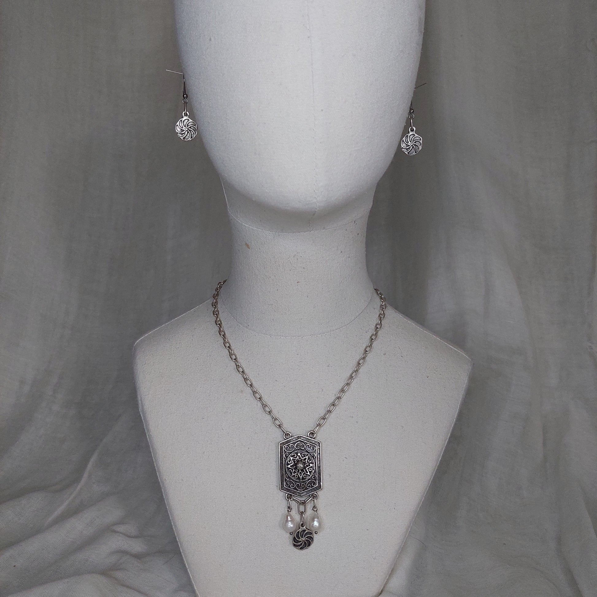 Shield – Antique Silver Armenian Jewelry Set with Natural Pearls and Eternity Symbol features an adjustable length up to 20 inches. This meticulously crafted collection showcases a distinctive silver shield pendant adorned with elaborate filigree work, embodying protection and cultural fortitude. The pendant is complemented by authentic freshwater pearls, a traditional Armenian rosette, and the sacred Eternity symbol—representing infinite continuity and temporal unity. The coordinating earrings mirror the rosette elements with the same antiqued patina. The substantial chain and geometric shield design reference medieval armor aesthetics, while the pearls introduce an element of refined elegance—creating a harmonious juxtaposition of strength and grace. Constructed from nickel-free components, this lightweight ensemble transitions seamlessly from daily wear to ceremonial occasions.