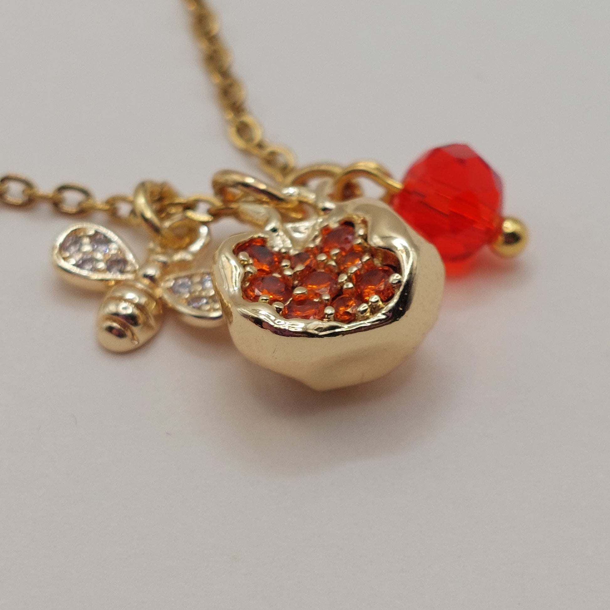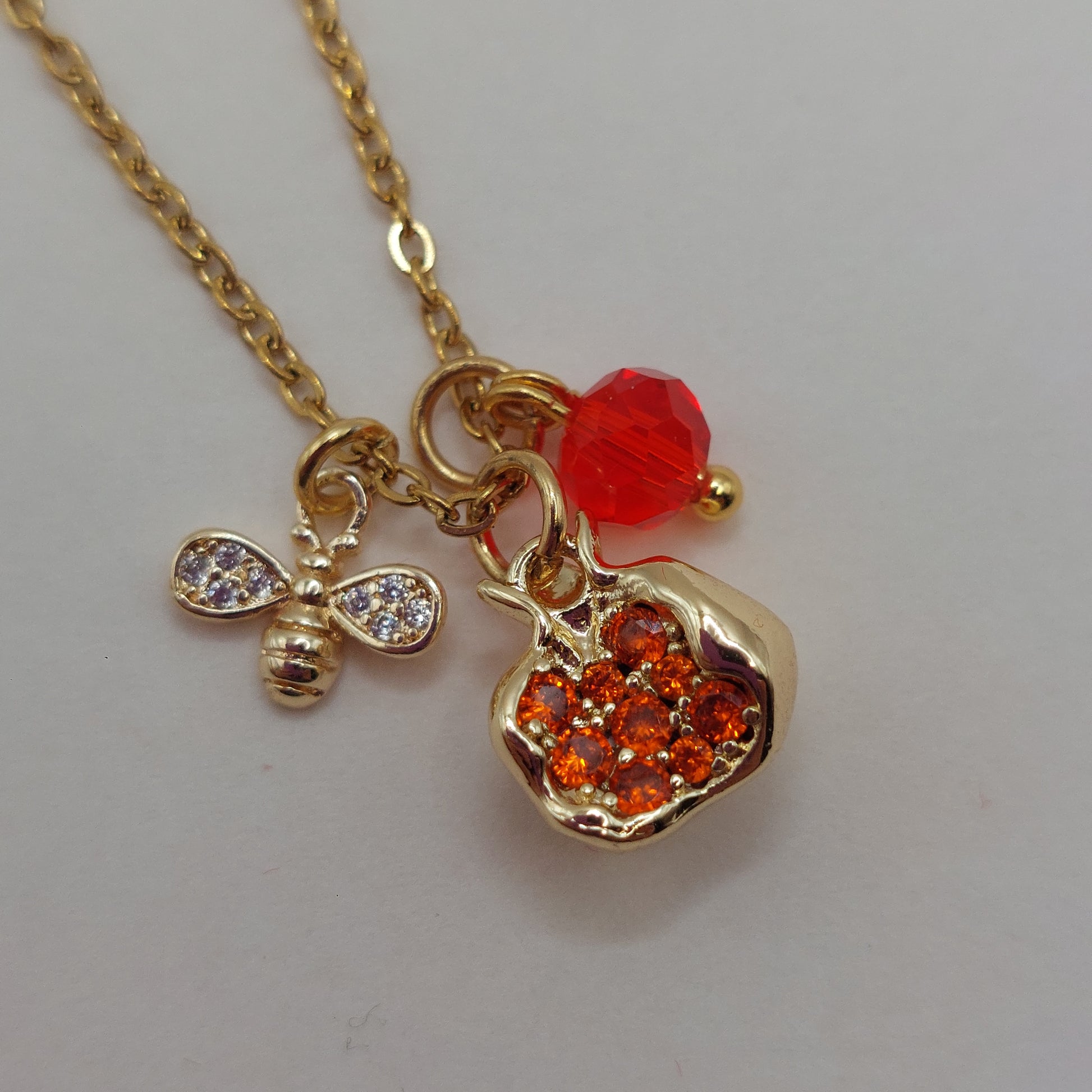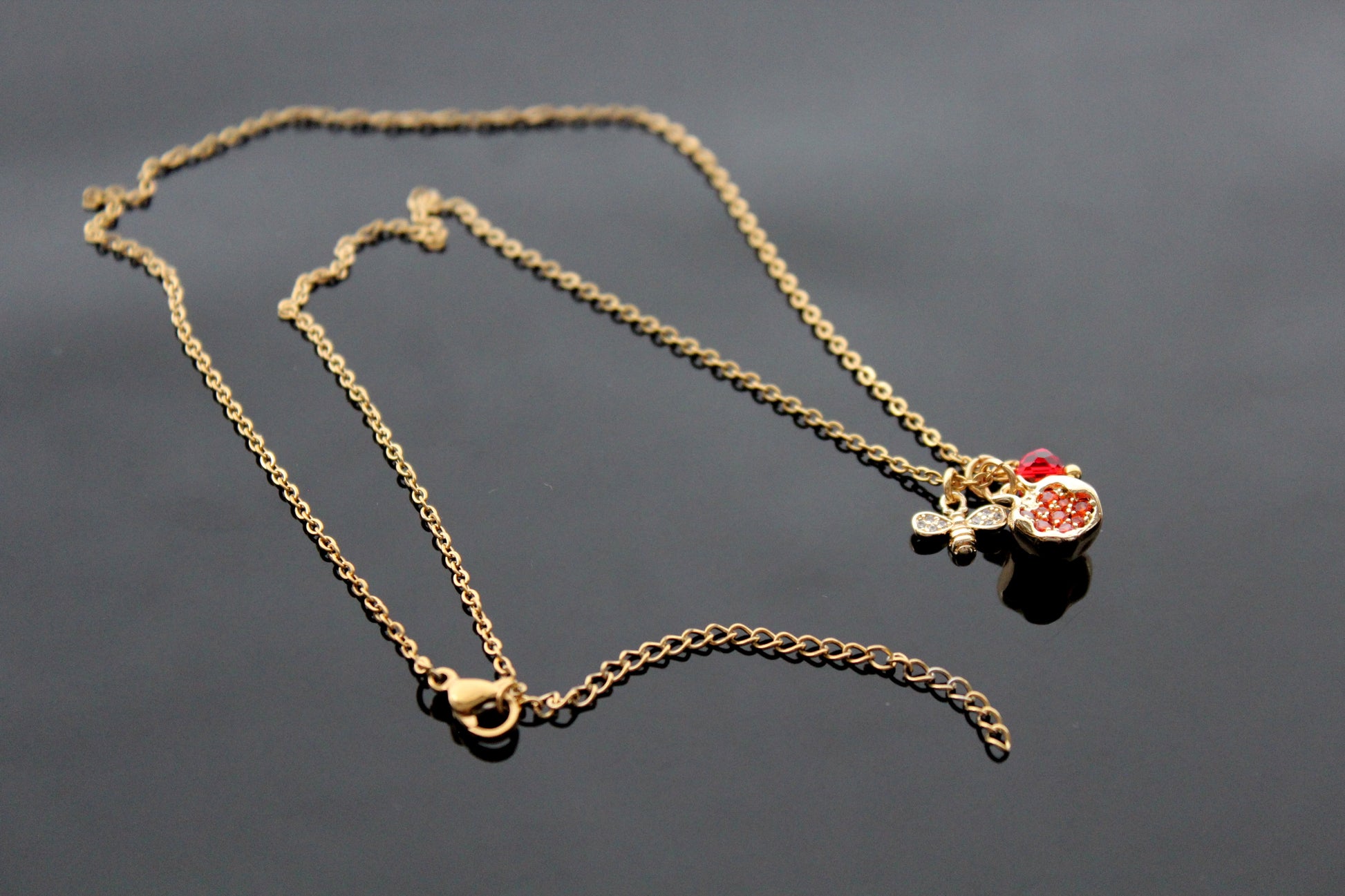 Experience luxury and elegance with our Bee Pomegranate Gold Plated Necklace. The intricate design of the bee and pomegranate symbolizes beauty and wealth. Made with high-quality materials, this necklace is a must-have for any fashion-forward individual. Elevate your style and make a statement with this stunning accessory.