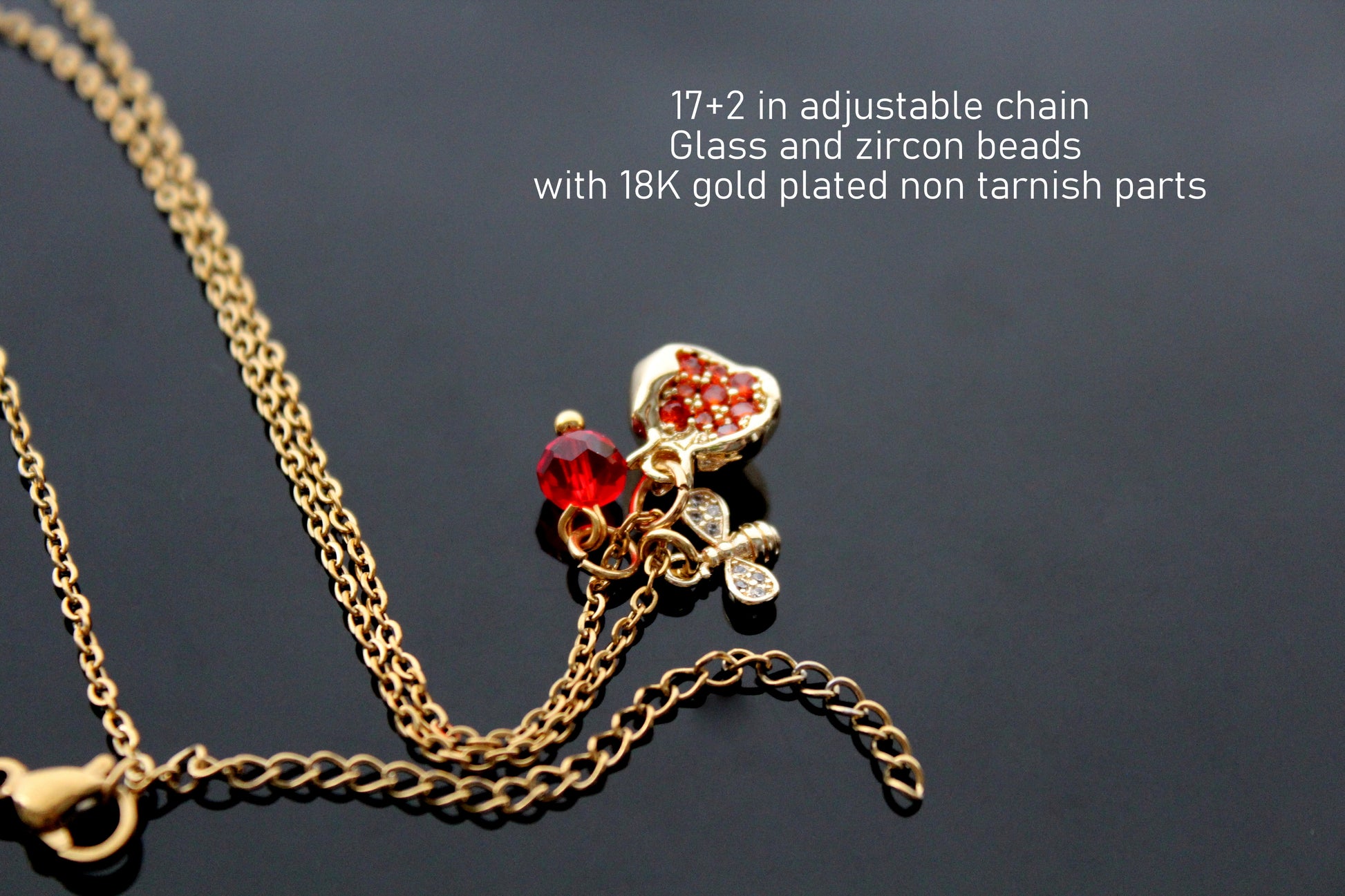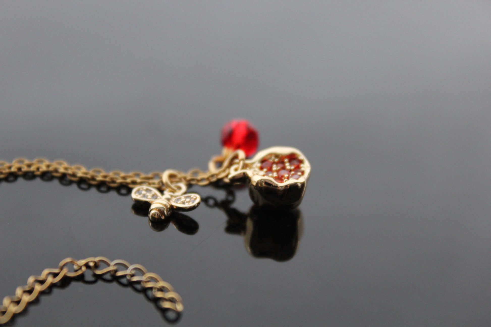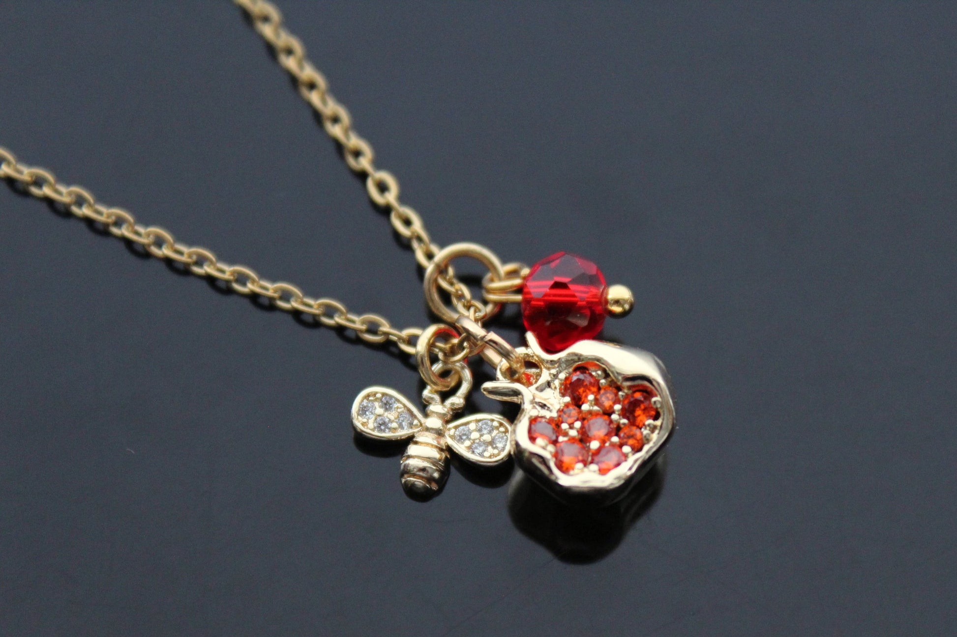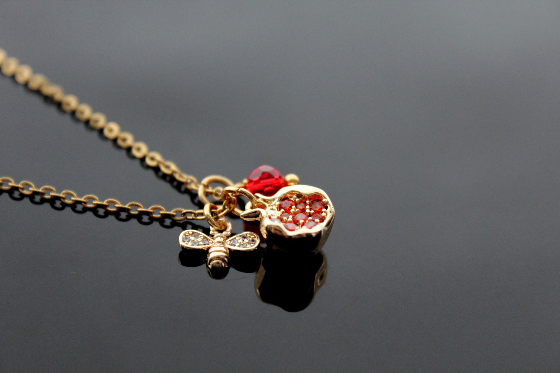 Experience luxury and elegance with our Bee Pomegranate Gold Plated Necklace. The intricate design of the bee and pomegranate symbolizes beauty and wealth. Made with high-quality materials, this necklace is a must-have for any fashion-forward individual. Elevate your style and make a statement with this stunning accessory.