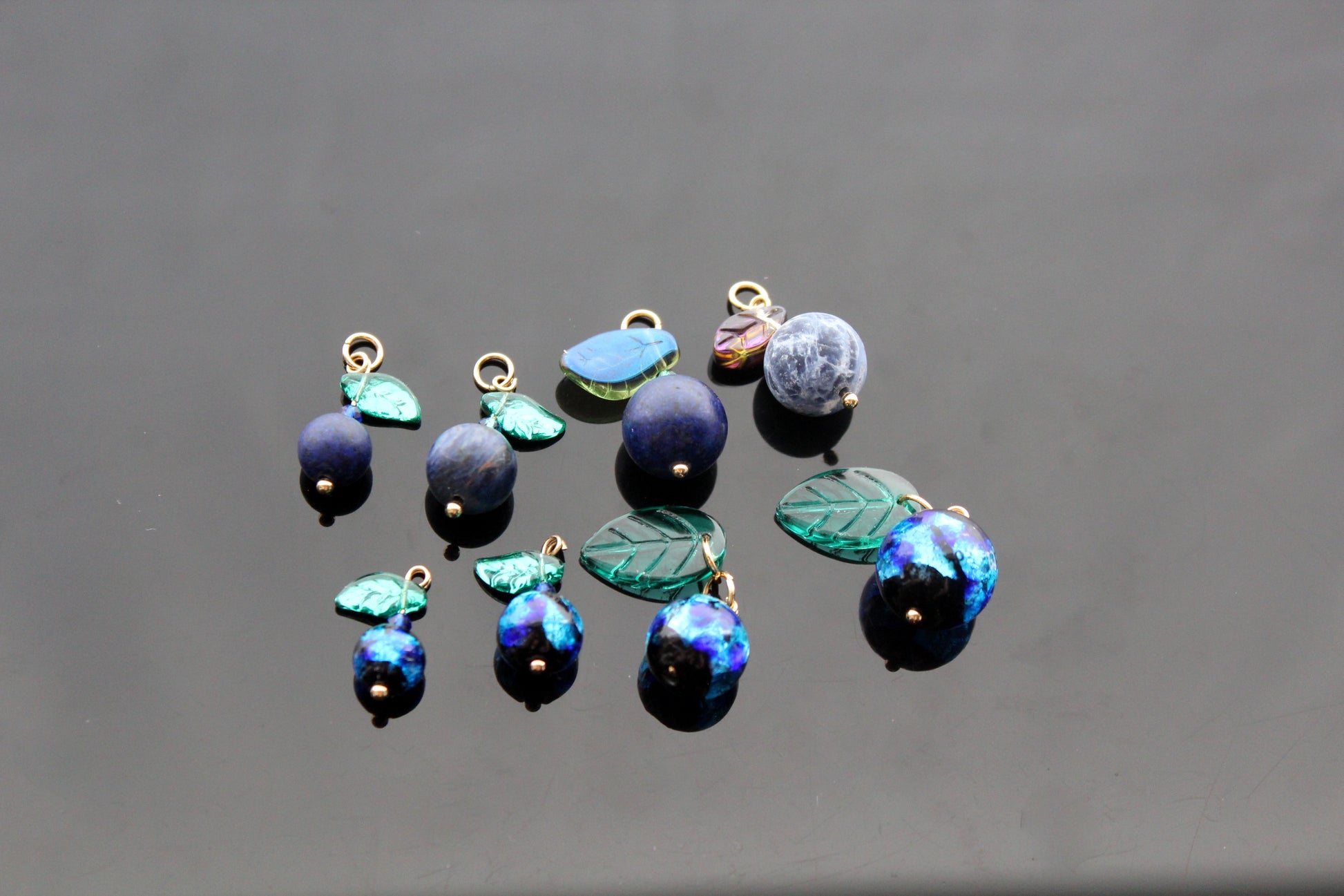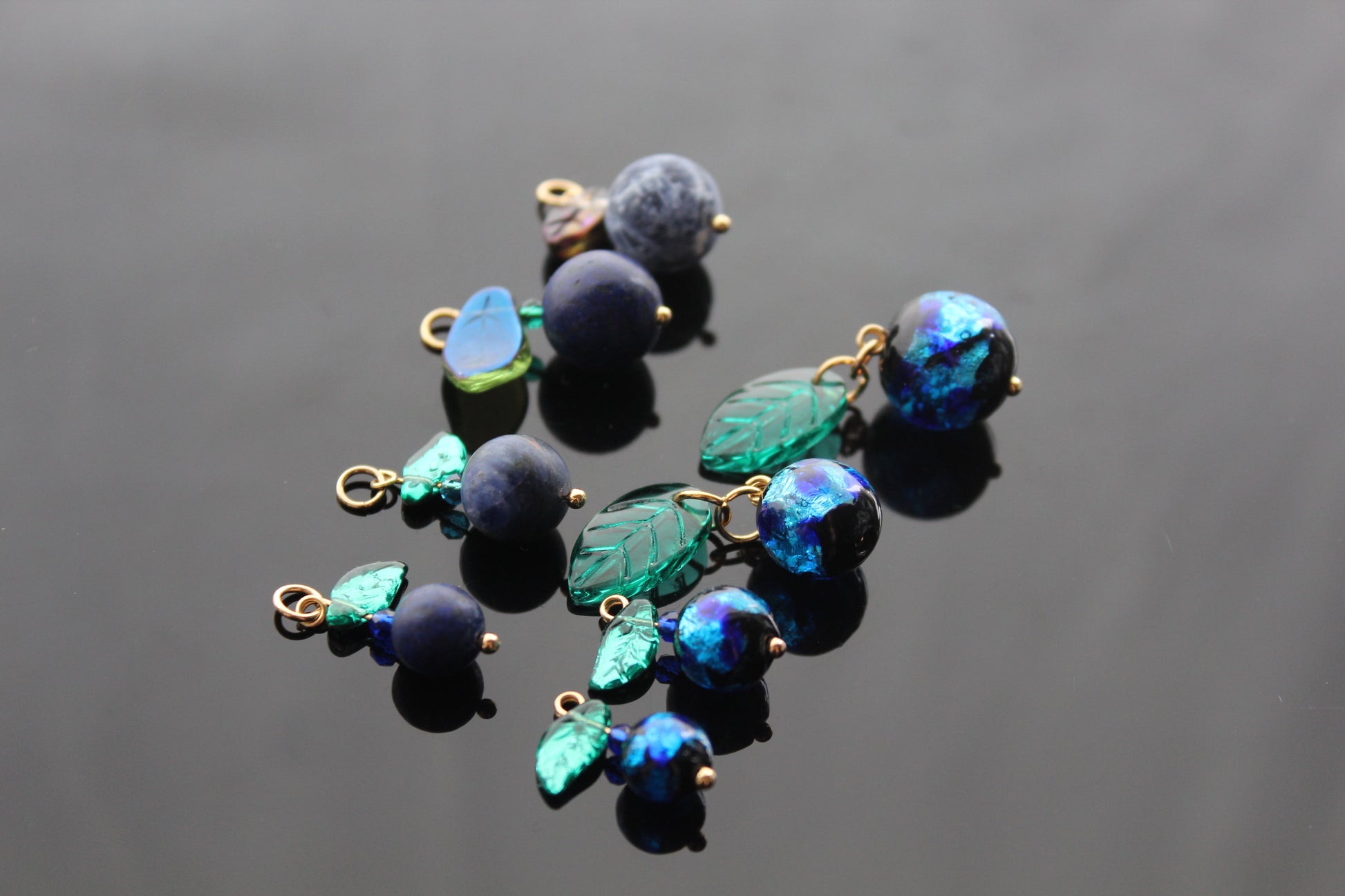 Murano Glass Blueberry charms for jewelry making with silver and gold hooks and glass leaves
