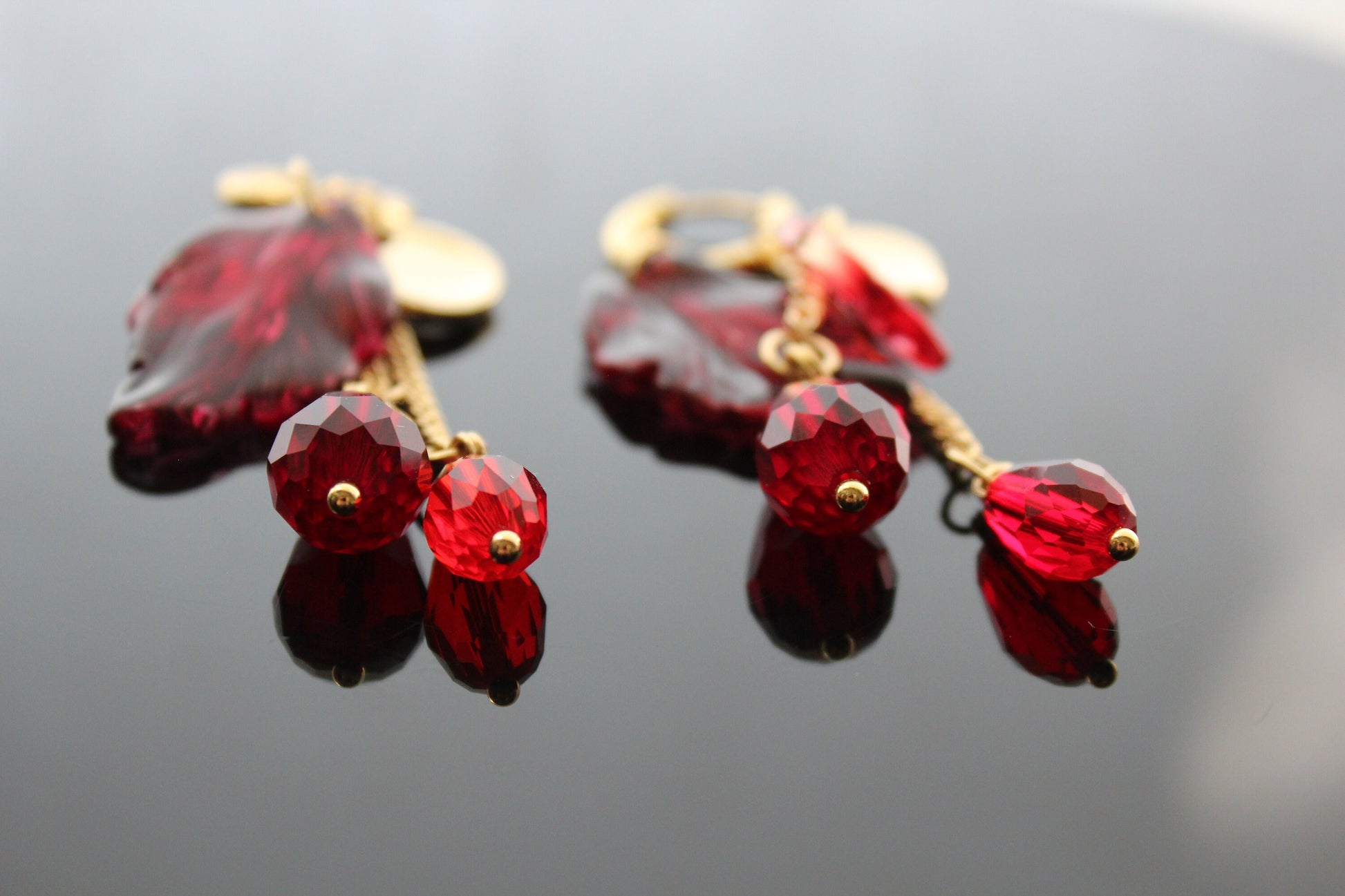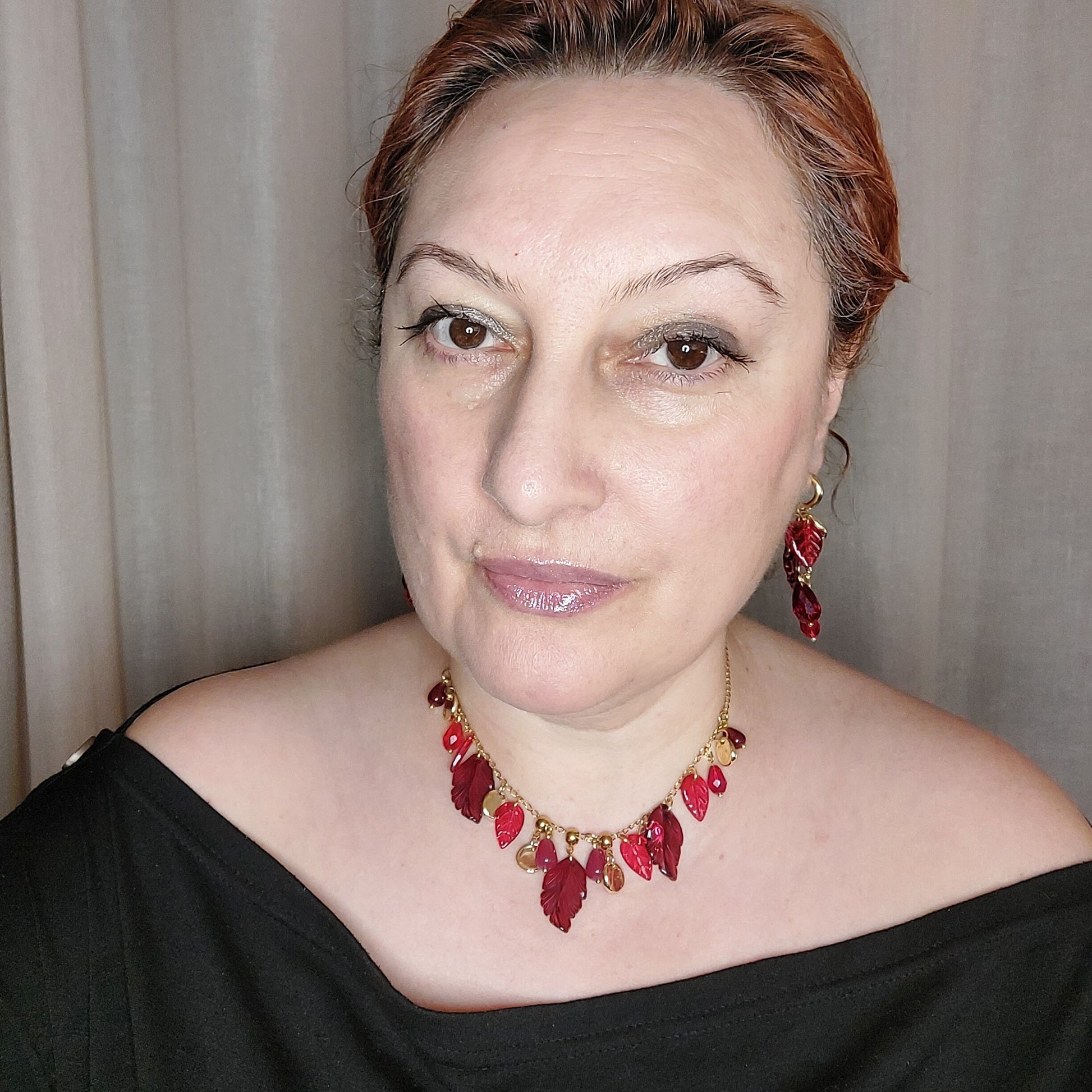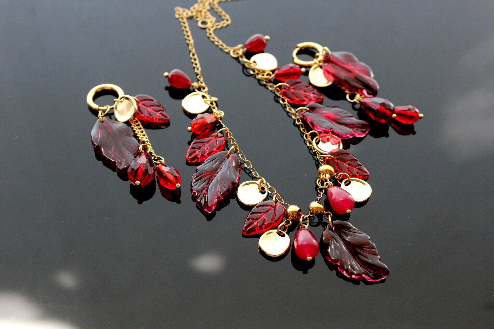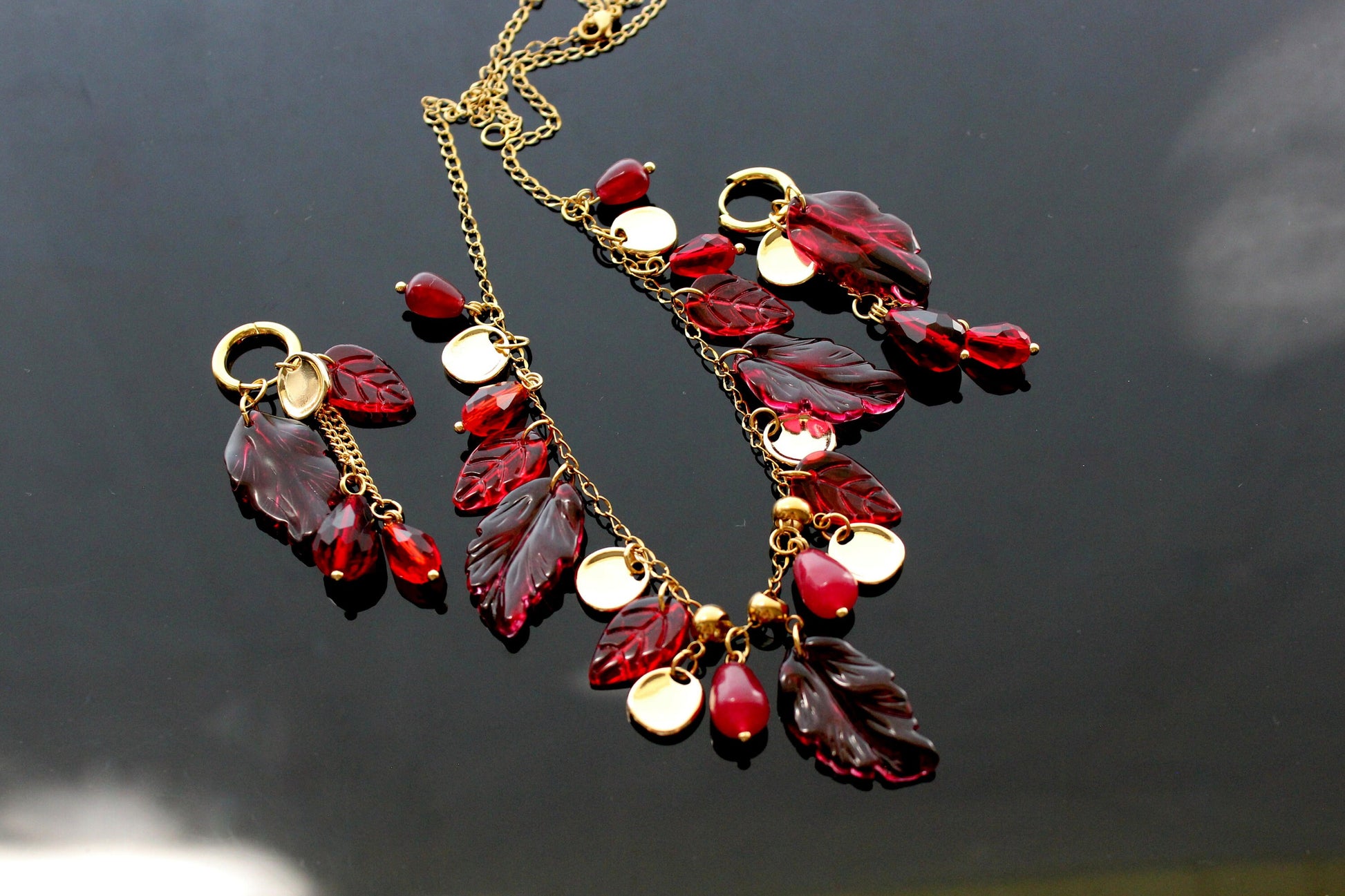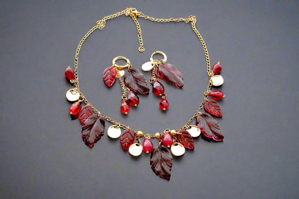 Fall leaves jewelry set with glass and natural red calcedony