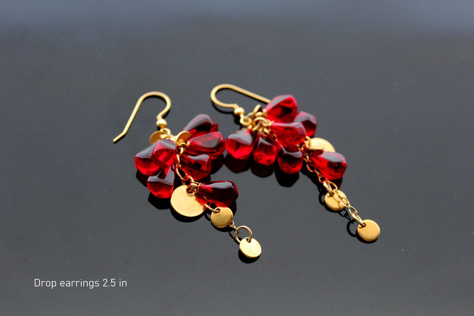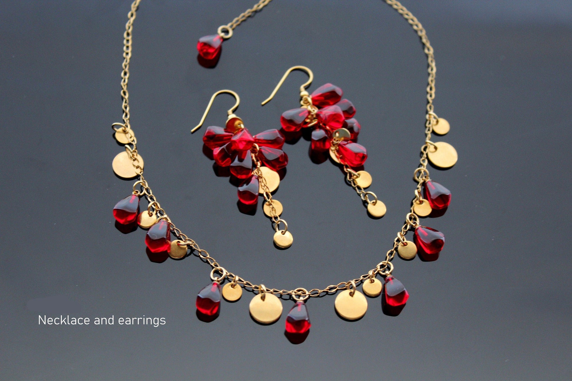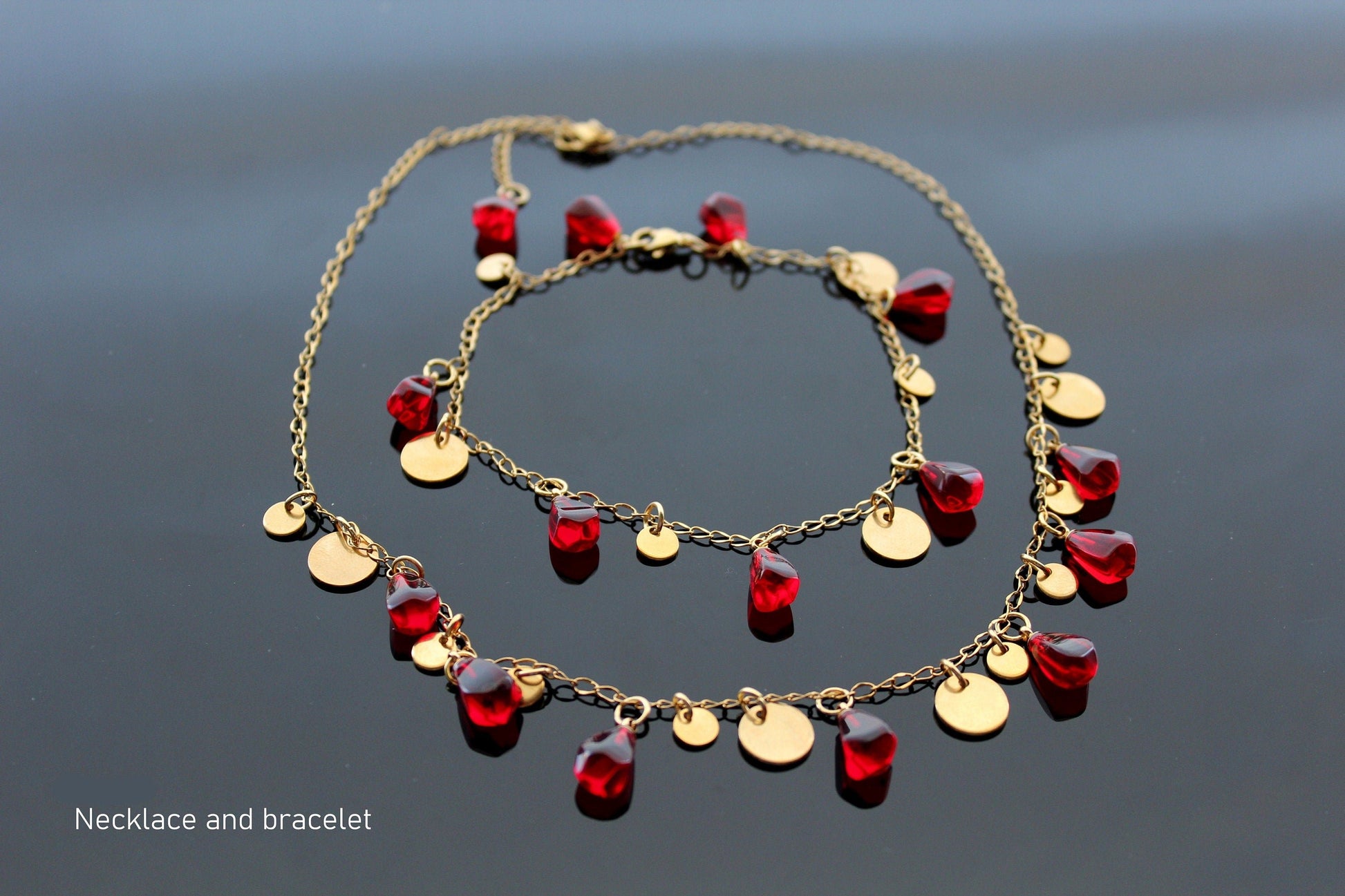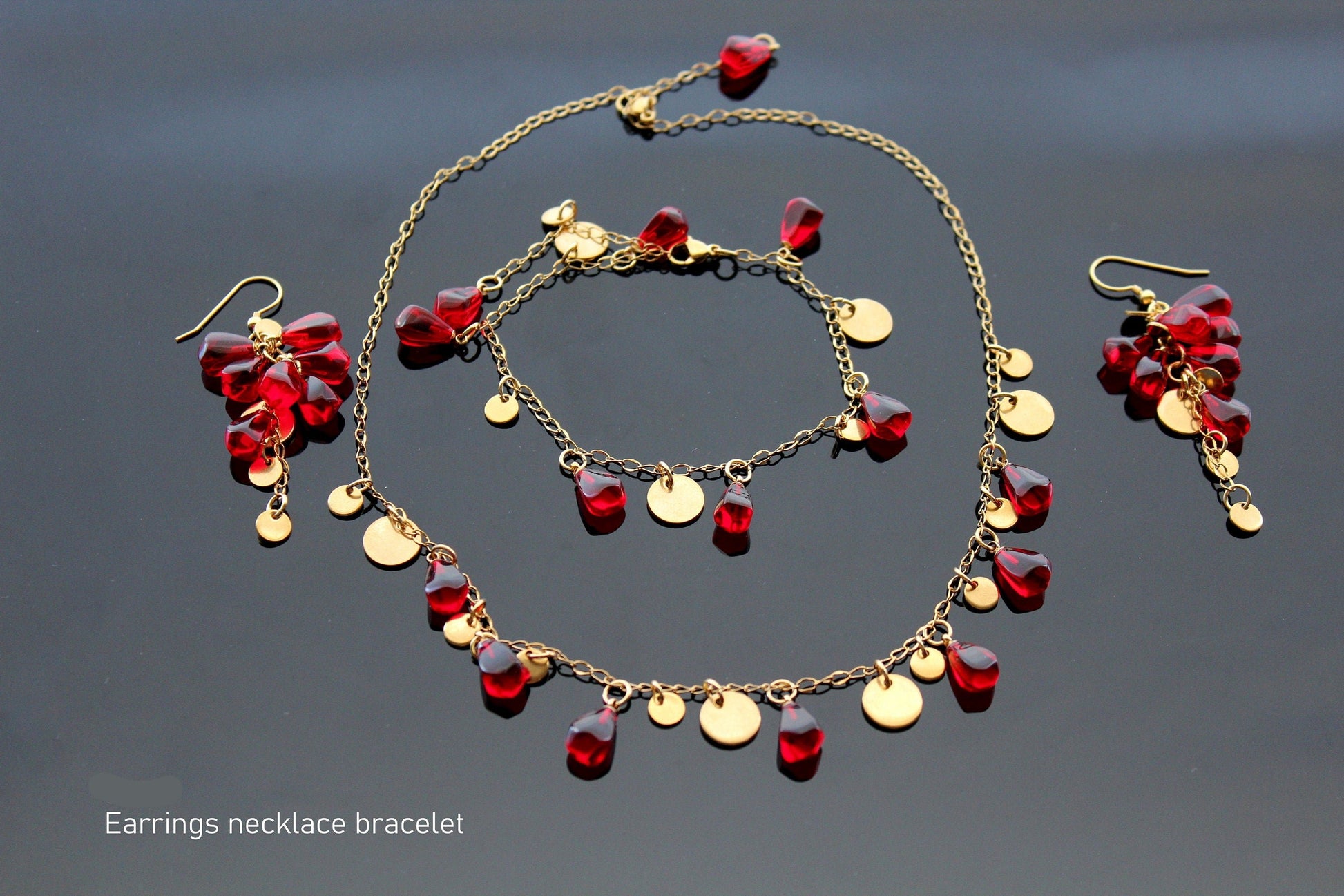 Elevate your style with this handmade pomegranate seed jewelry set. The non-tarnish 18K gold plated stainless steel adds durability and elegance. The adjustable necklace and bracelet offer versatility and the perfect fit. Symbolizing sanctity, fertility, and abundance, this set is a beautiful addition to any collection.