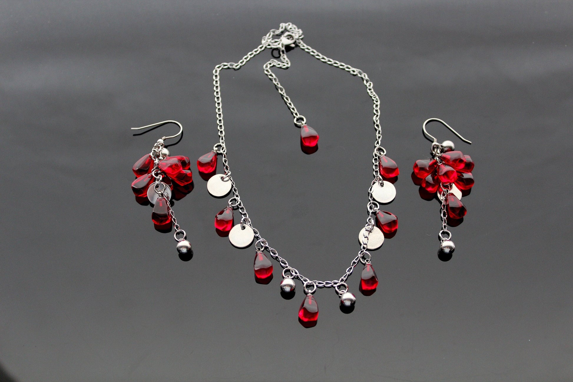 This elegant handmade jewelry set features pomegranate seeds, symbolizing beauty and abundance, on a high quality stainless steel design. The adjustable necklace allows for a perfect fit, while the earrings and bracelet add a touch of sophistication. Customize the length for no extra charge.