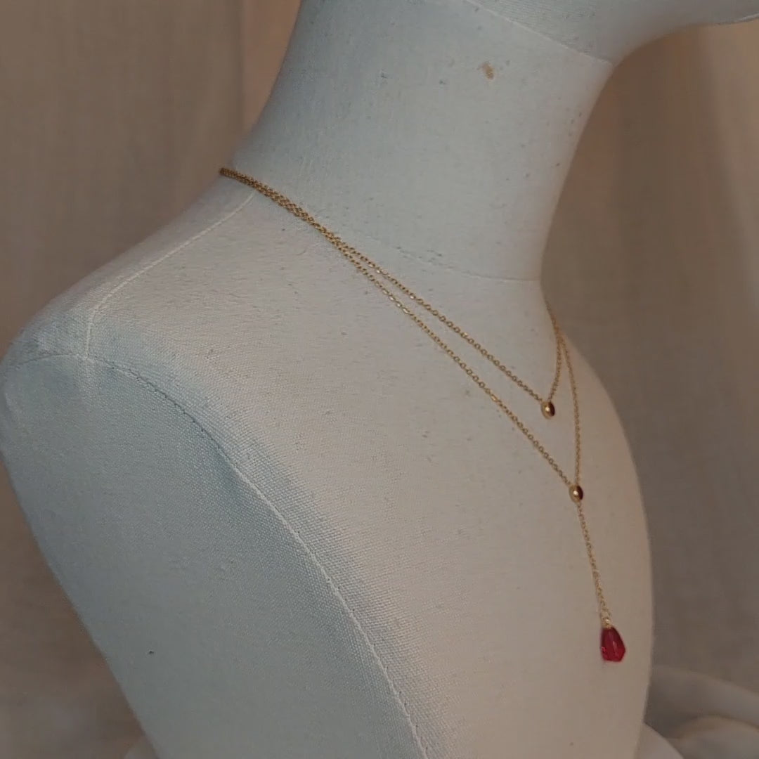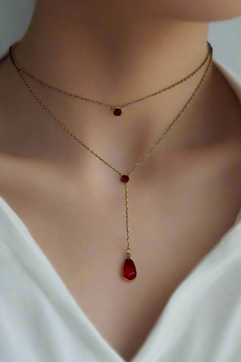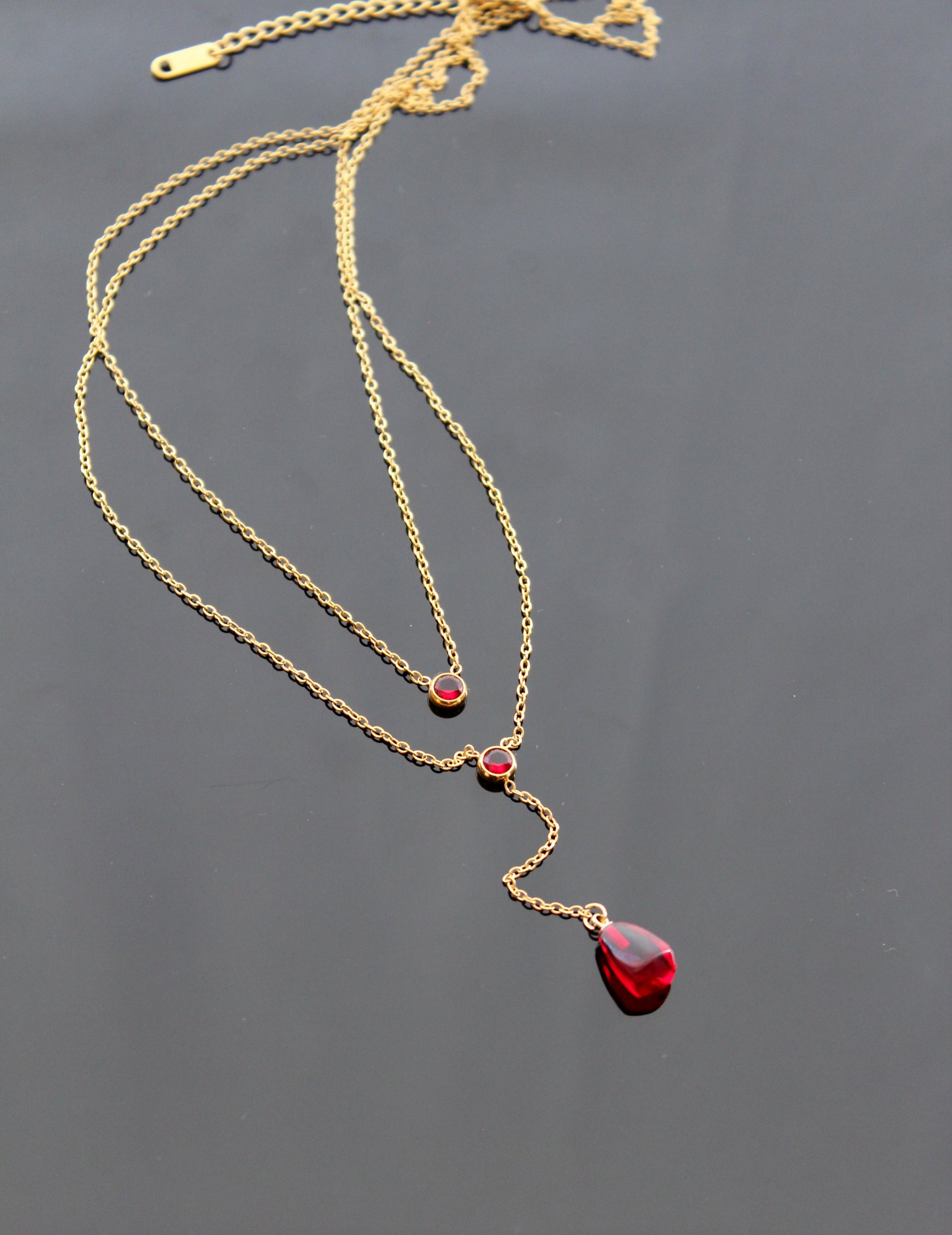 Discover the captivating beauty of our Gold Plated Stainless Steel Glass Pomegranate Seed Y Necklace, a stunning piece that effortlessly blends modern design with natural inspiration.