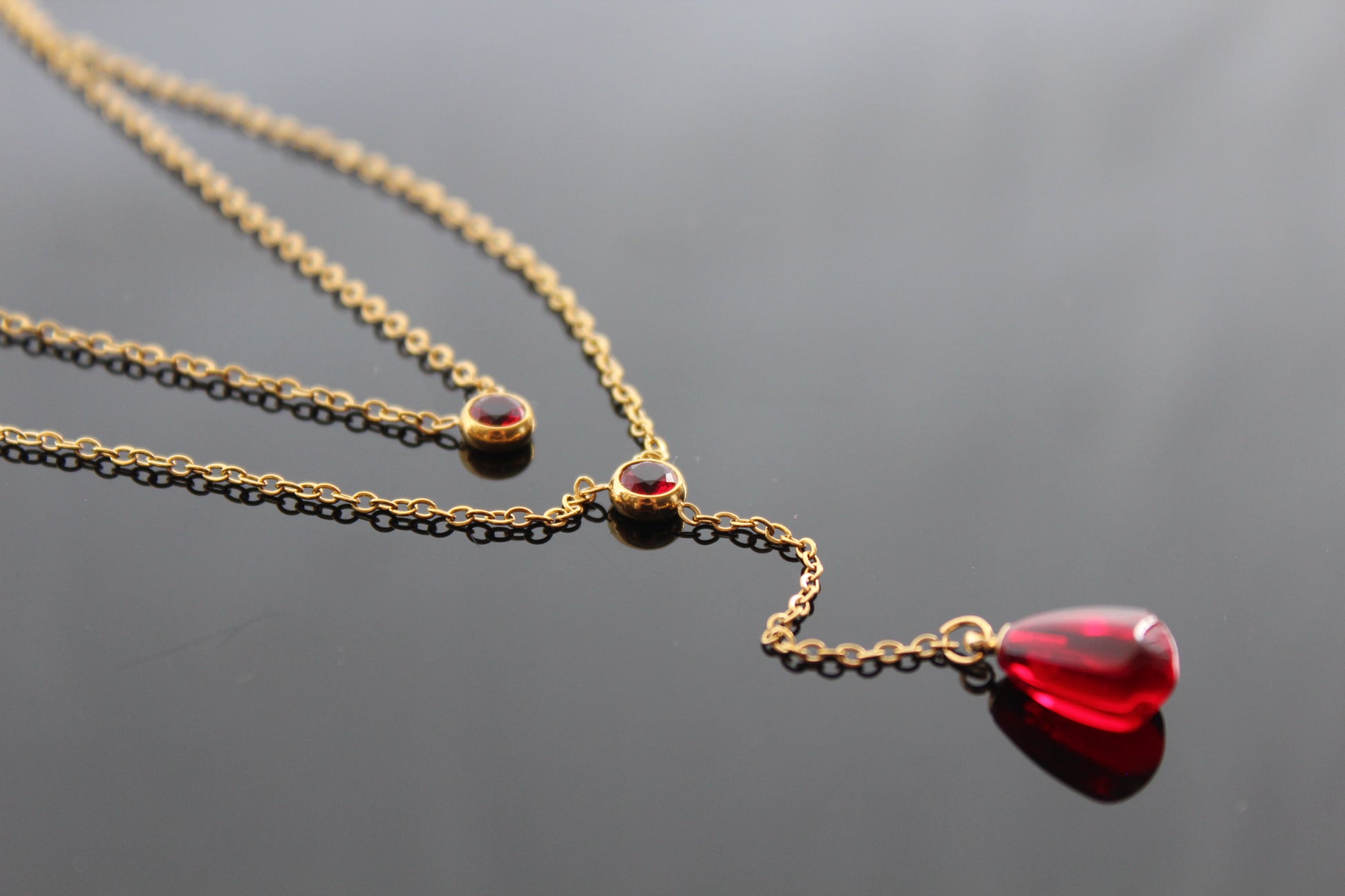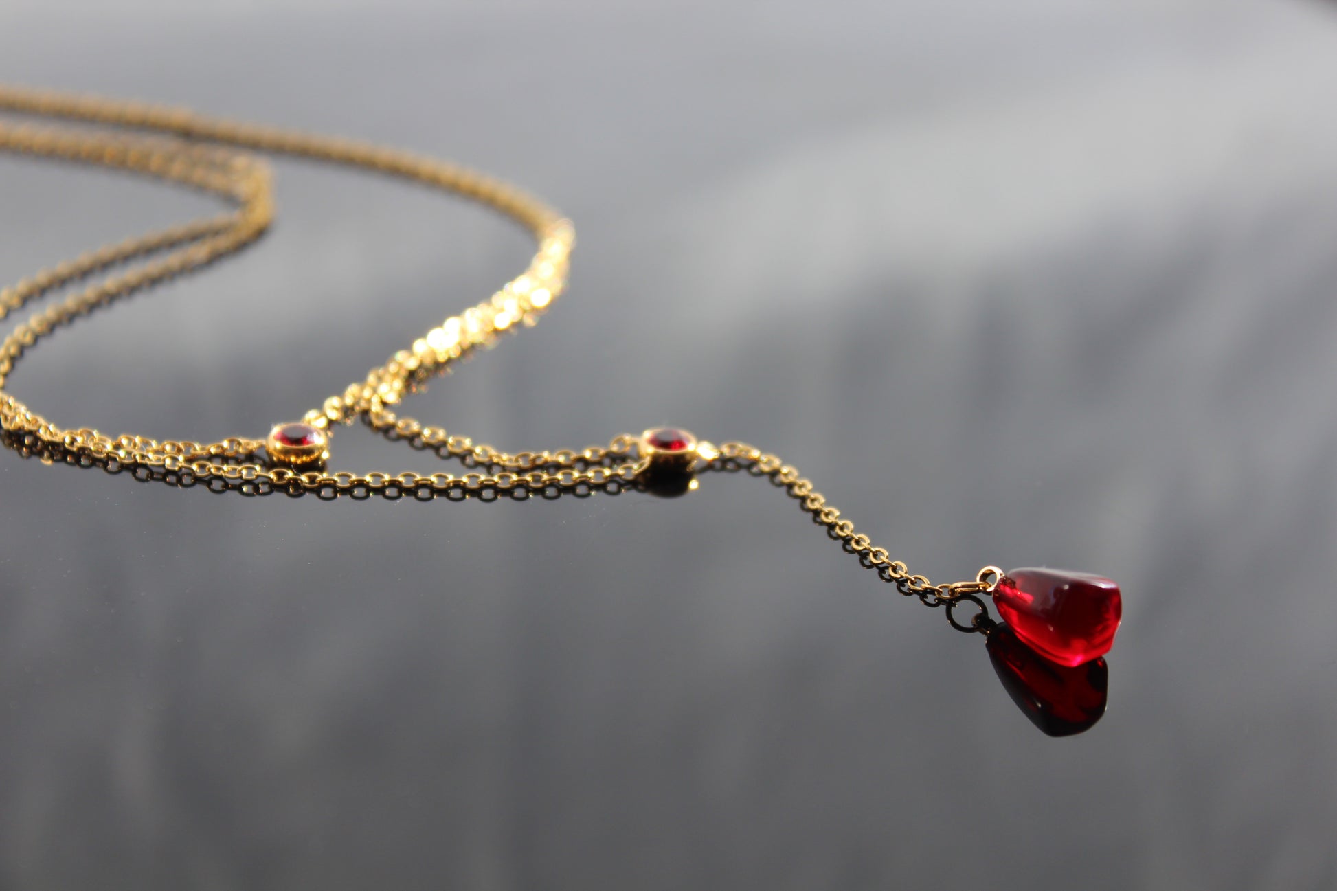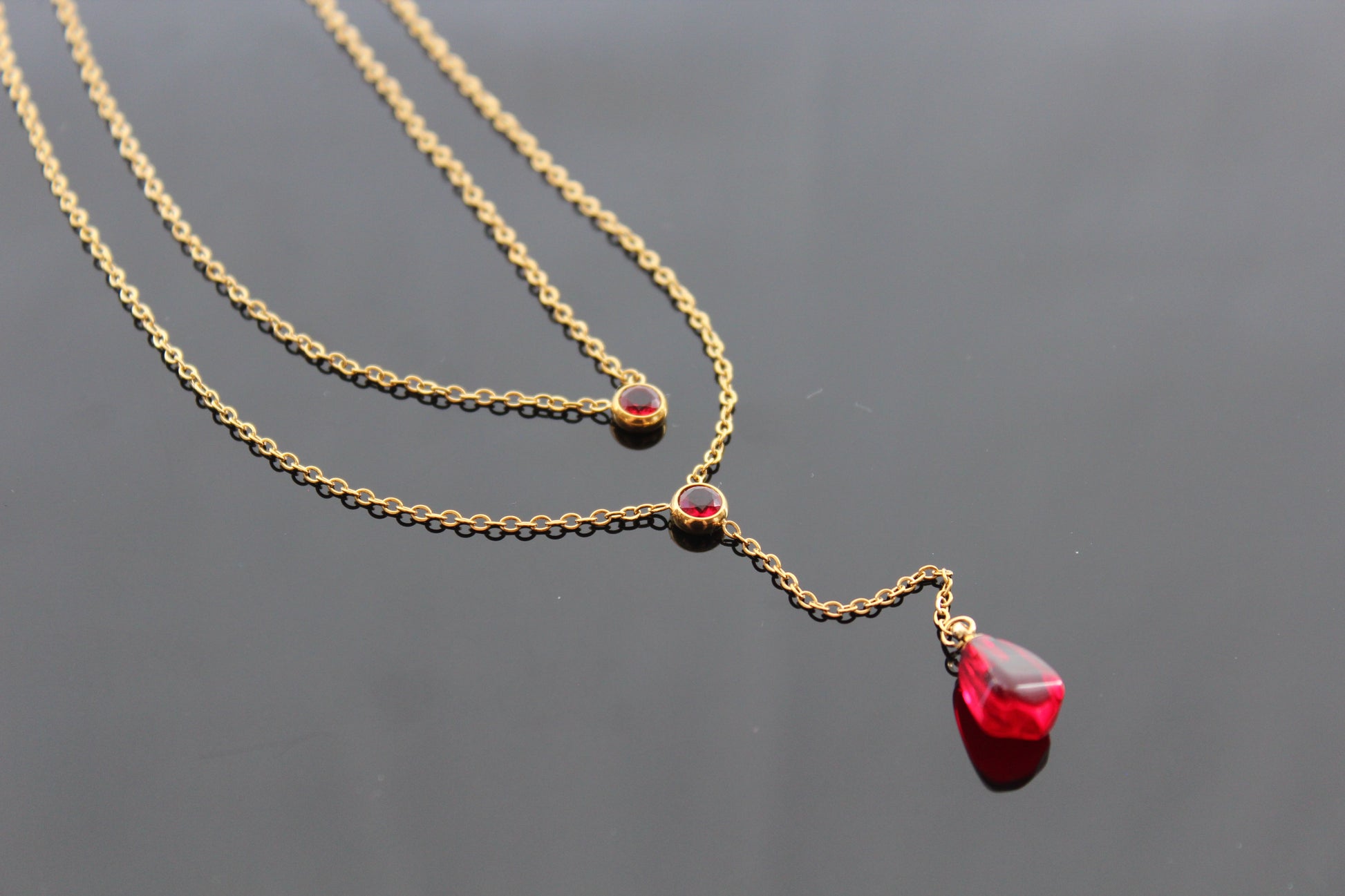 Discover the captivating beauty of our Gold Plated Stainless Steel Glass Pomegranate Seed Y Necklace, a stunning piece that effortlessly blends modern design with natural inspiration.