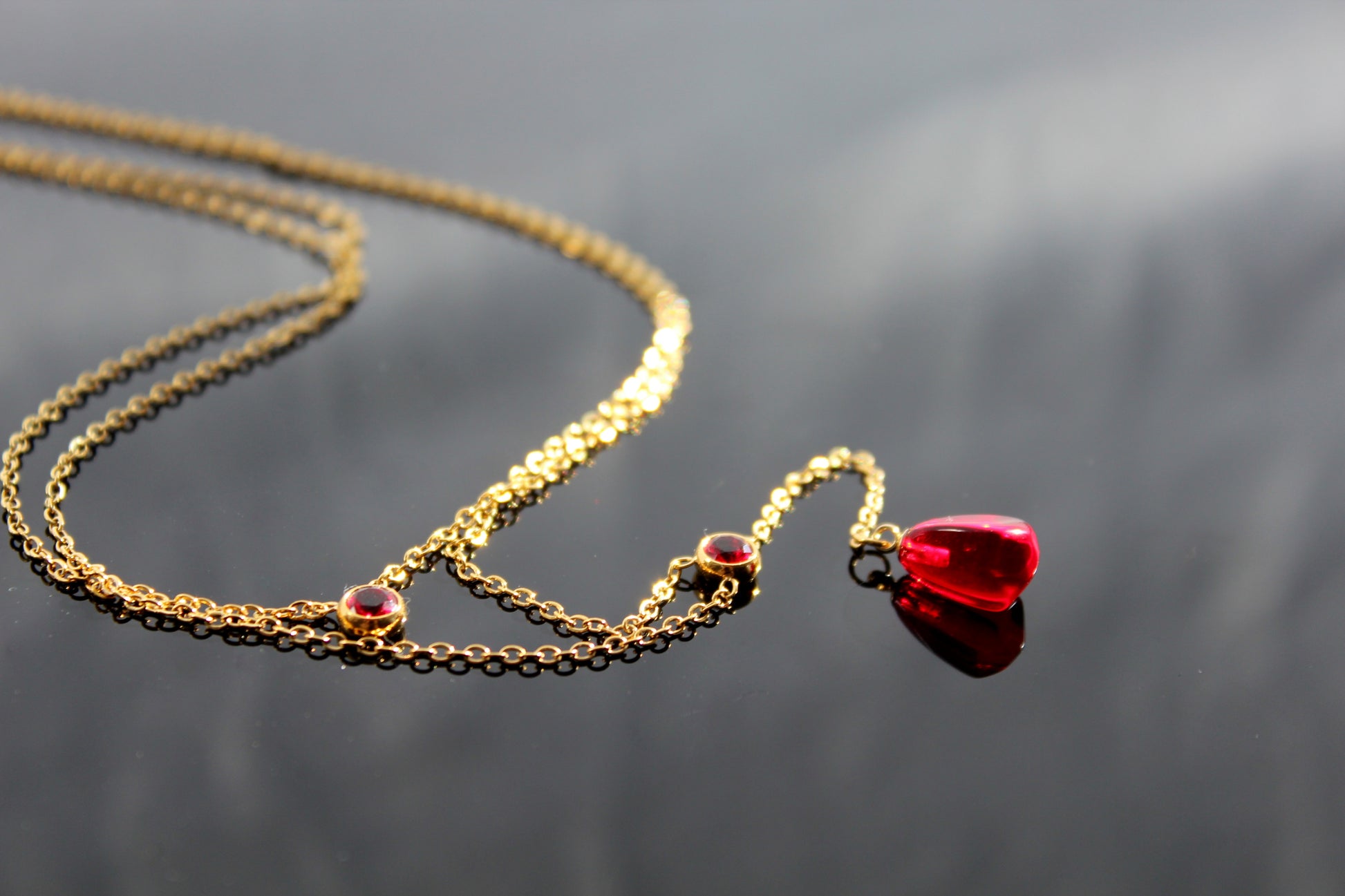 Eye-Catching Pendant: A meticulously crafted glass pomegranate seed pendant, its rich crimson hue adding a vibrant pop of color.