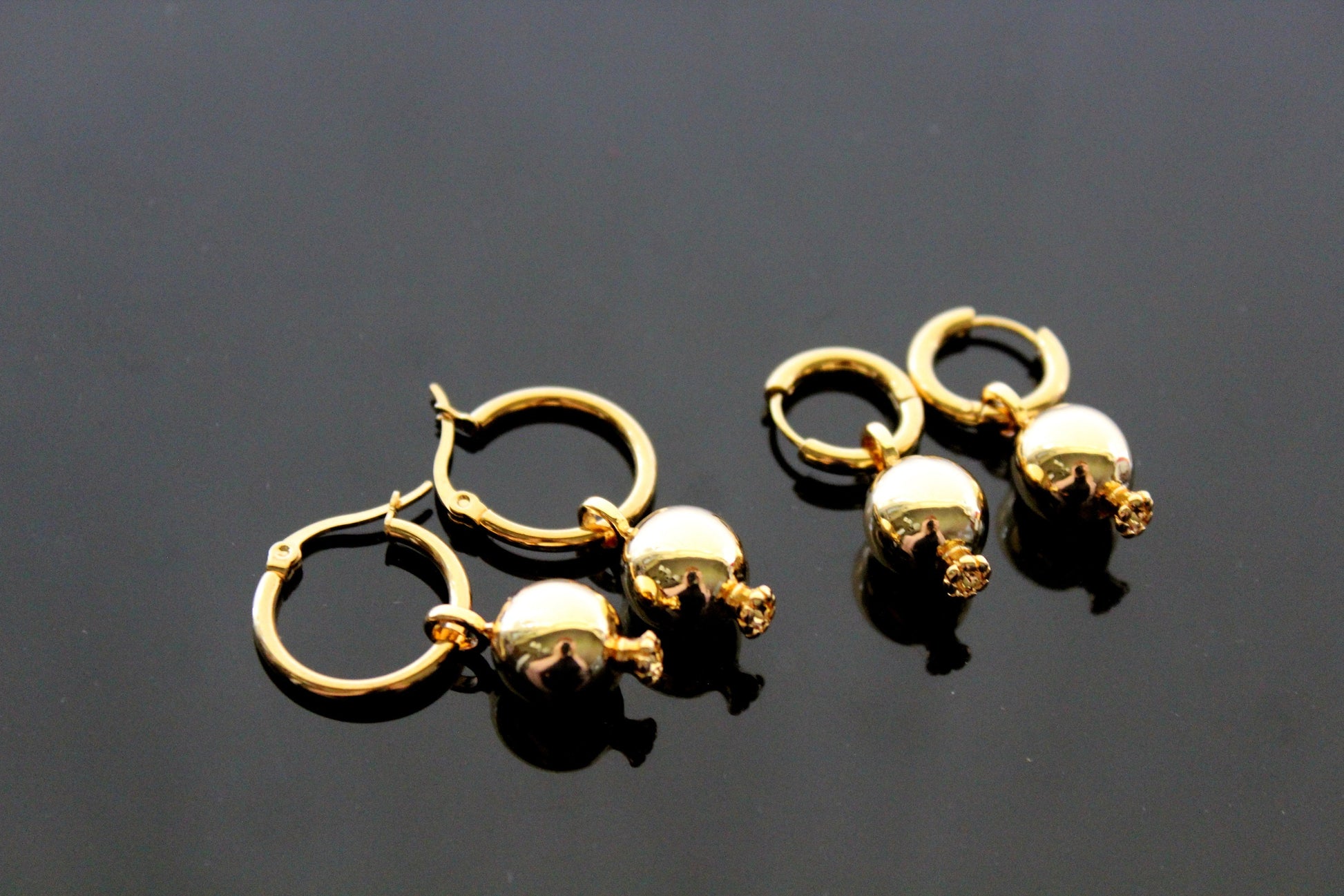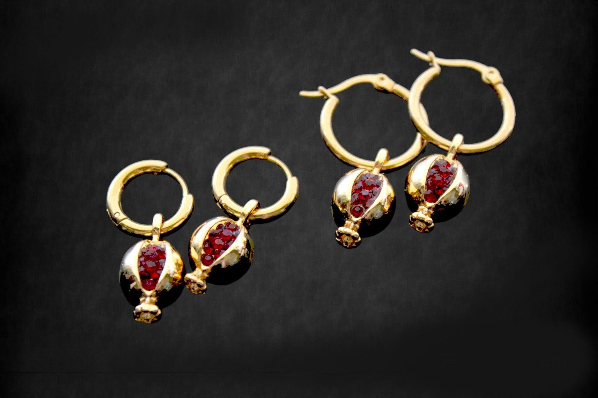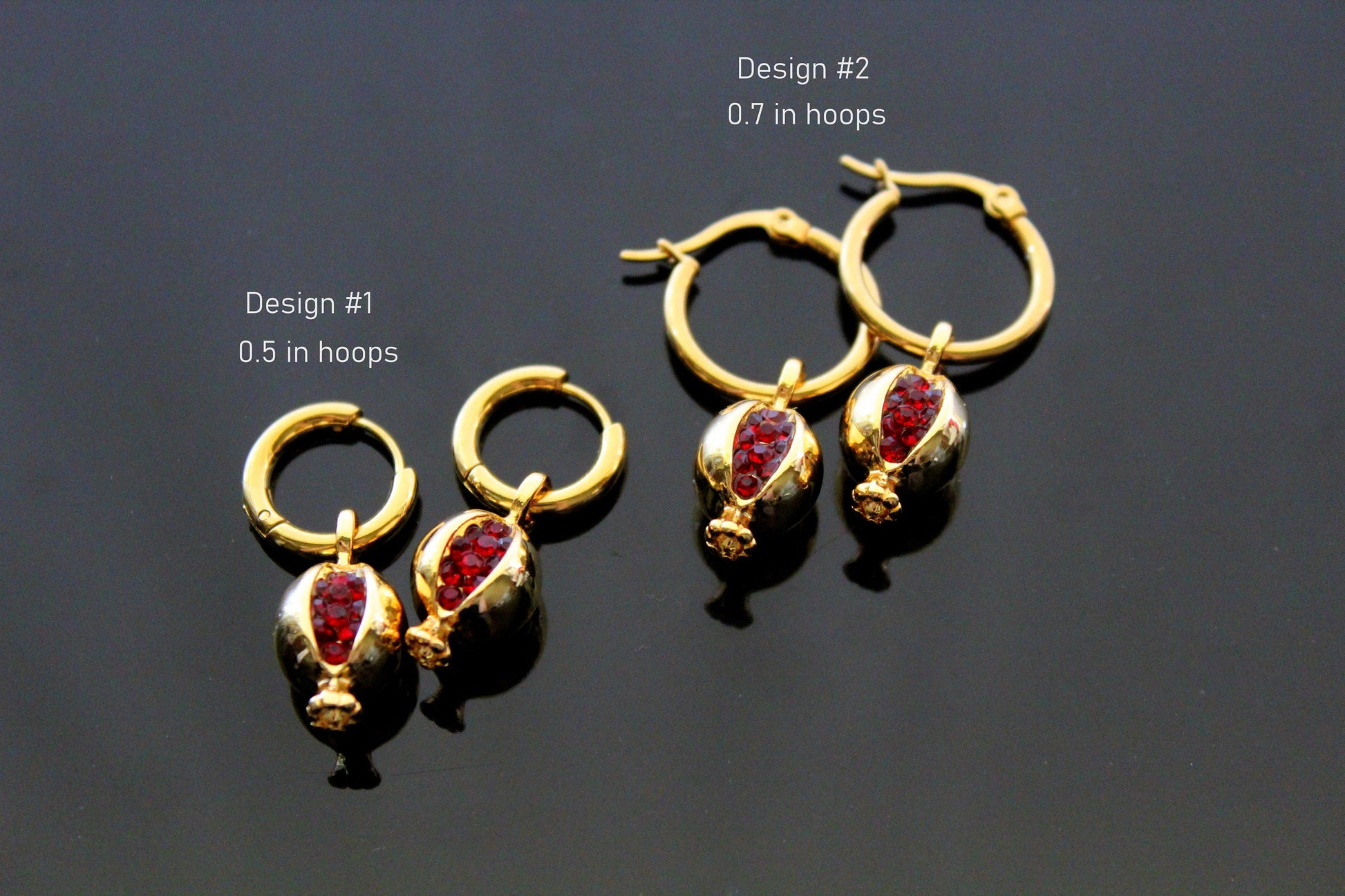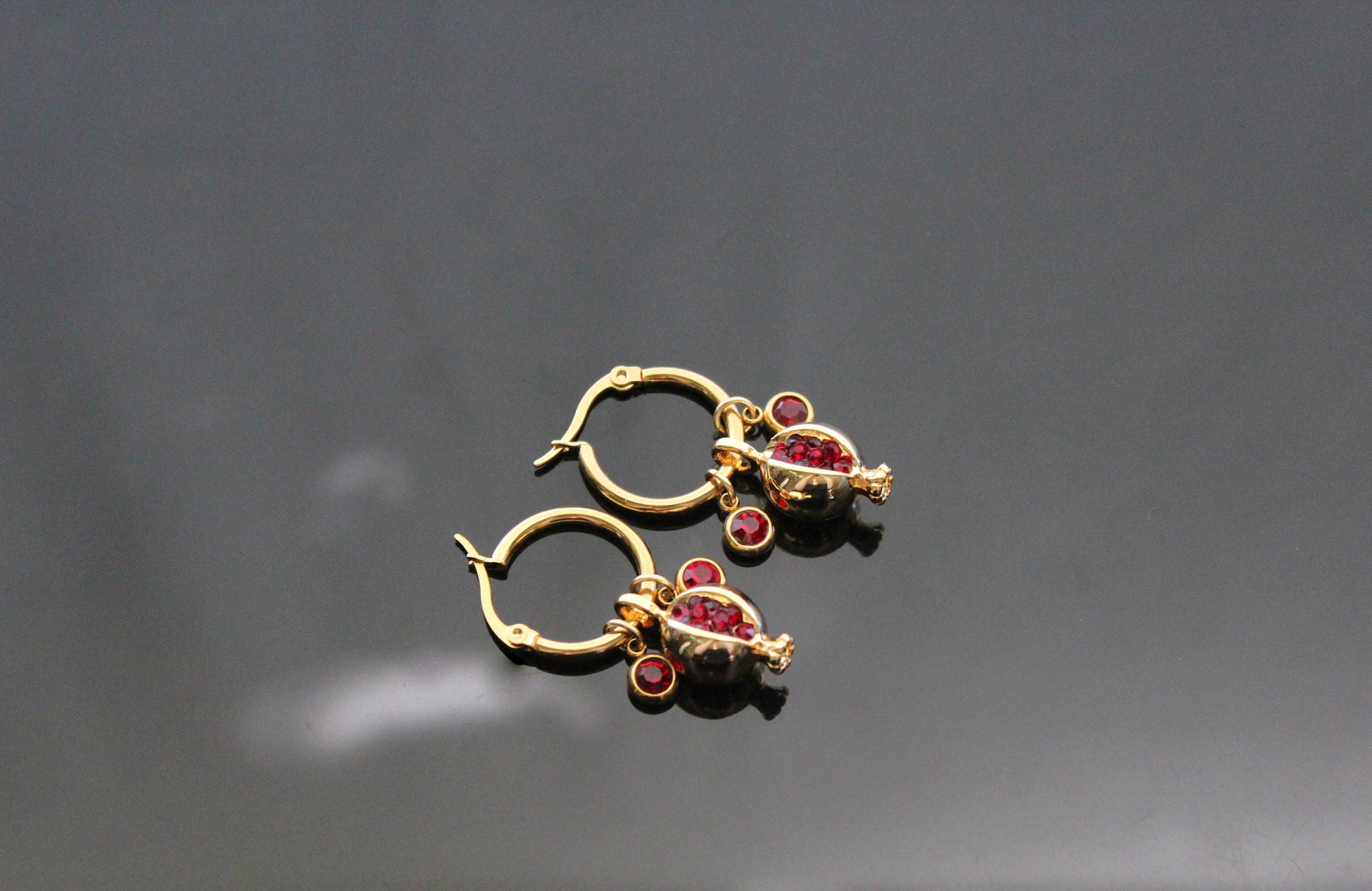 Expertly crafted, these gold plated pomegranate hoop earrings feature vibrant red zircons for a pop of color. A perfect gift for pomegranate lovers, these earrings add a touch of luxury to any outfit. Made with precision and attention to detail, they are a must-have for any jewelry collection.