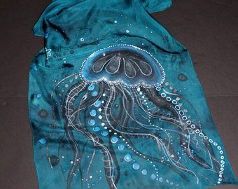 Hand dyed and hand painted jellyfish, marine ocean silk scarf