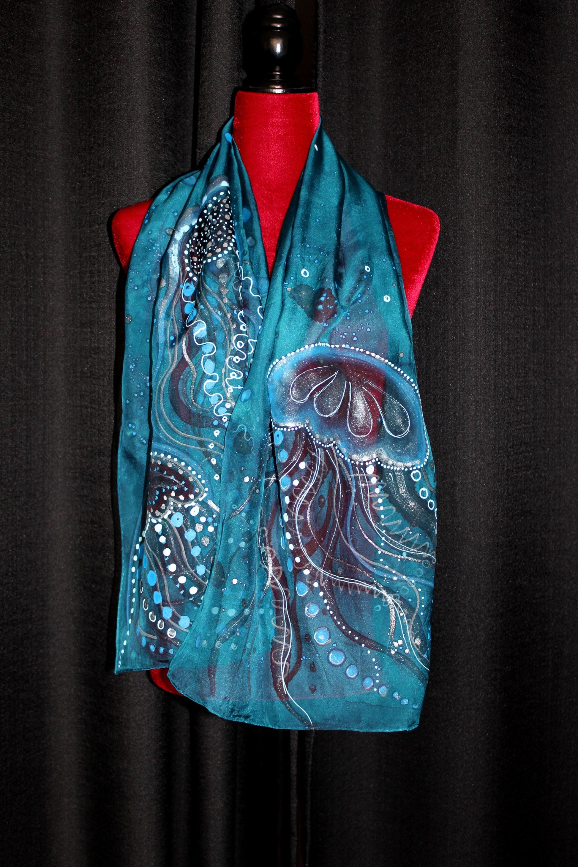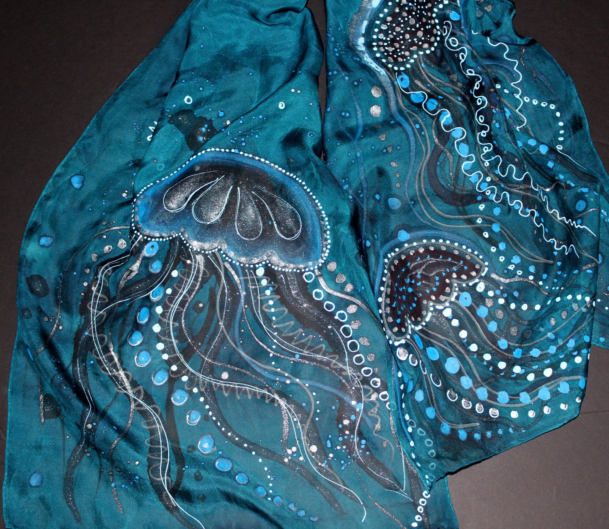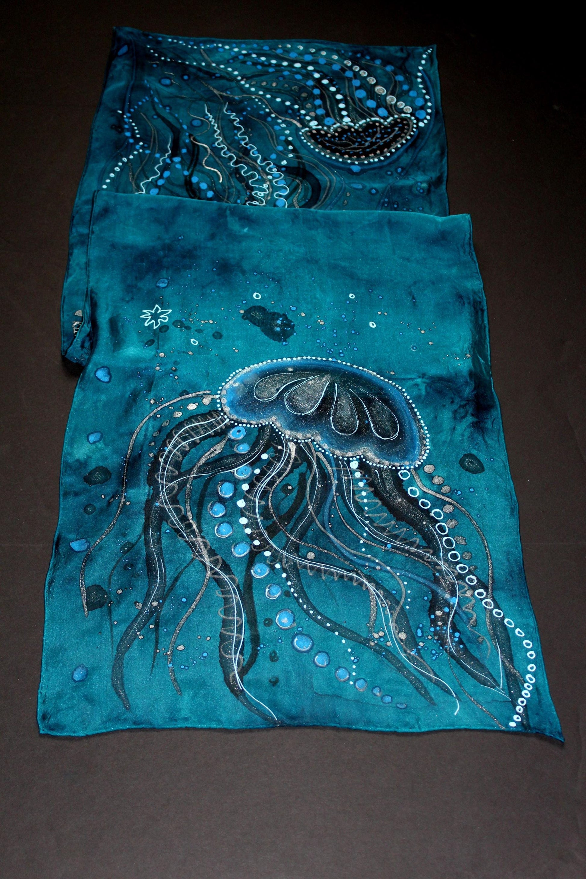 This hand-painted silk scarf features a striking design inspired by jellyfish, rendered in shades of deep turquoise, silver, and blue. The jellyfish motifs are intricately detailed, with fluid, organic lines mimicking the graceful movements of their tendrils. The tentacles are adorned with small dots and circular patterns in contrasting white, silver, and black, giving the impression of underwater bubbles and light reflections. The overall theme captures the ethereal beauty of ocean life, with the jellyfish floating serenely across the rich teal background. This scarf combines artistry and nature, making it an elegant accessory for those who love unique, ocean-inspired designs.