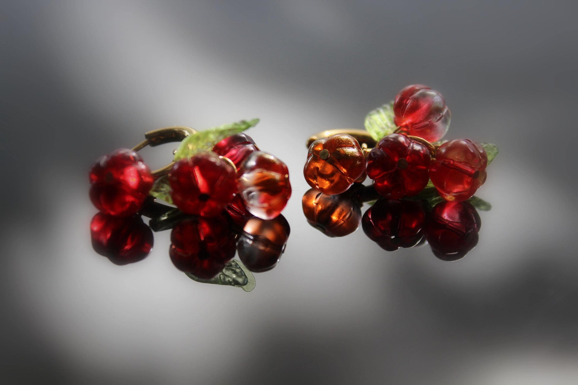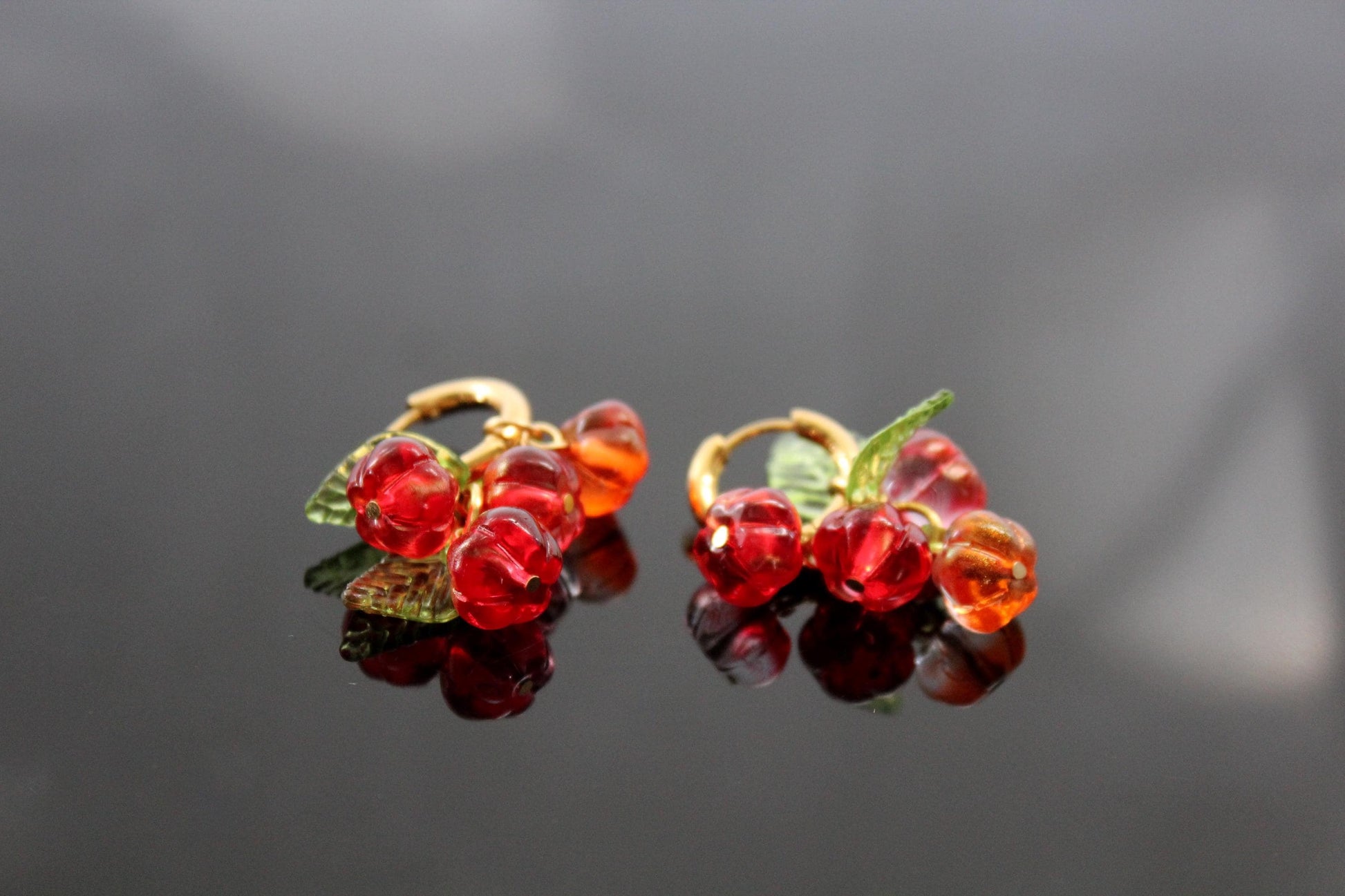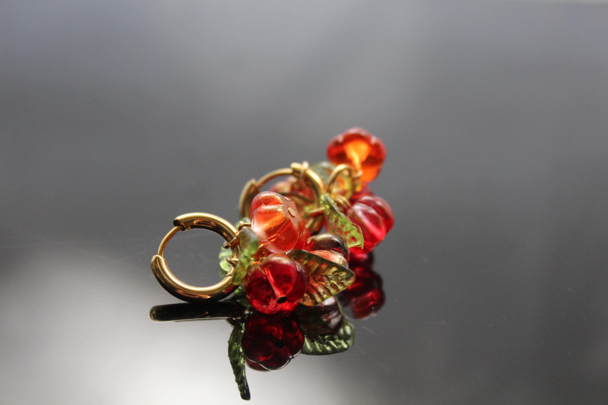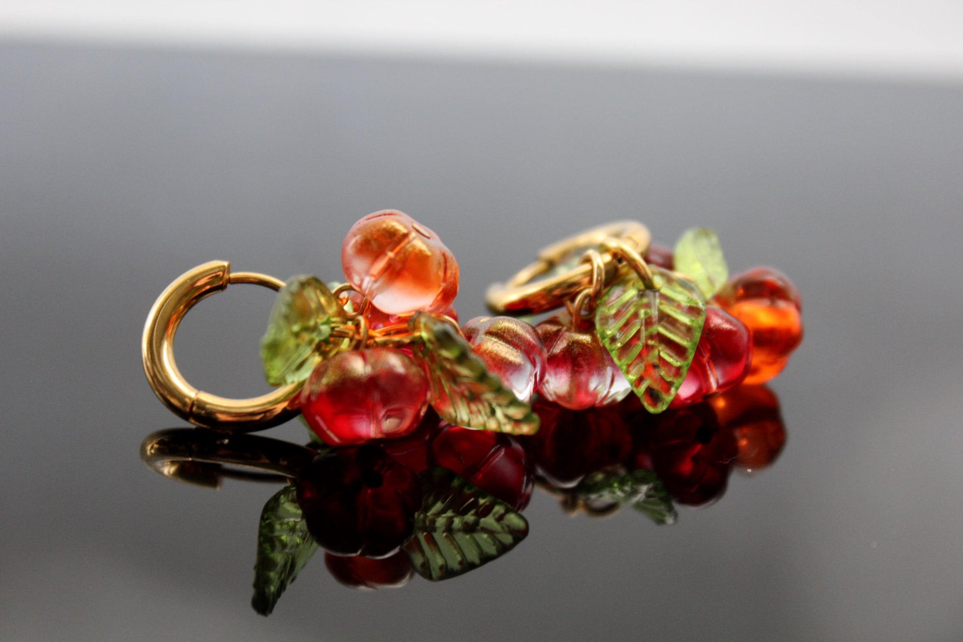 Embrace the spirit of fall with these whimsical pumpkin-inspired earrings, carefully crafted with vibrant glass beads. The translucent orange and red glass beads resemble miniature pumpkins, each detailed with lifelike green plastic leaves to create a fresh, harvest-inspired look.