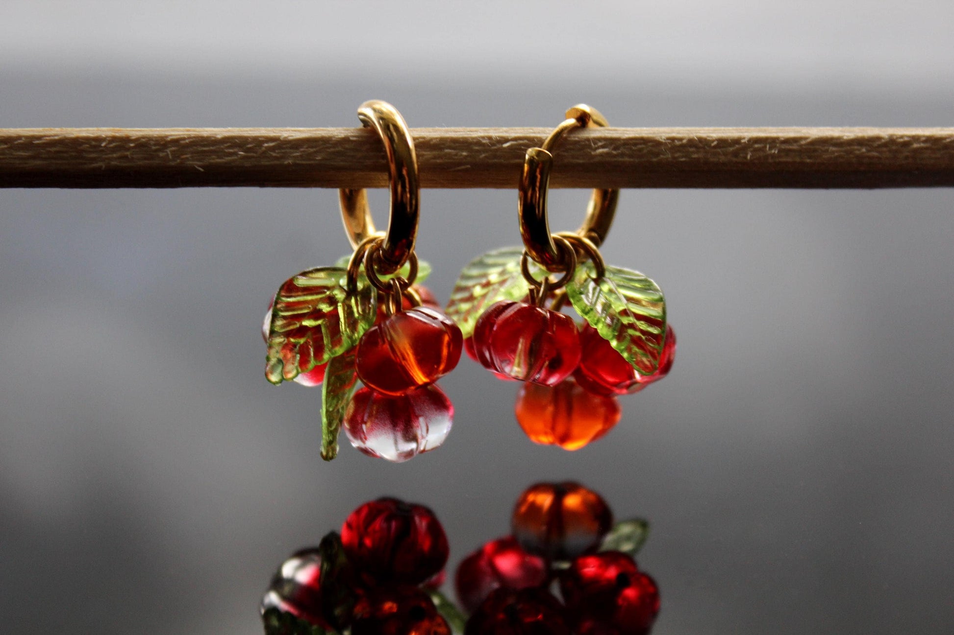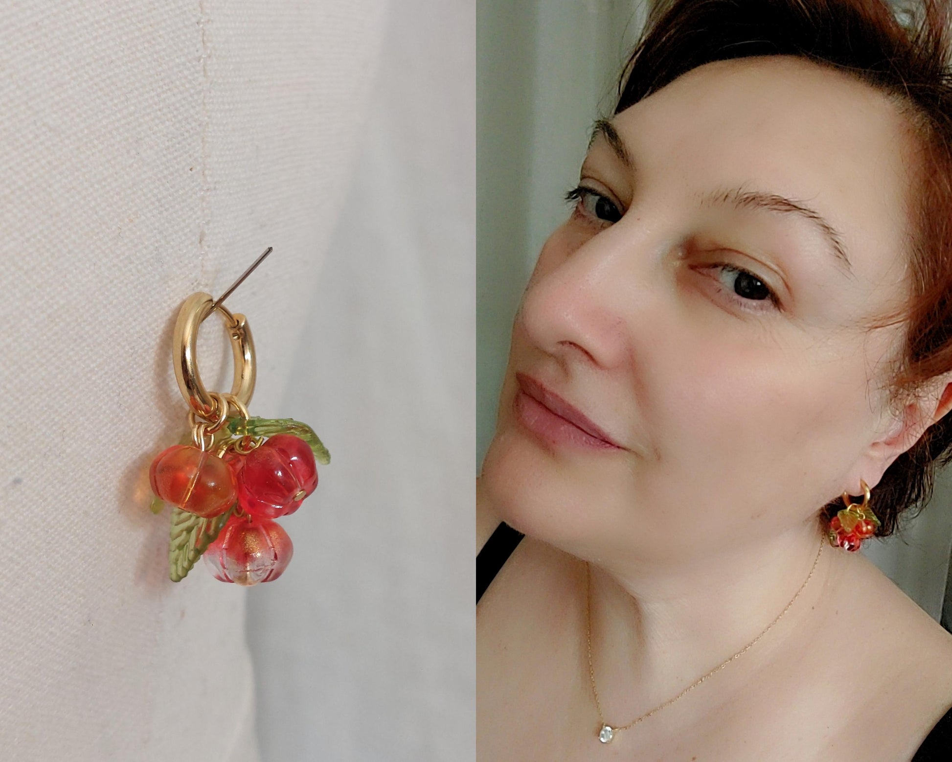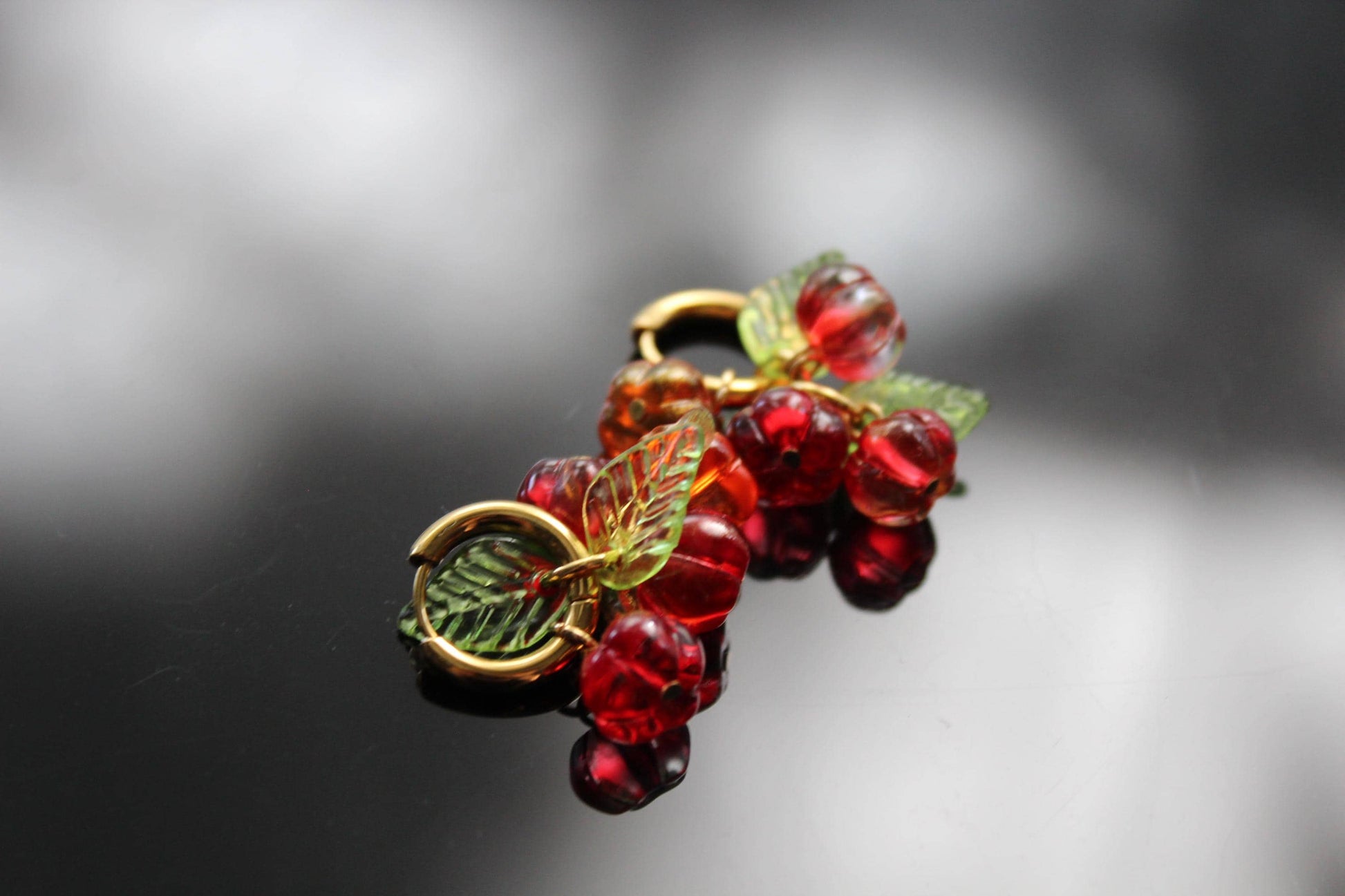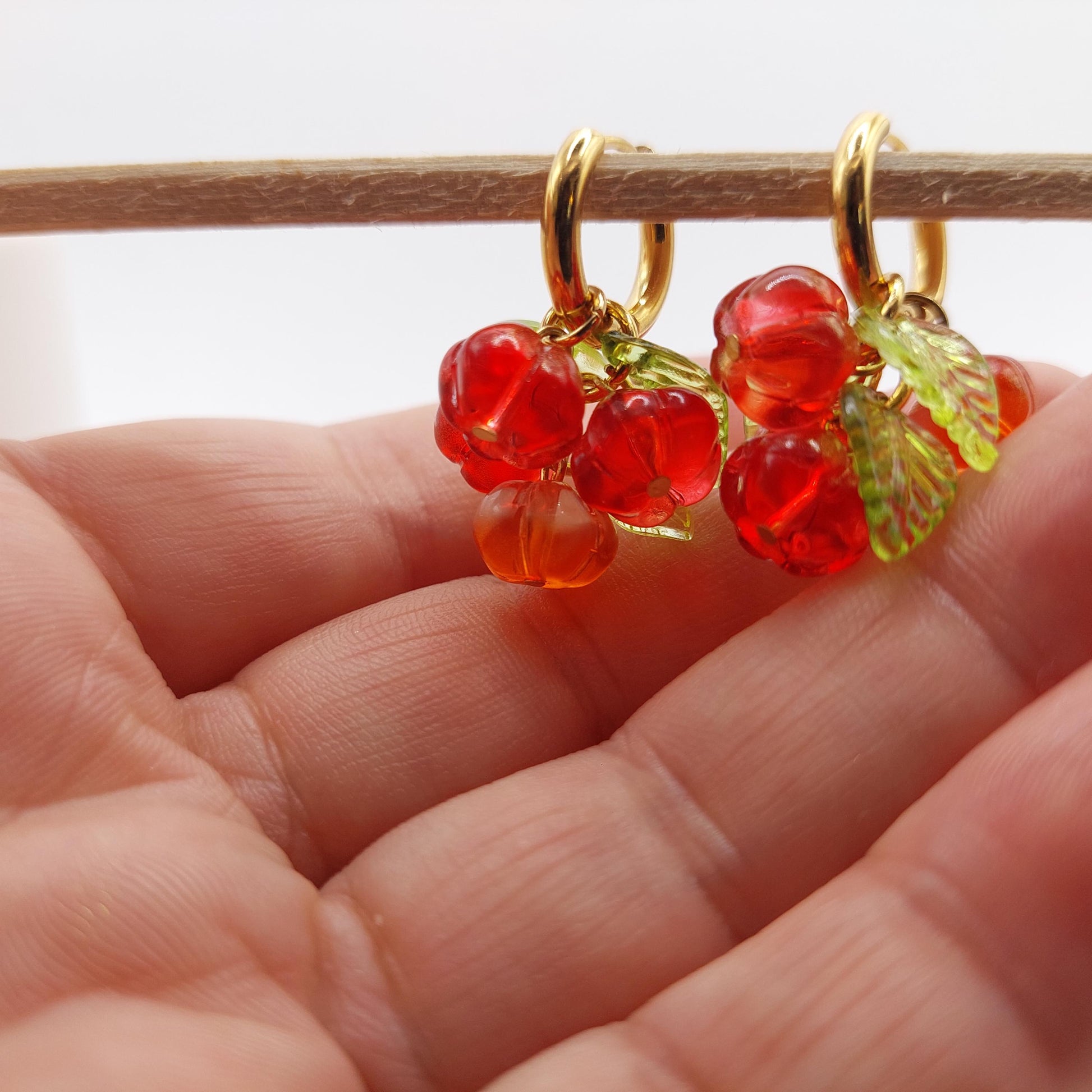 Design: The earrings feature glass beads in various shades of orange and red, perfectly resembling mini pumpkins. Each bead is paired with intricate green plastic leaves that provide a natural and playful touch.