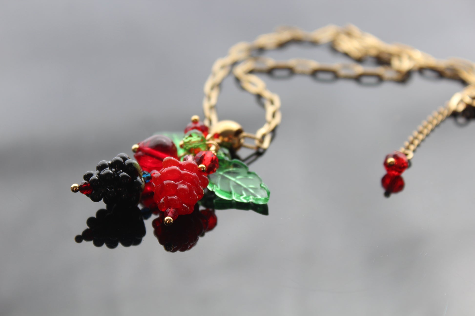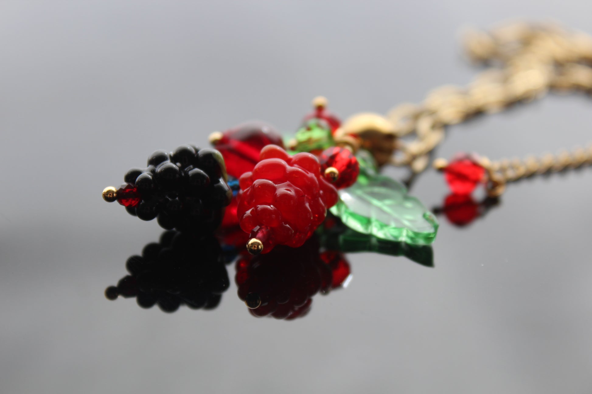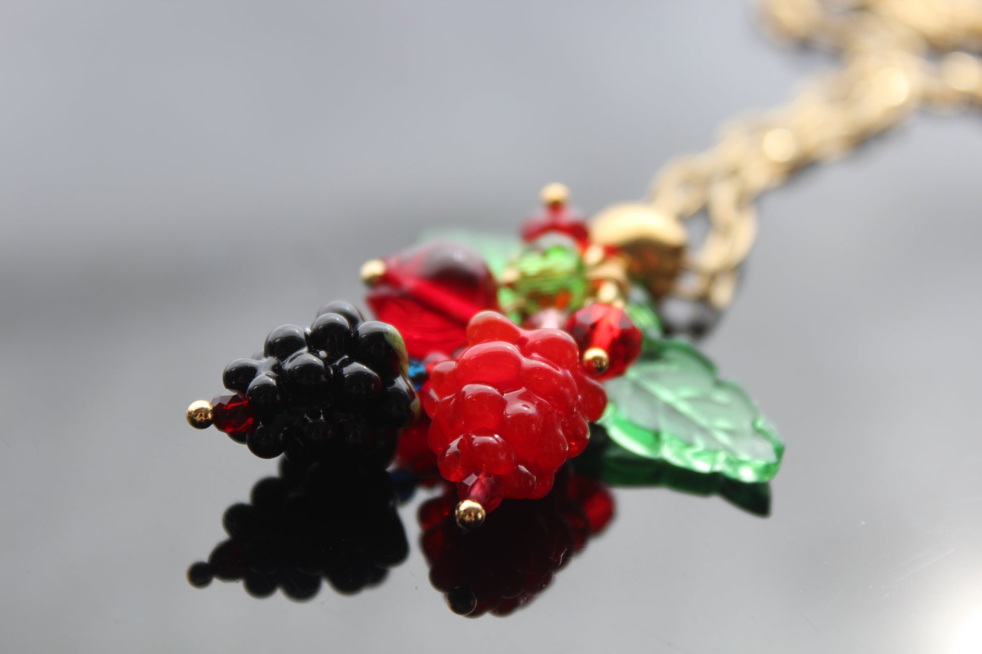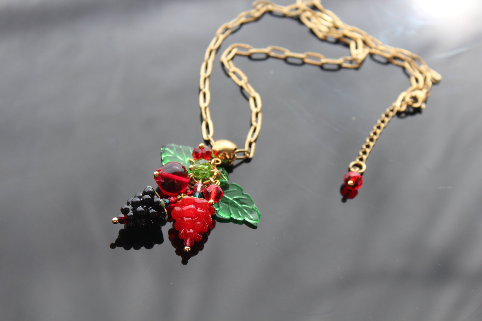 Indulge in the beauty and charm of summer with our handcrafted glass raspberry necklace. The intricate cluster of glass berries, including a rich red raspberry and deep black grape, is complemented by translucent green leaves for a refreshing touch. This unique piece captures the best of glass artistry and nature.