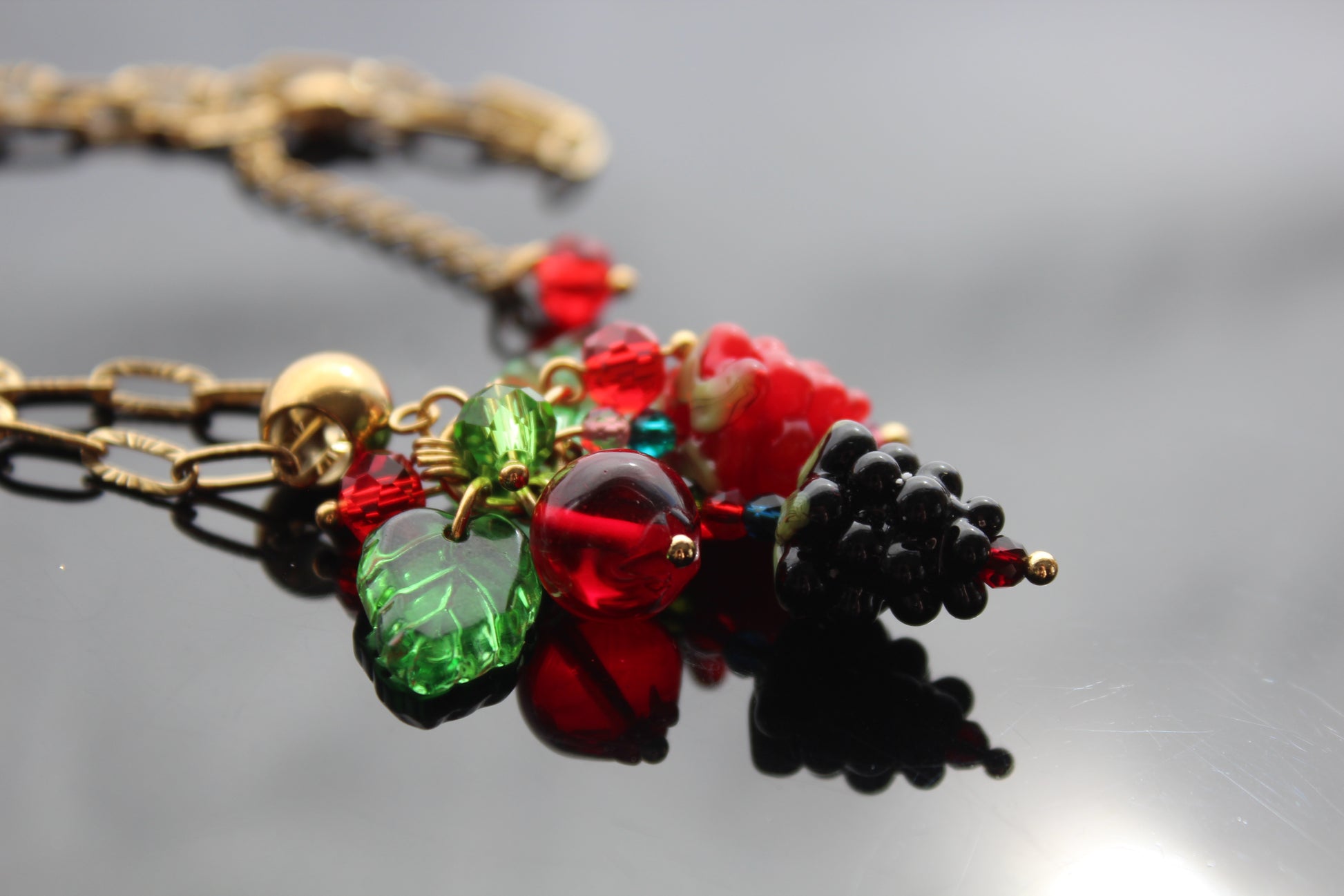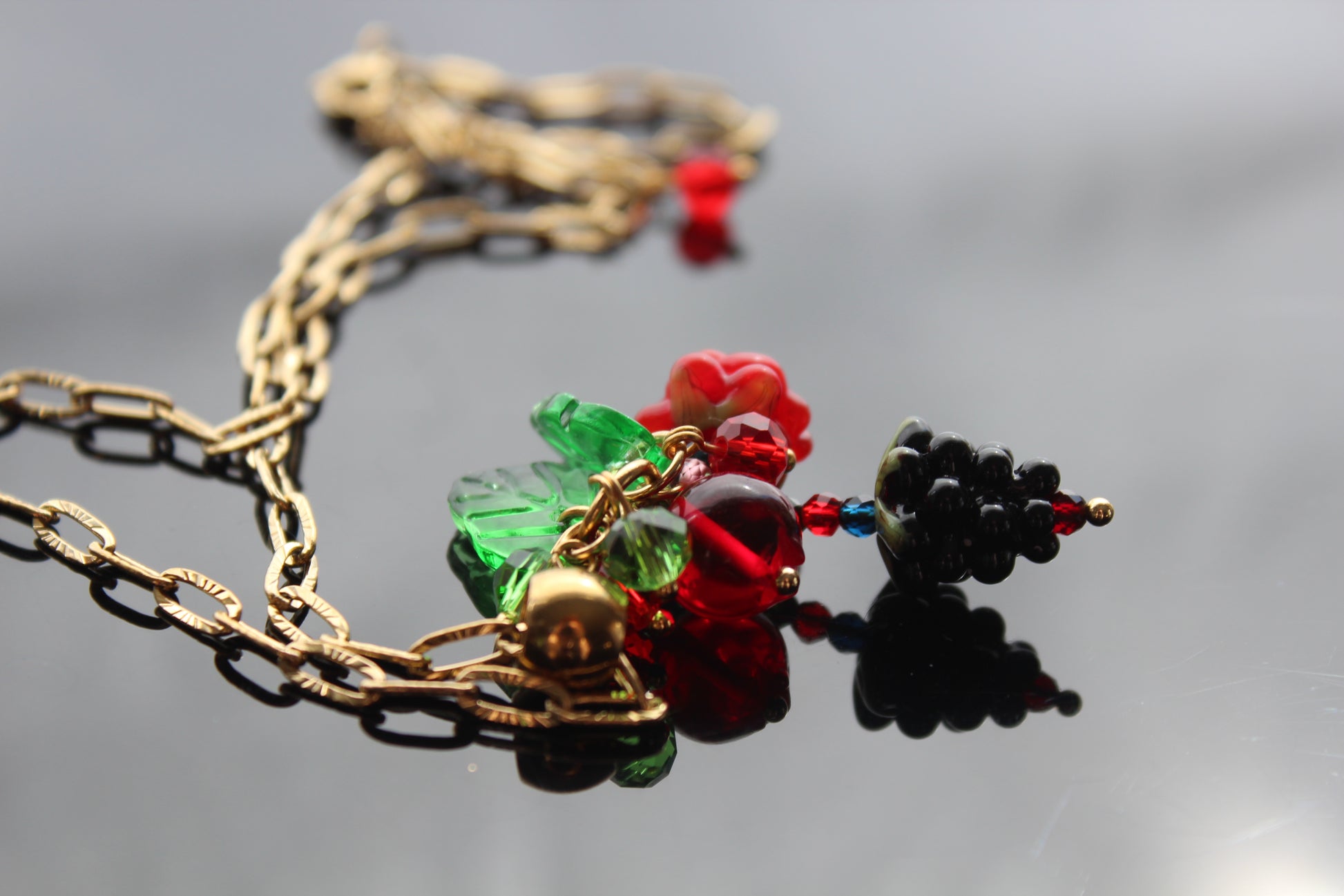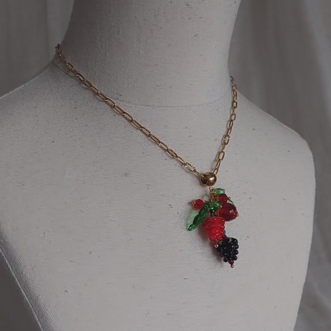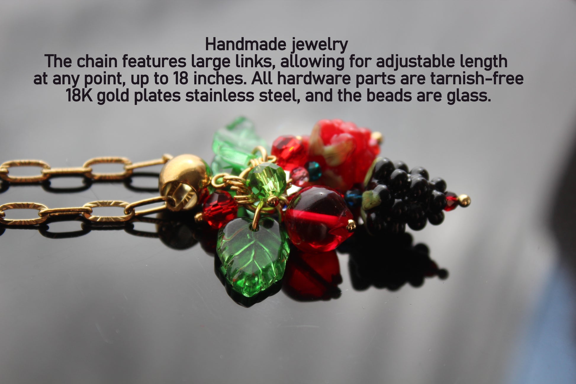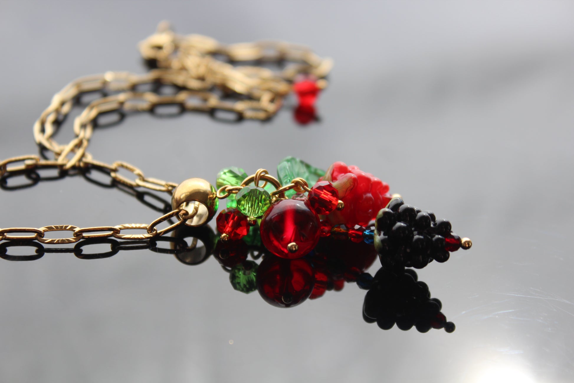 Indulge in the beauty and charm of summer with our handcrafted glass raspberry necklace. The intricate cluster of glass berries, including a rich red raspberry and deep black grape, is complemented by translucent green leaves for a refreshing touch. This unique piece captures the best of glass artistry and nature.