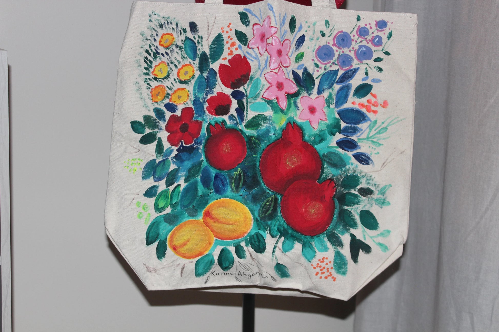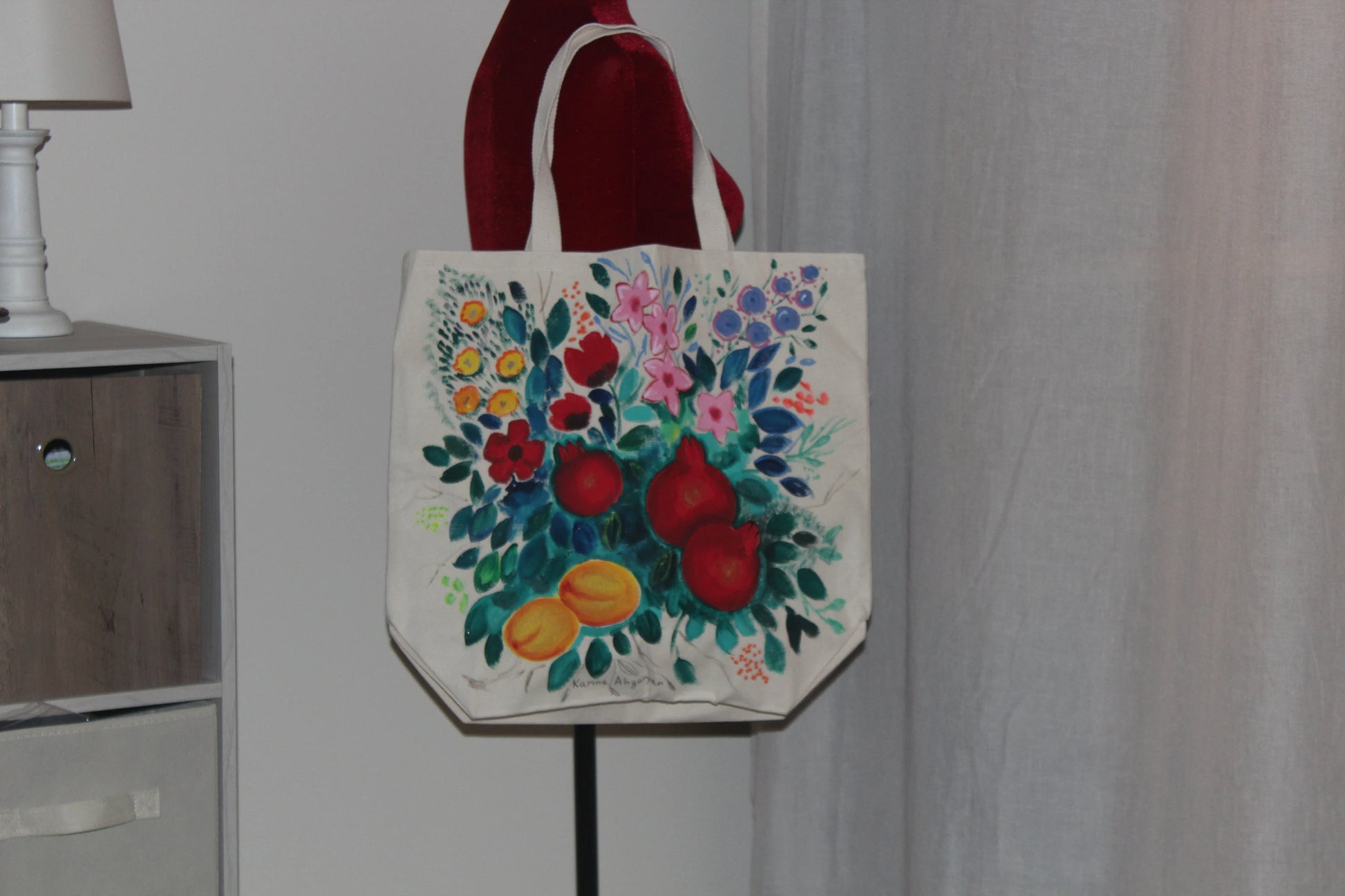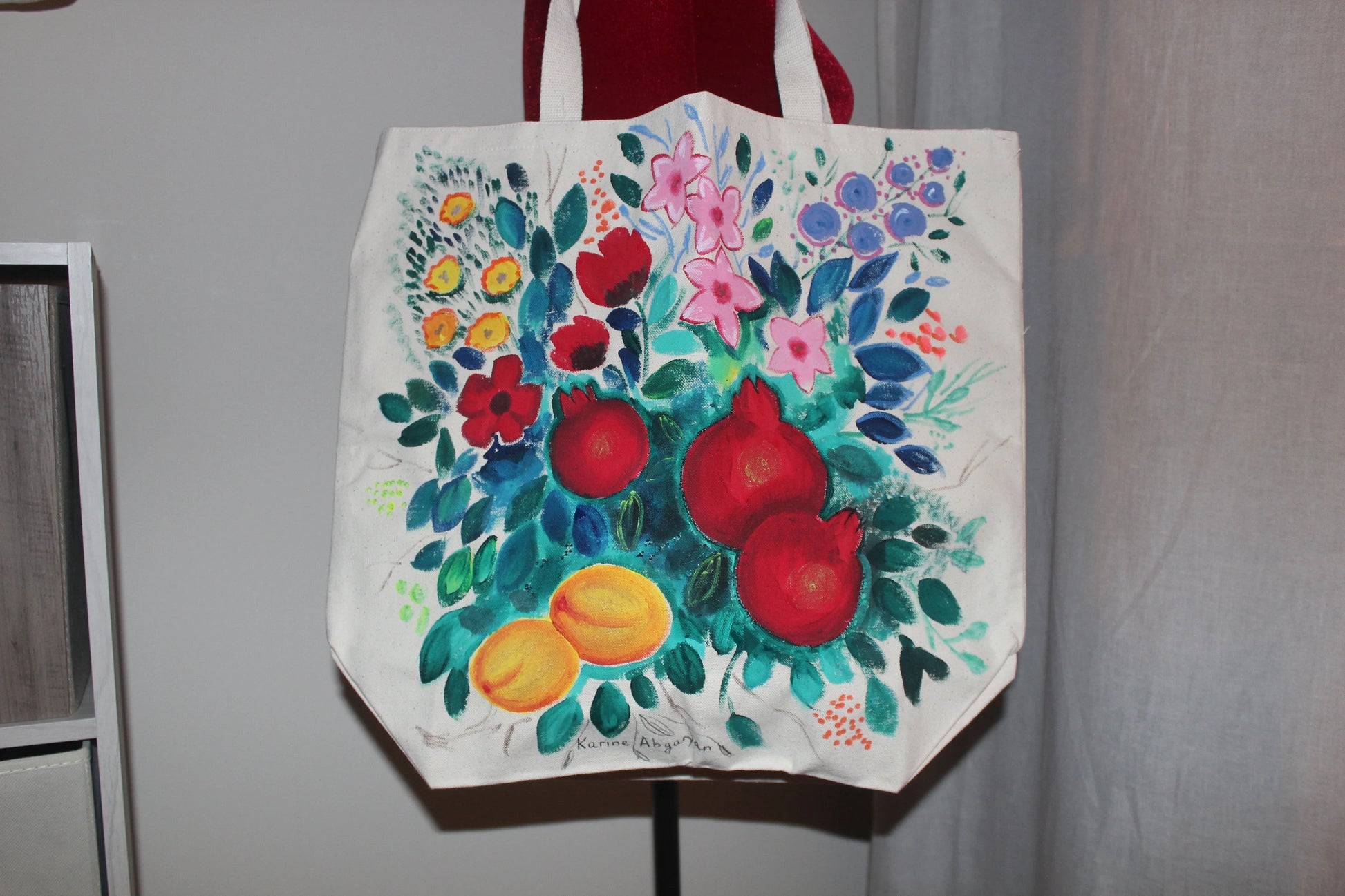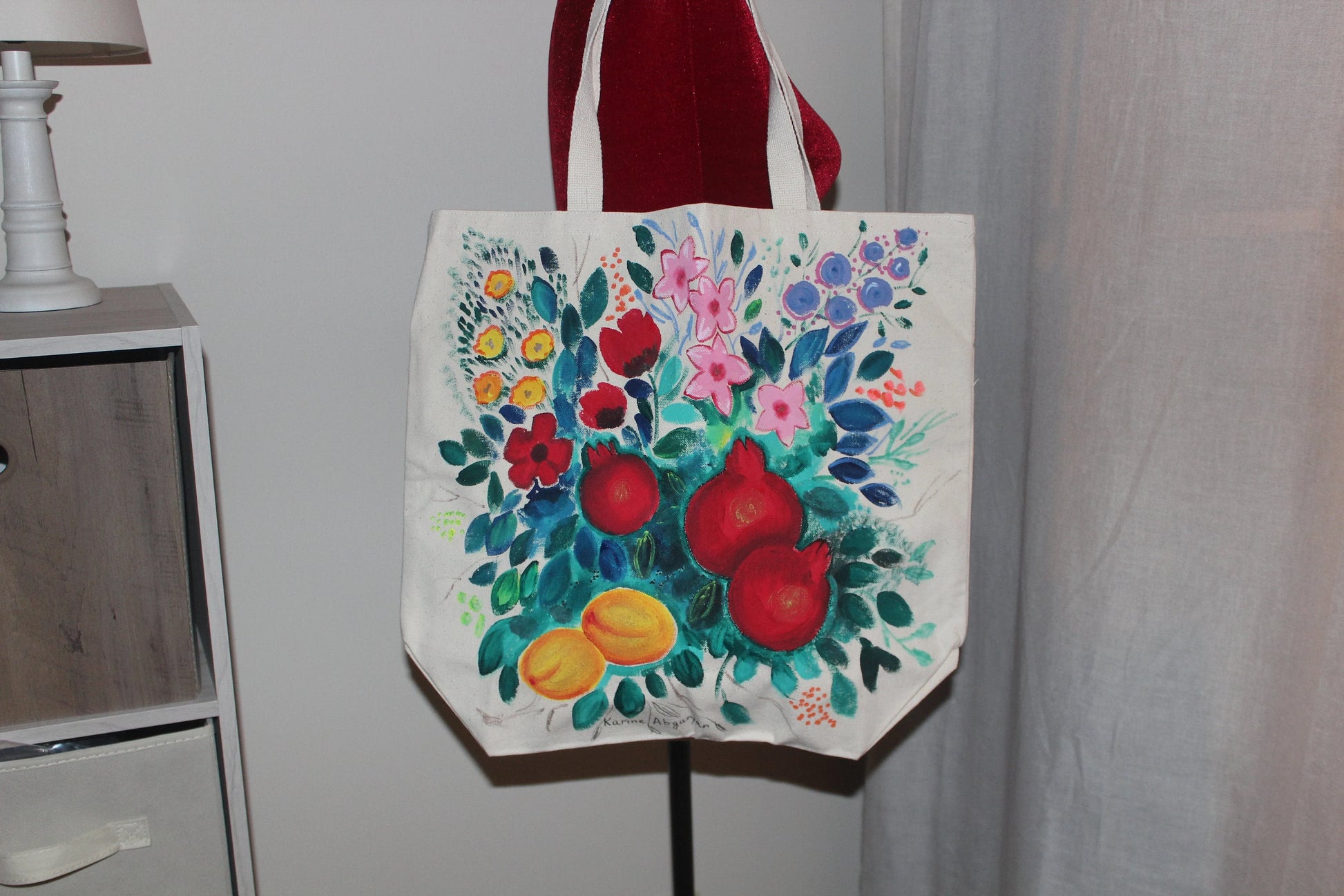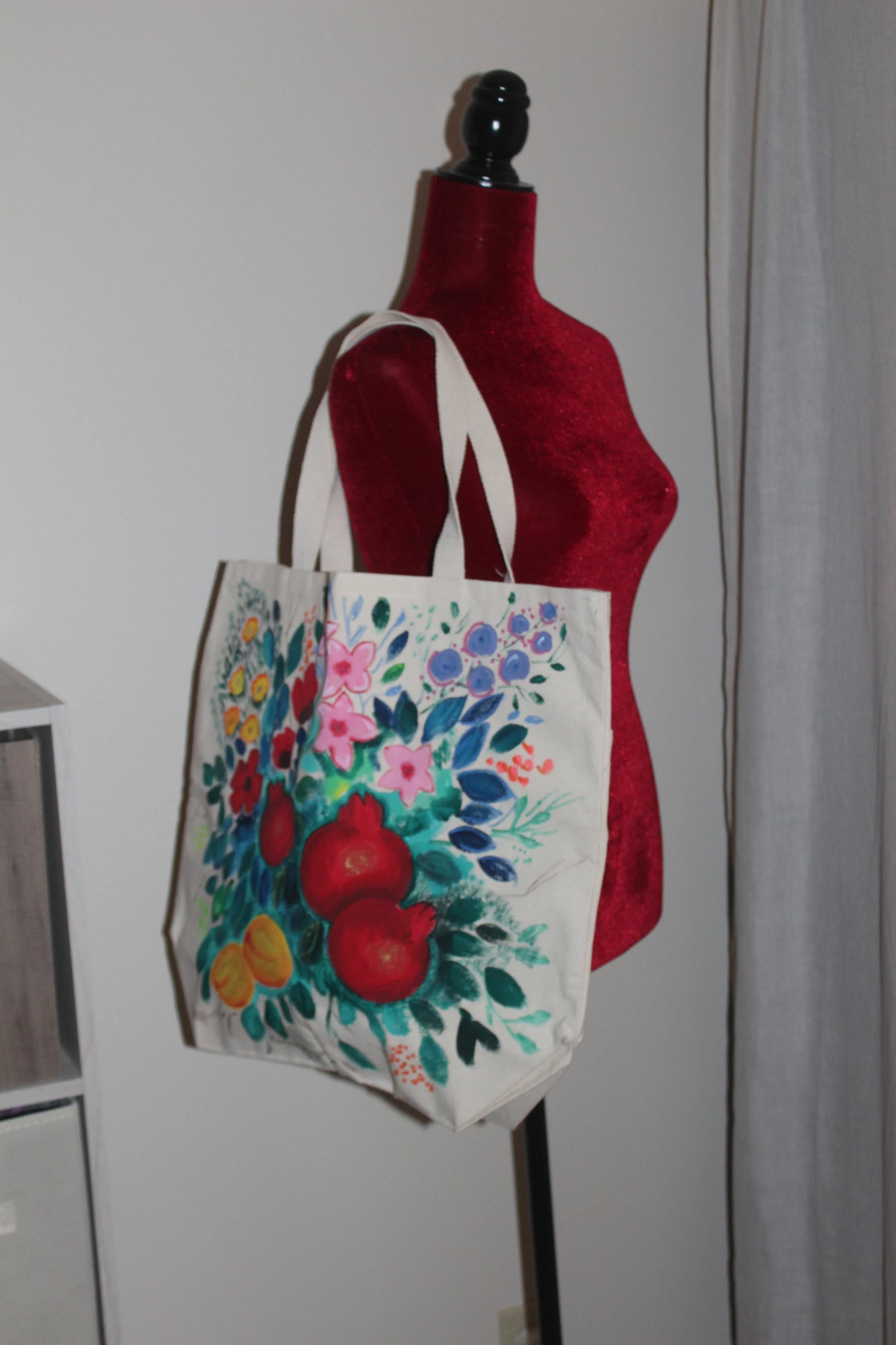 Hand painted heavy duty extra large pomegranate tote bag, grocery bag