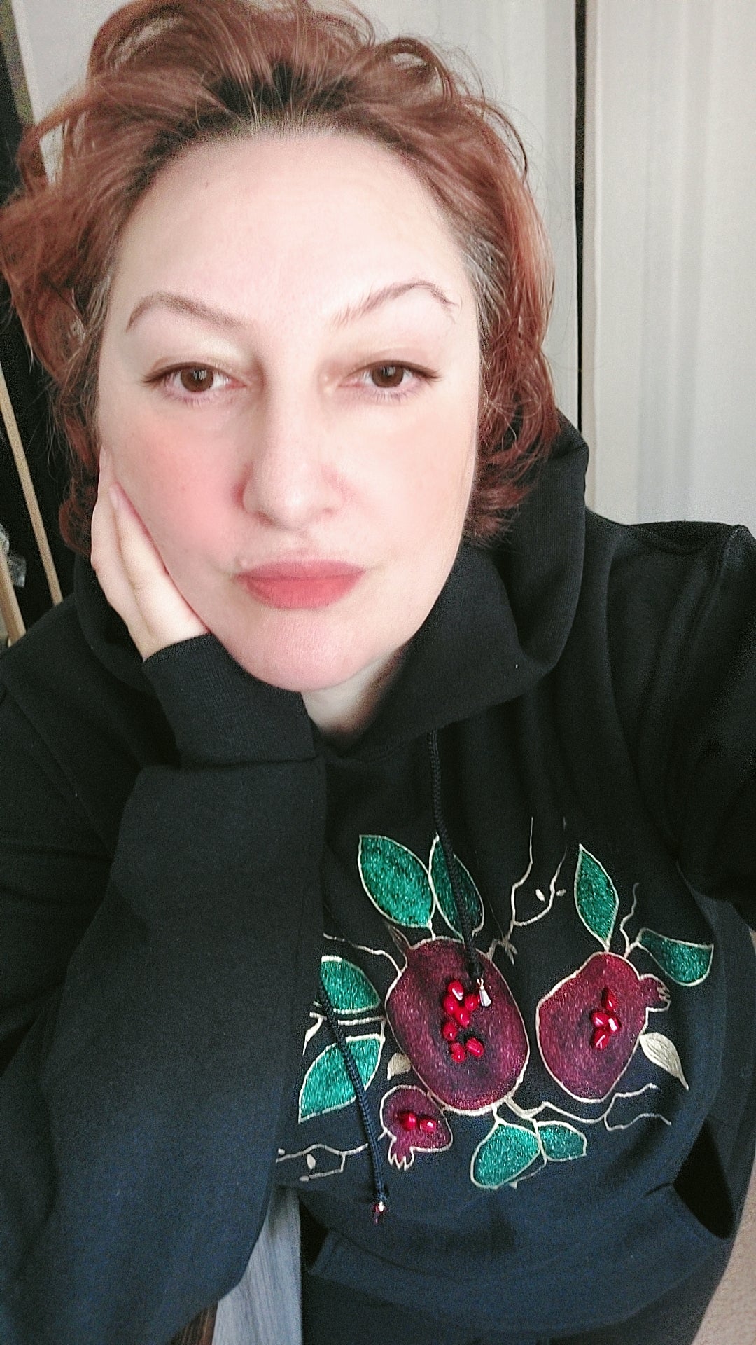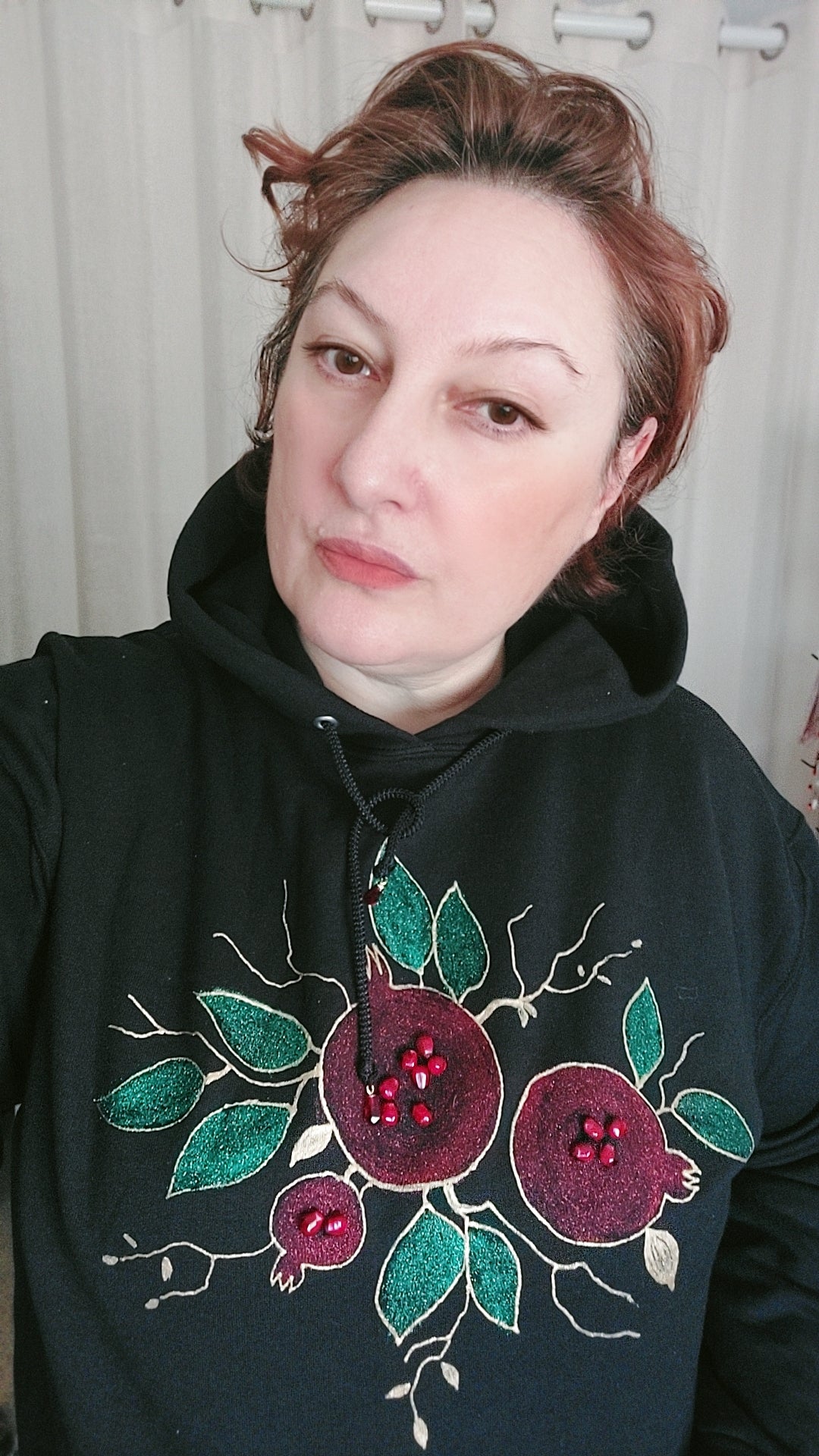 Celebrate the beauty and symbolism of the pomegranate with this handmade, cozy hoodie, featuring a vibrant and festive design. This hoodie showcases red and green sparkling accents, perfect for capturing the New Year and Christmas mood. With its unique pomegranate motif, it’s a standout piece that makes for an ideal holiday gift.