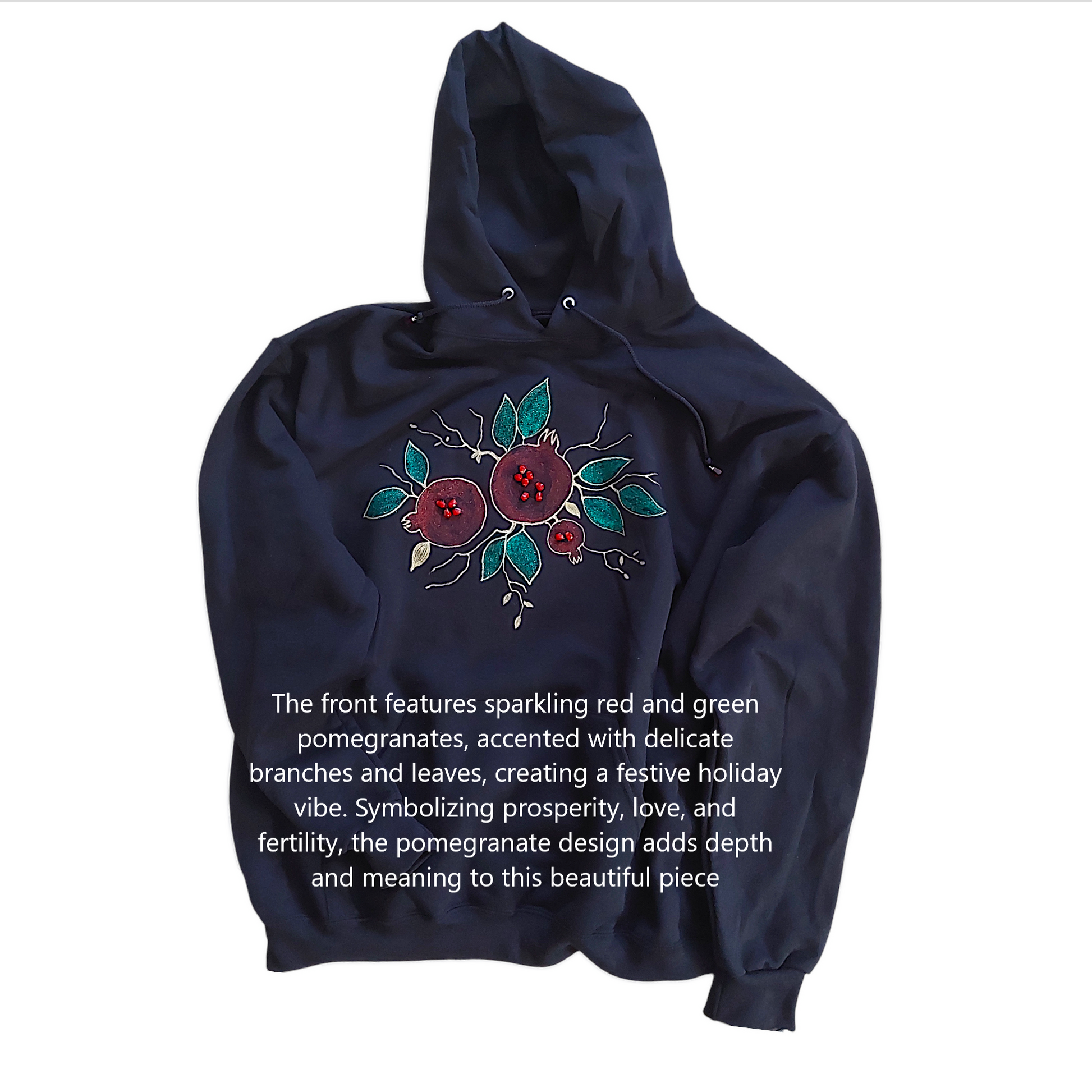 Festive Design: The front features pomegranates adorned with sparkling red and green accents, surrounded by delicate branches and leaves. The colors and sparkles bring a holiday vibe, making this hoodie perfect for the season. The pomegranate symbol, associated with prosperity, love, and fertility, adds depth and meaning to this beautiful piece.
