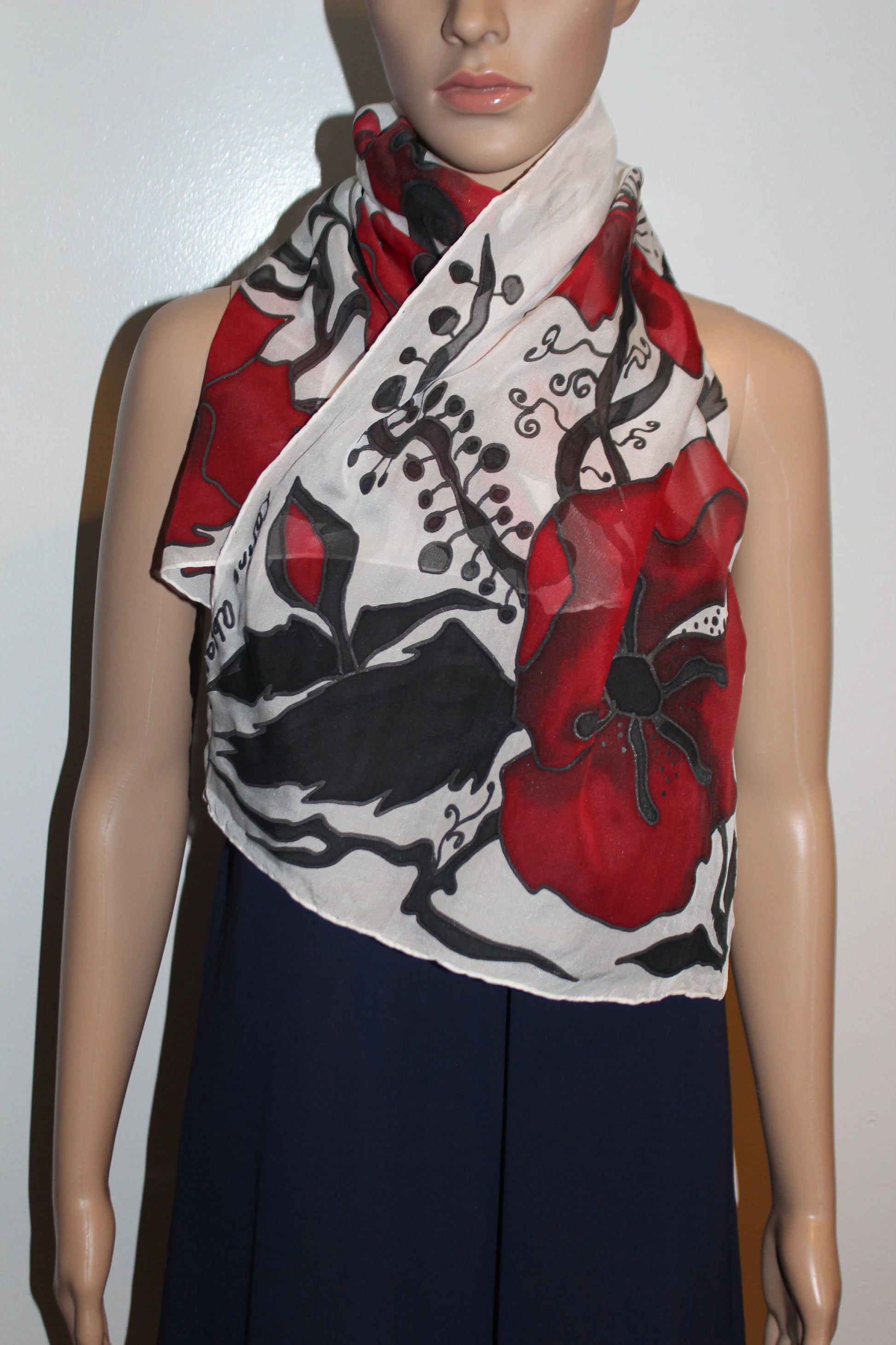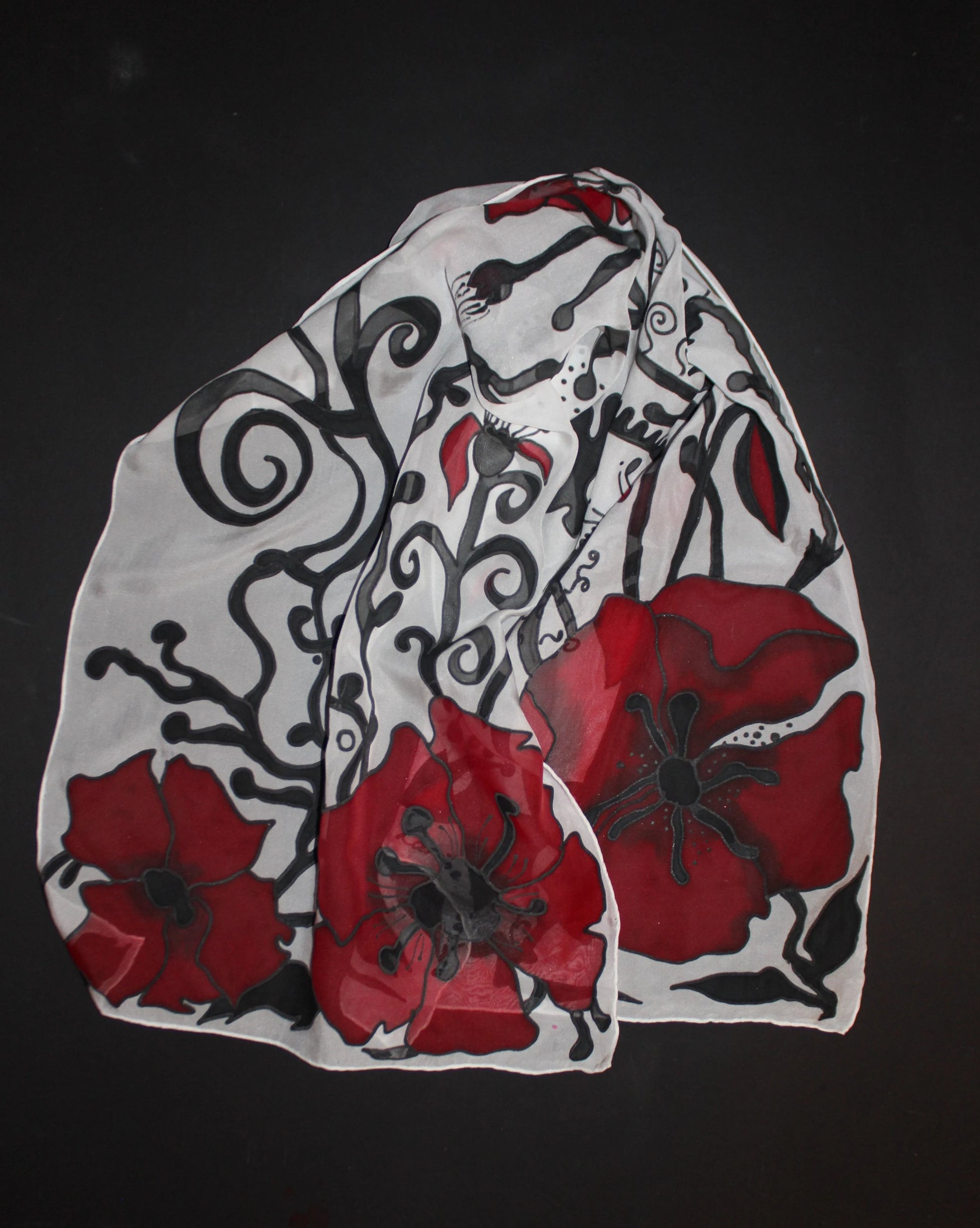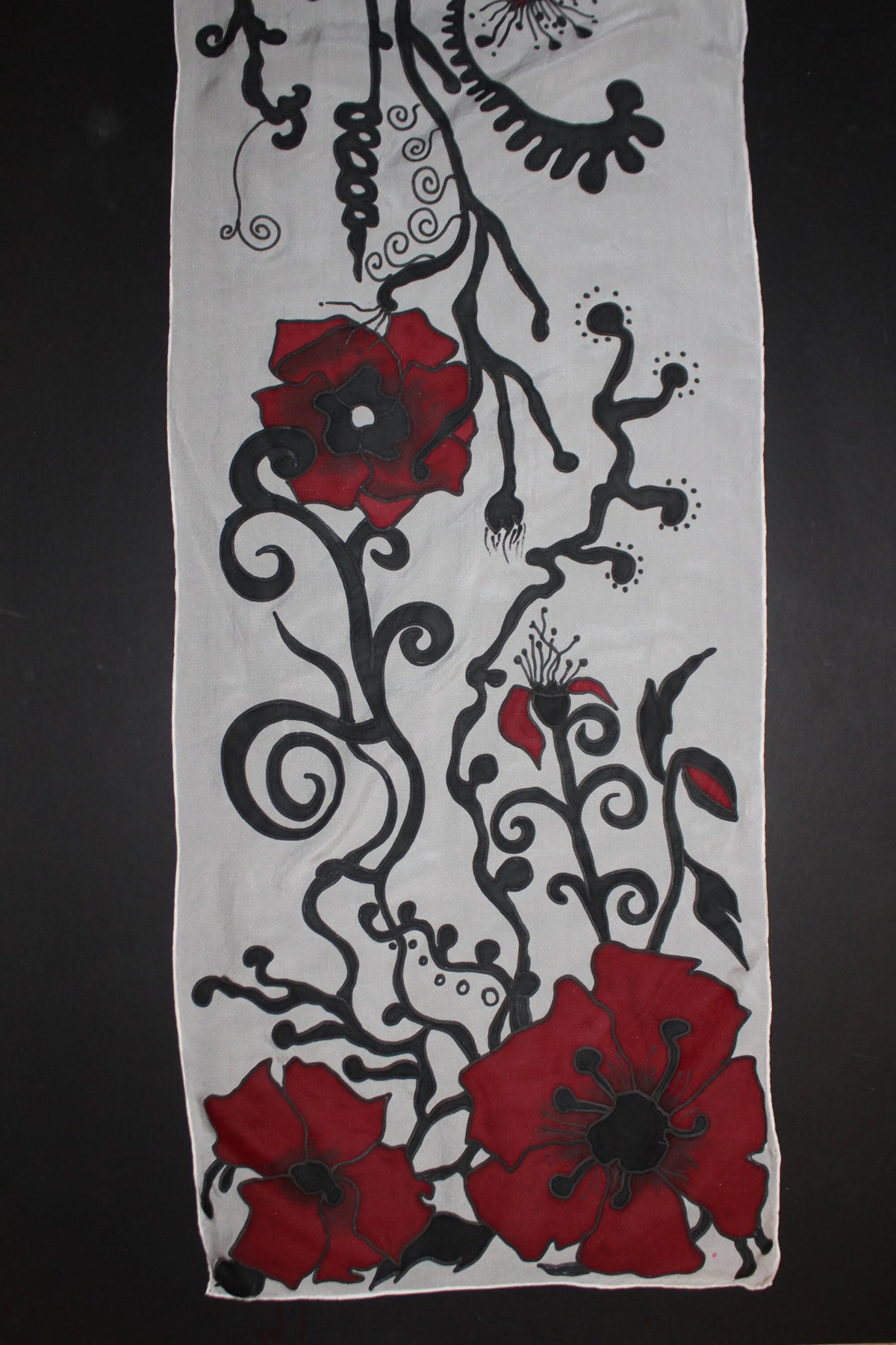 This stunning scarf features a captivating design of vibrant red poppies blooming amidst delicate black stems and leaves. The elegant lines and subtle gray accents create a sense of movement and tranquility. The scarf is finished with a refined black border, adding a touch of sophistication.