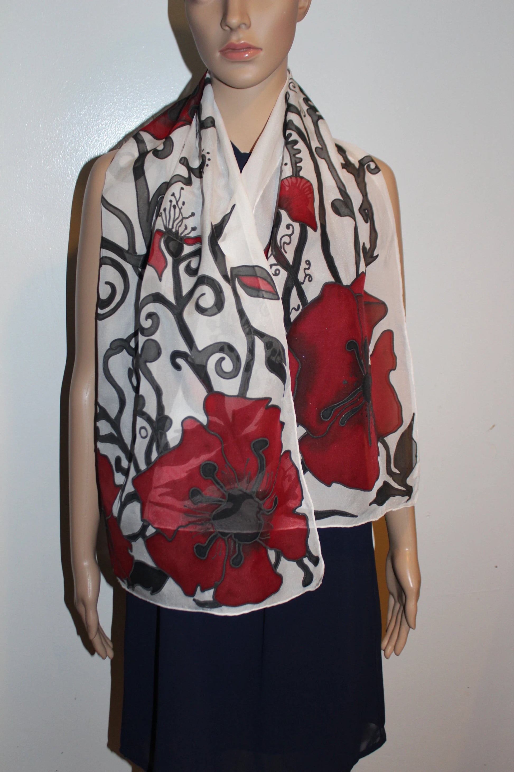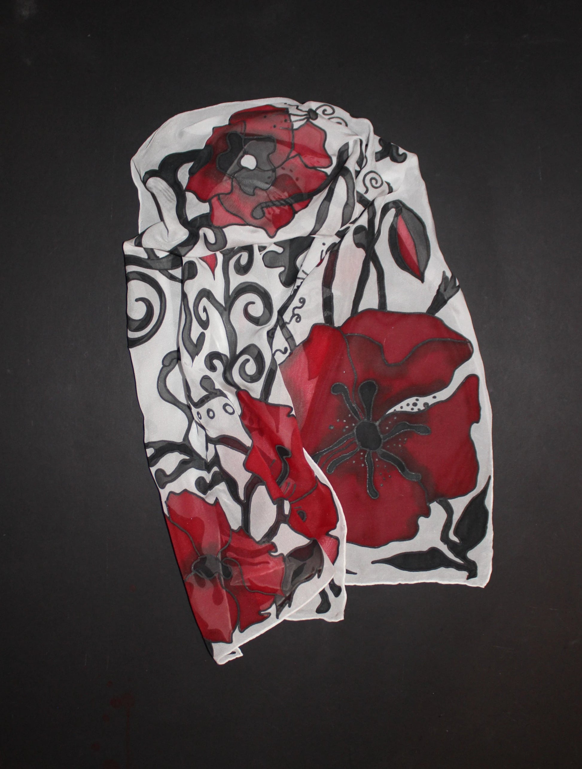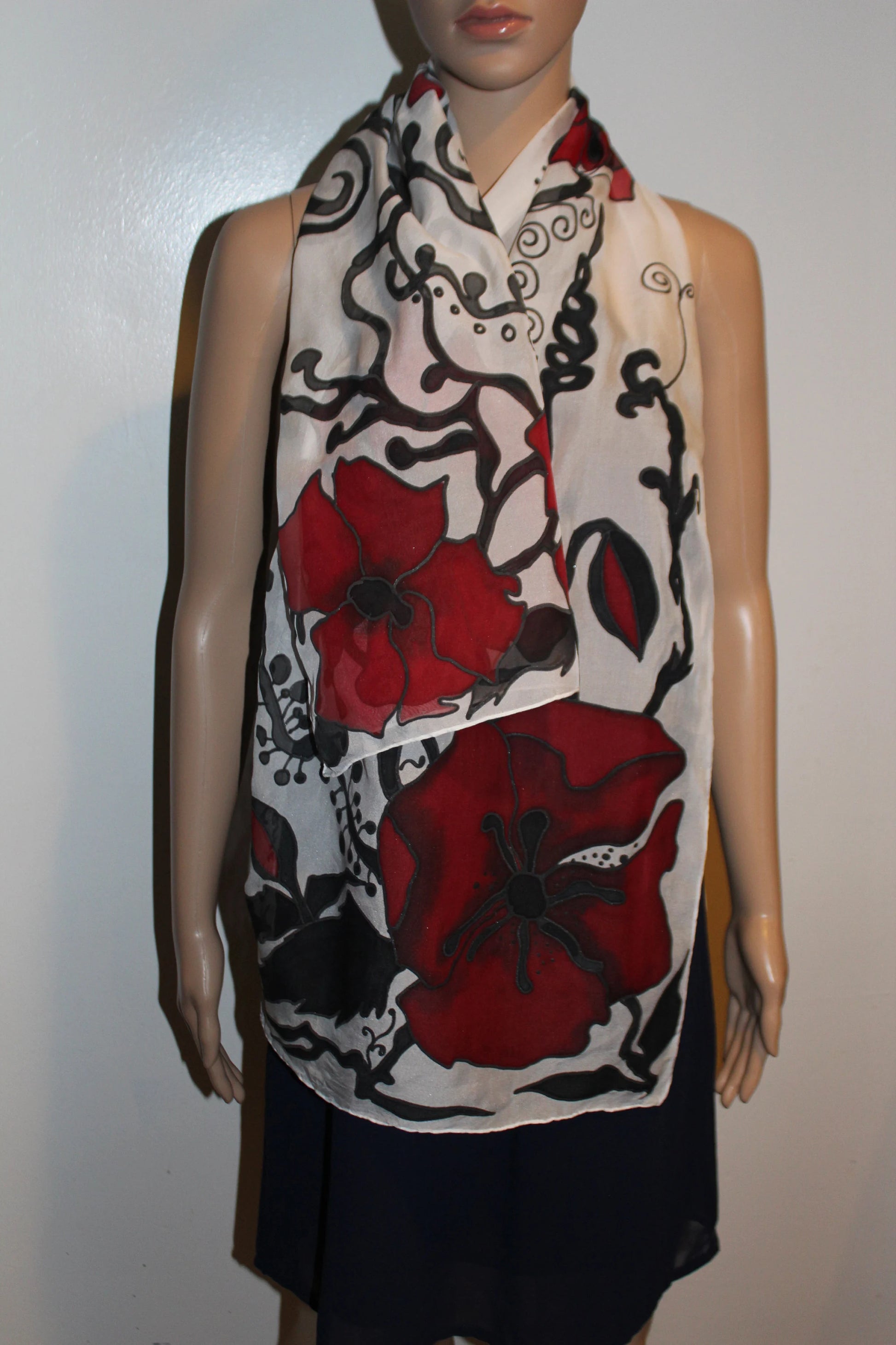 This stunning scarf features a captivating design of vibrant red poppies blooming amidst delicate black stems and leaves. The elegant lines and subtle gray accents create a sense of movement and tranquility. The scarf is finished with a refined black border, adding a touch of sophistication.