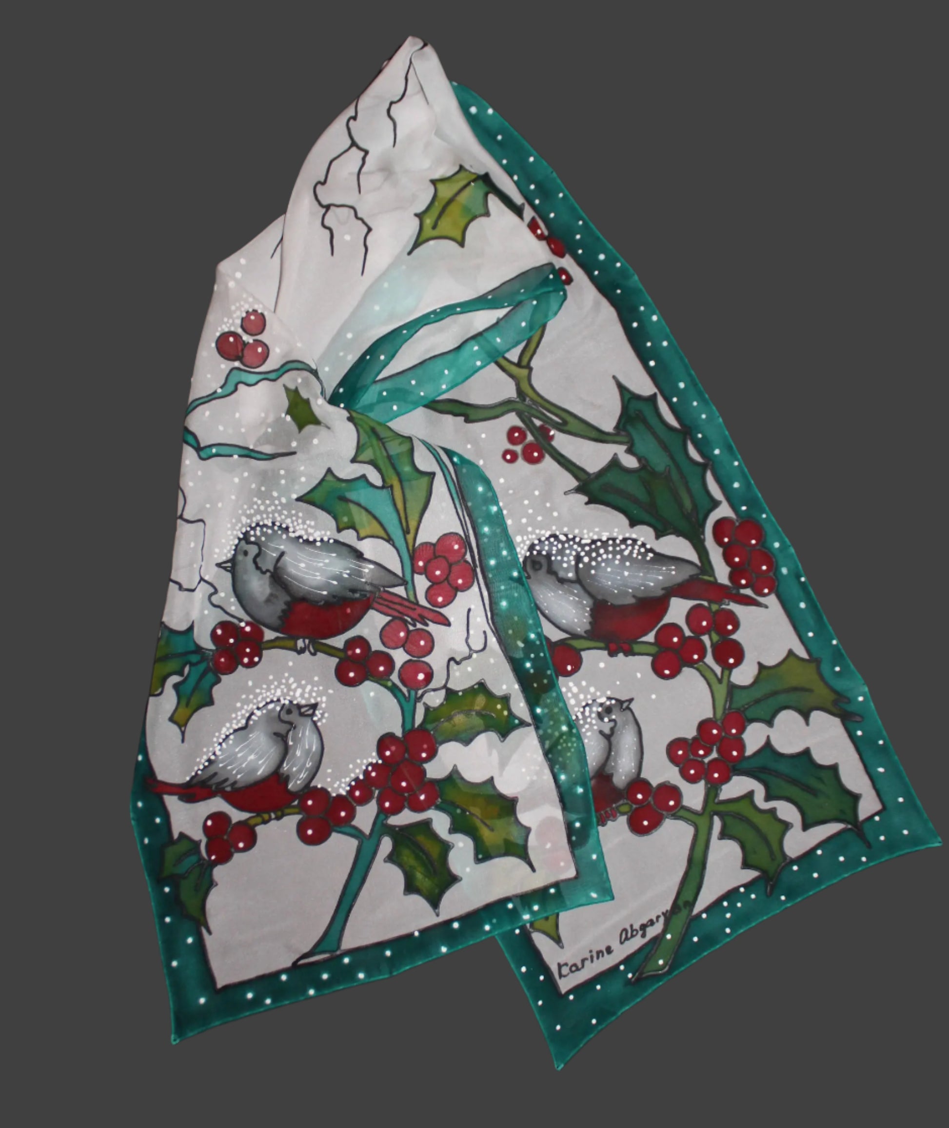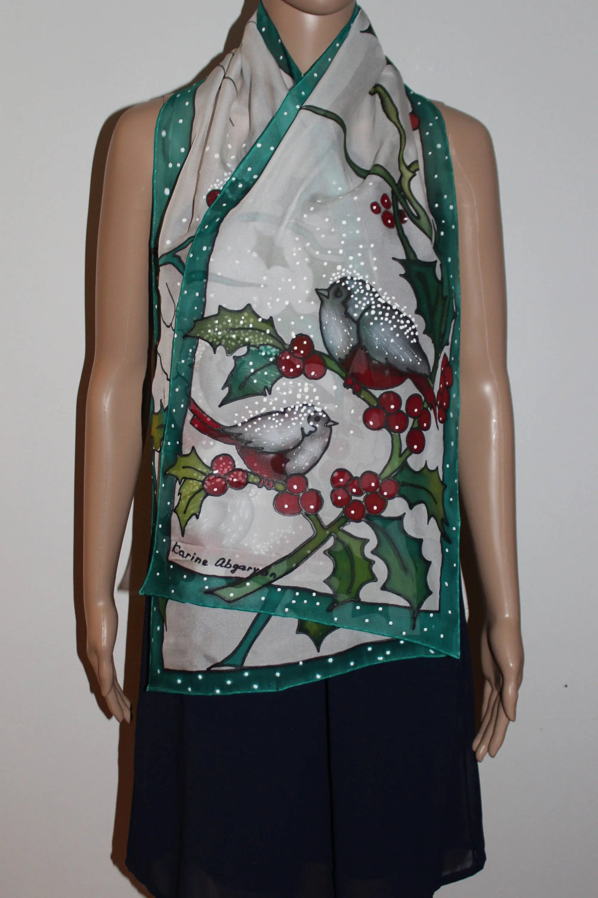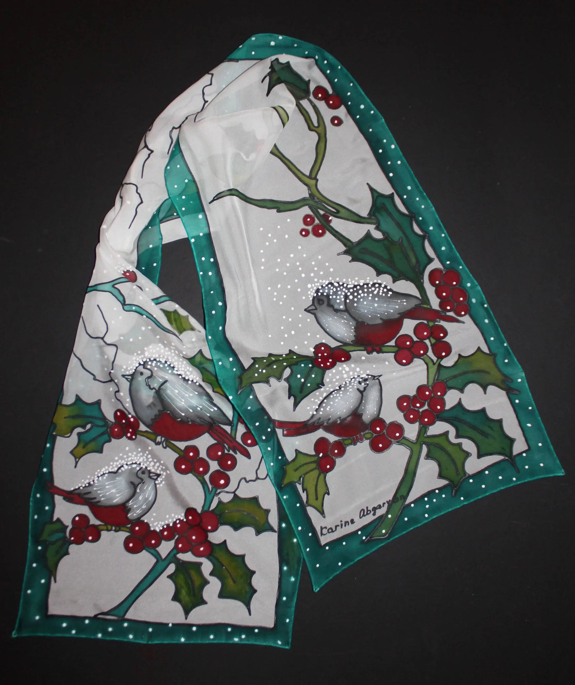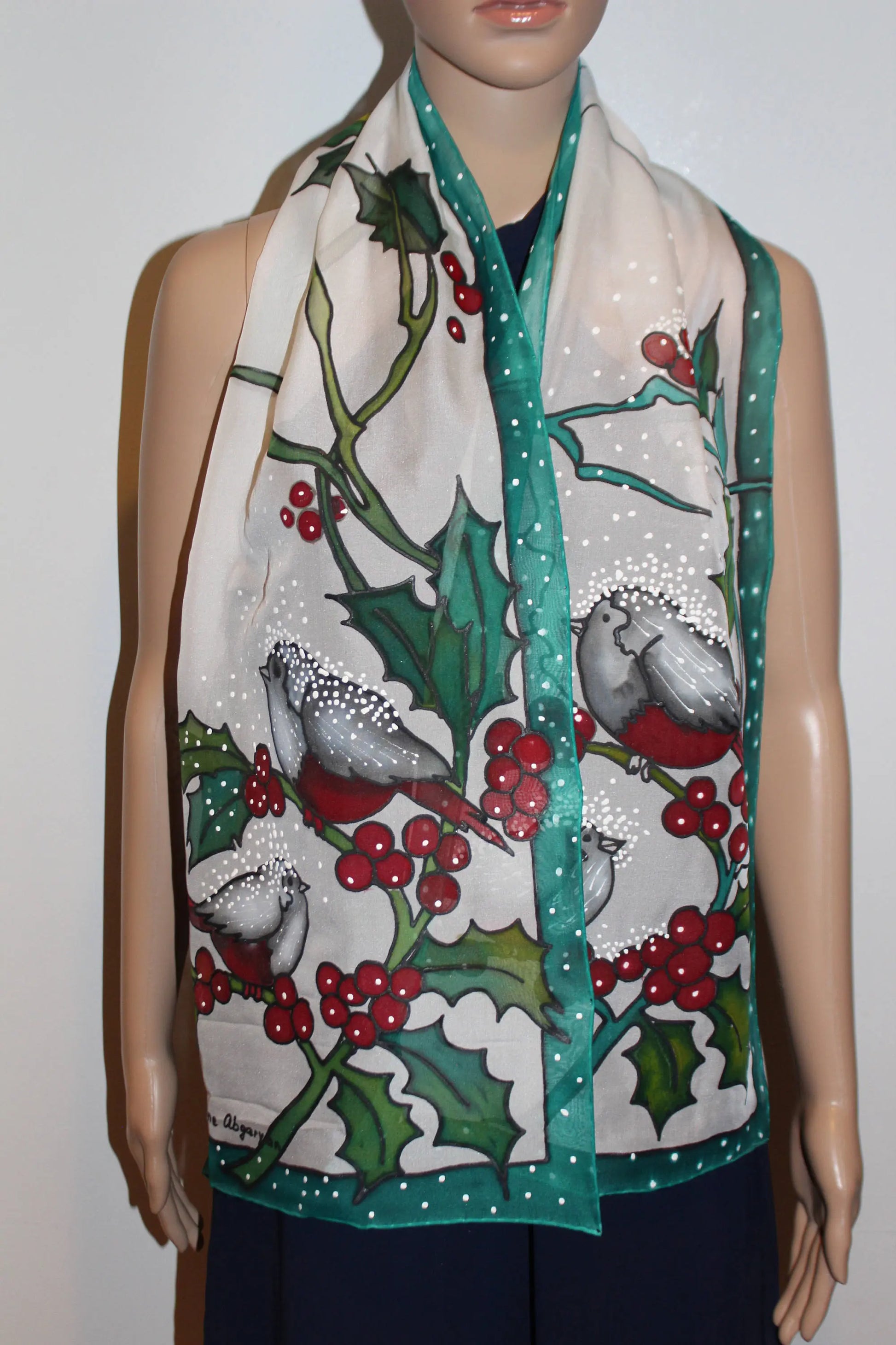 Hand painted Winter scarf, Snowball Winter Bird scarf