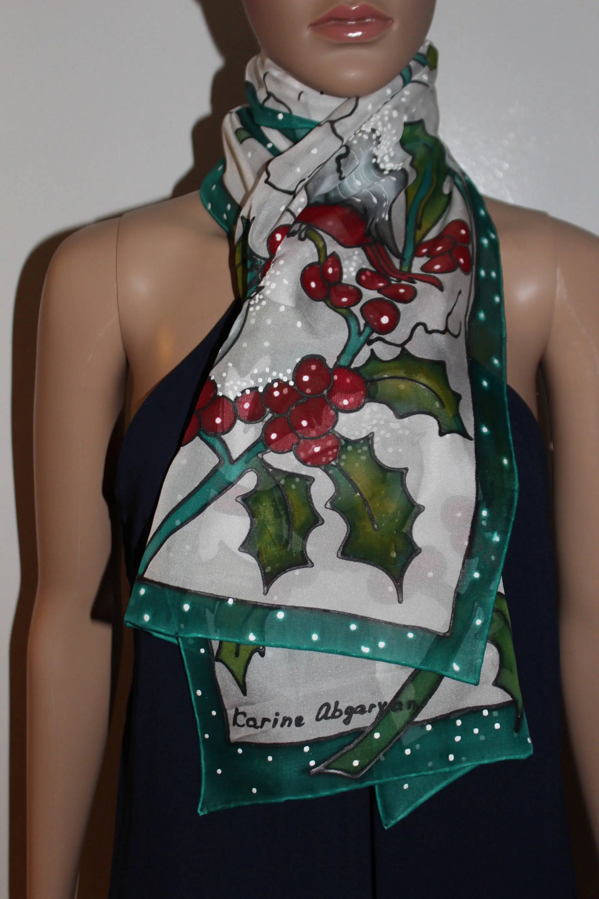 This stunning scarf features a captivating scene of birds perched on branches laden with snow-covered berries. The delicate snowflakes seem to dance across the soft gray background, creating a winter wonderland. The vibrant colors and intricate details bring the scene to life, making this scarf a true work of art.