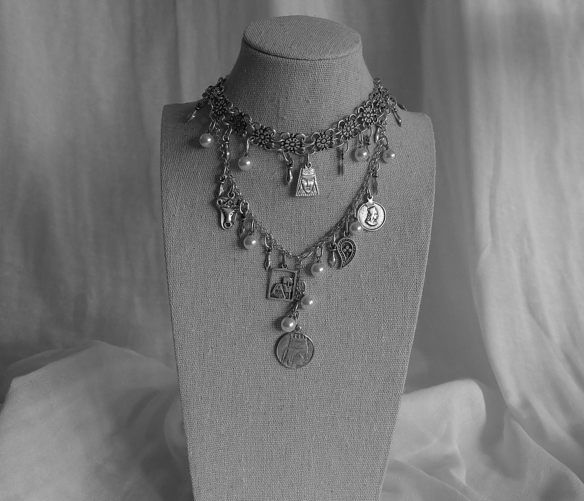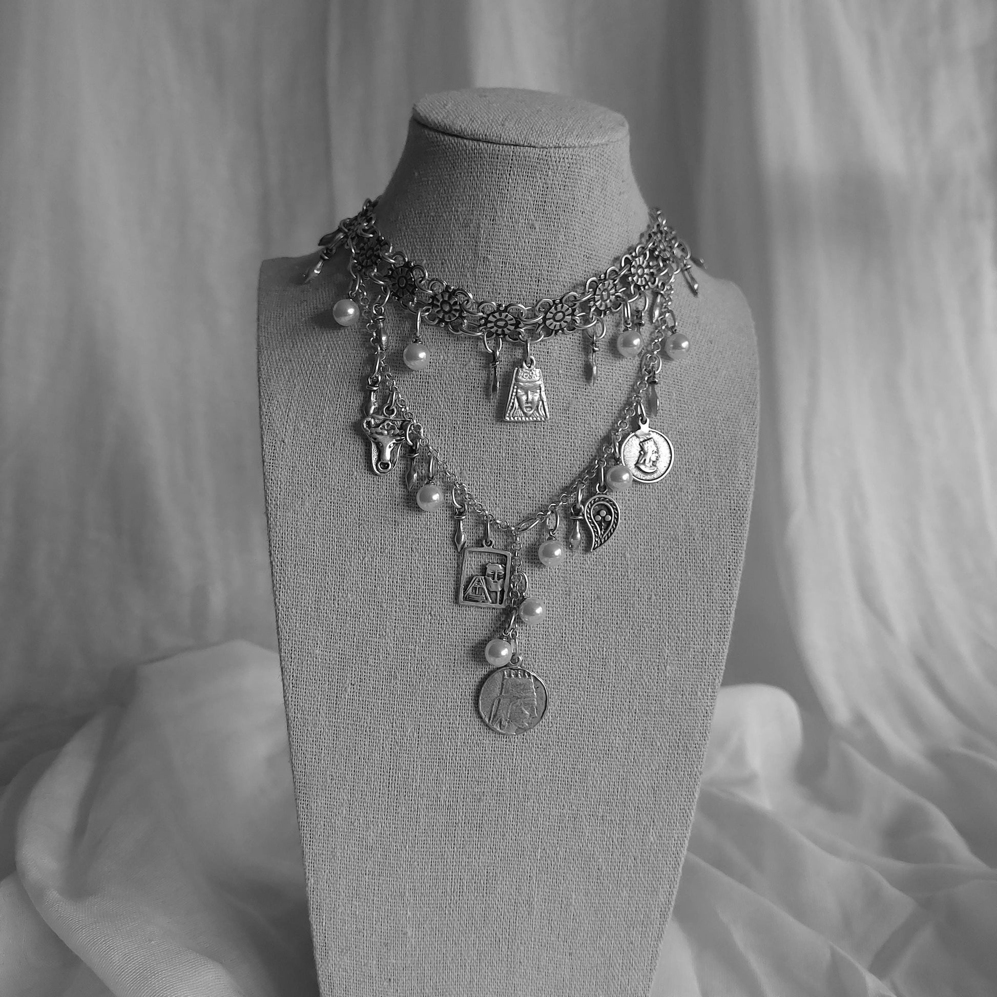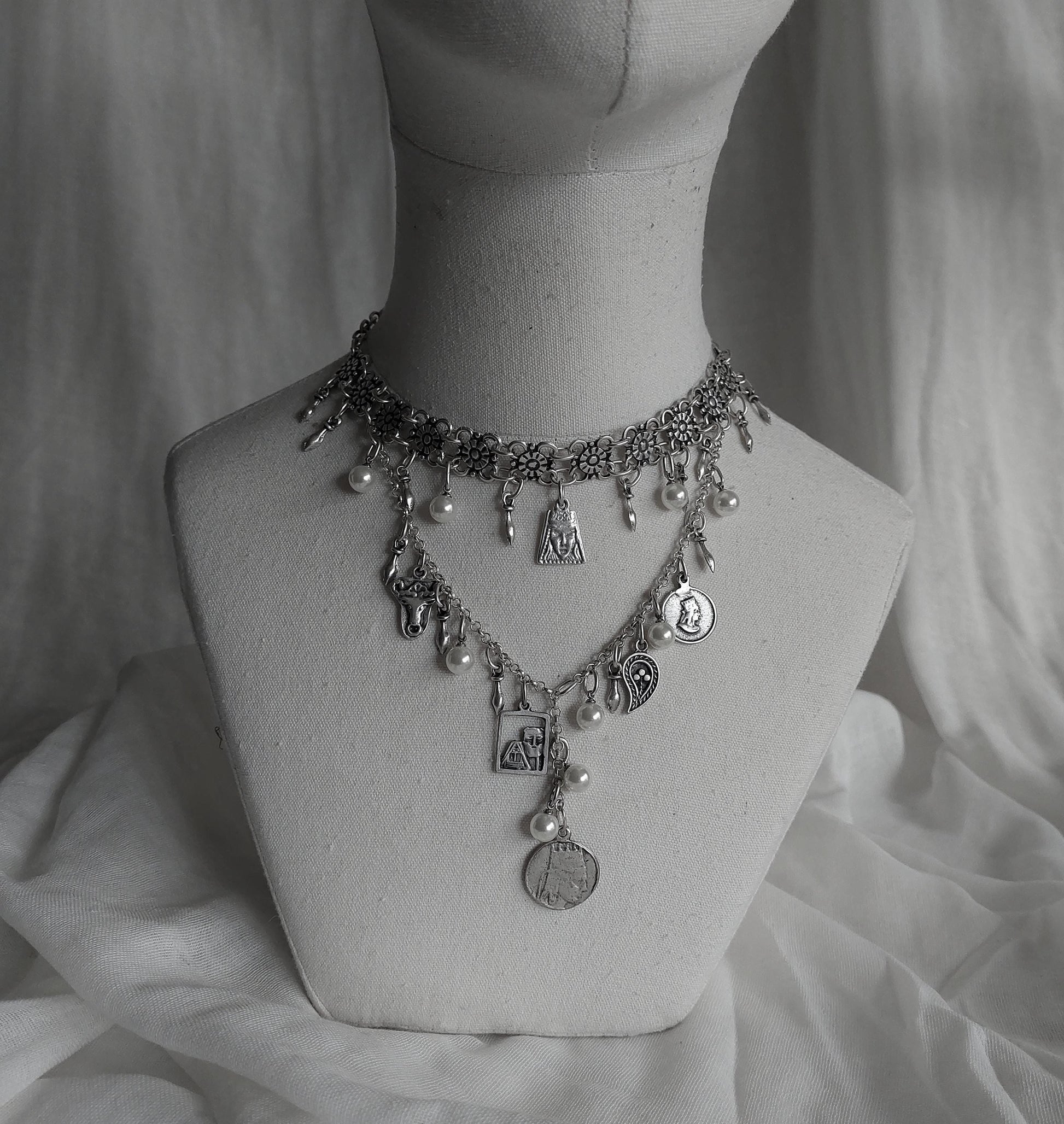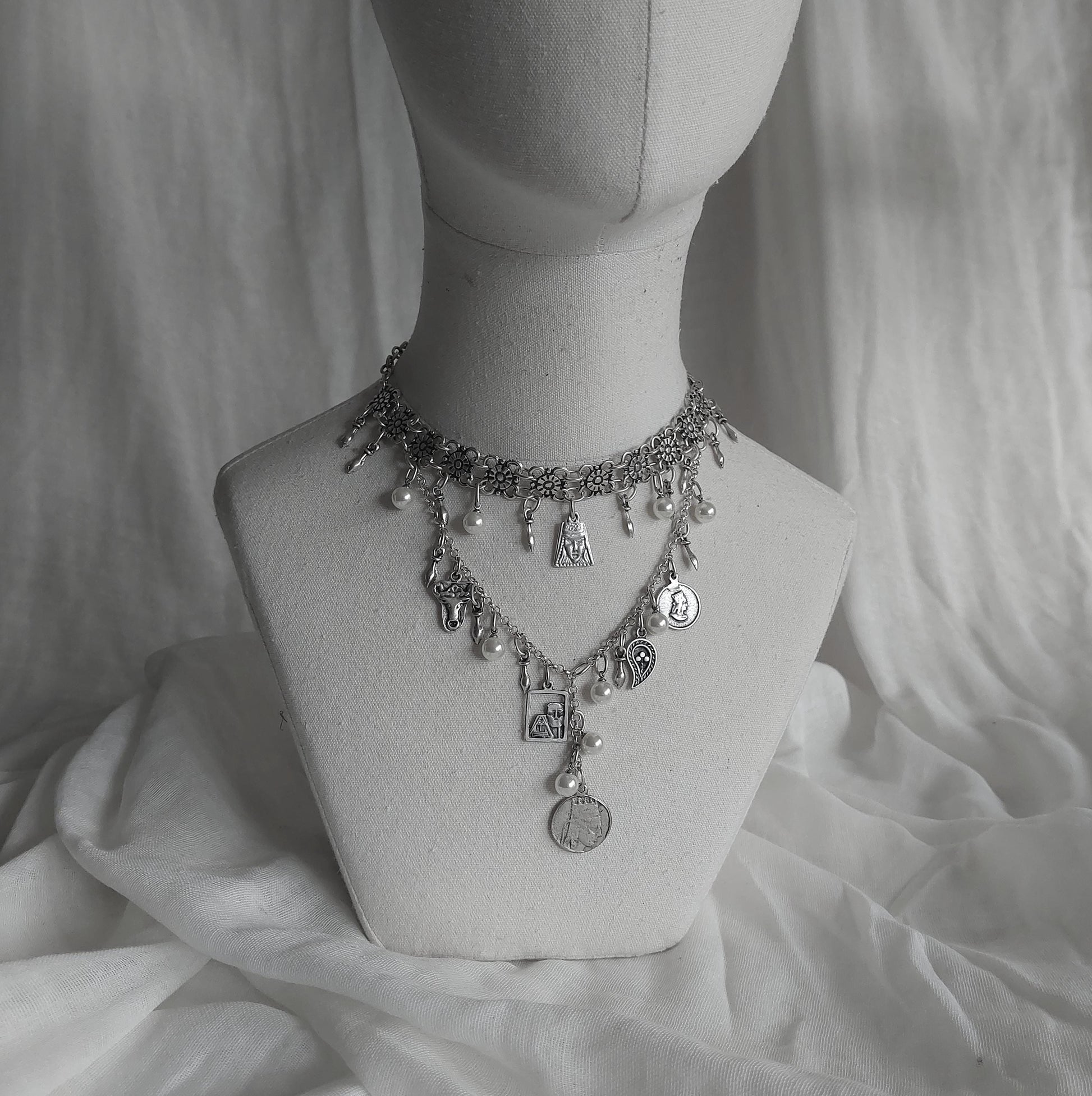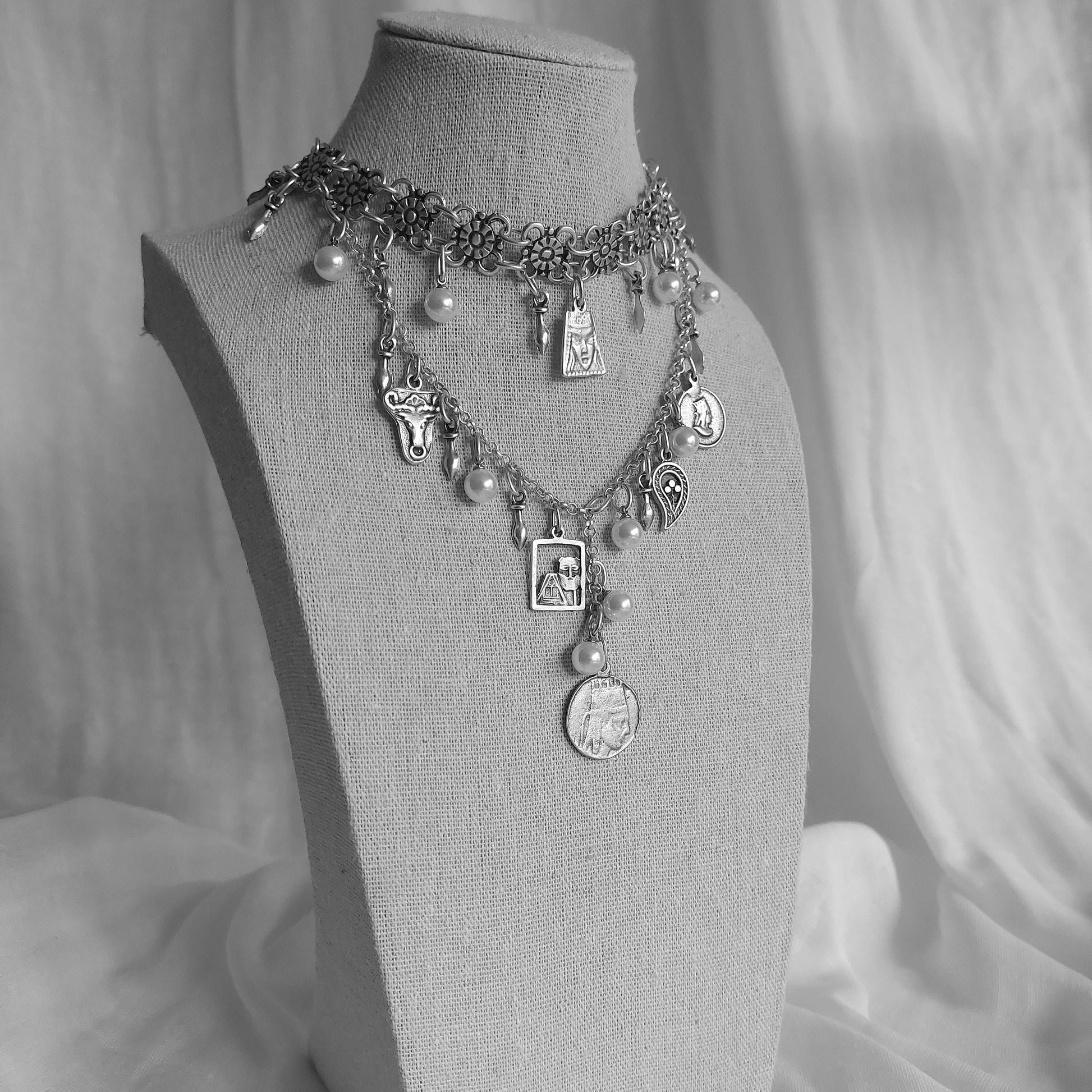 This stunning Armenian-inspired necklace showcases a blend of traditional elements, featuring intricate coin charms and delicate pearls. Crafted with precision and care, this layered design incorporates historical motifs and floral details, bringing a touch of cultural elegance to any outfit. The addition of both artificial and natural pearls highlights the artistry behind the piece, making it a unique and meaningful accessory. Perfect for special occasions or as a tribute to Armenian heritage, this necklace is a timeless work of art.