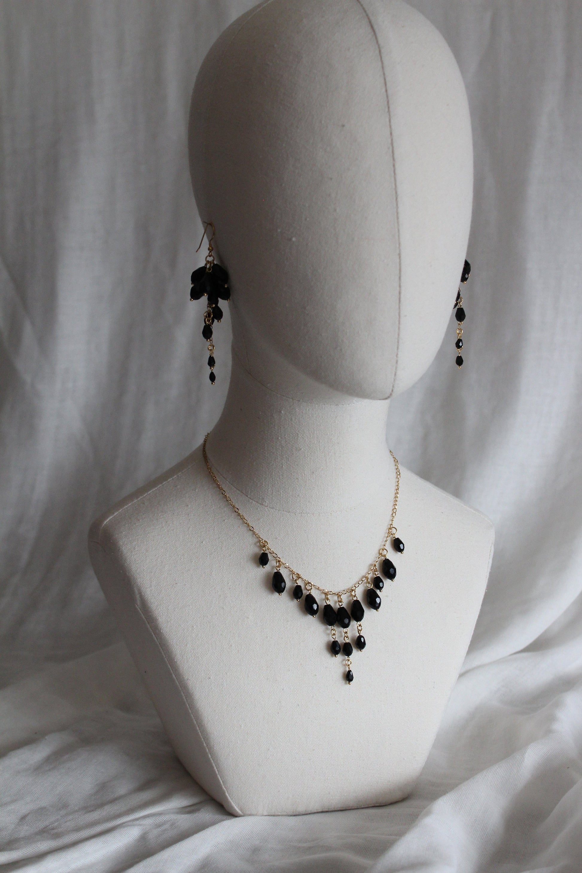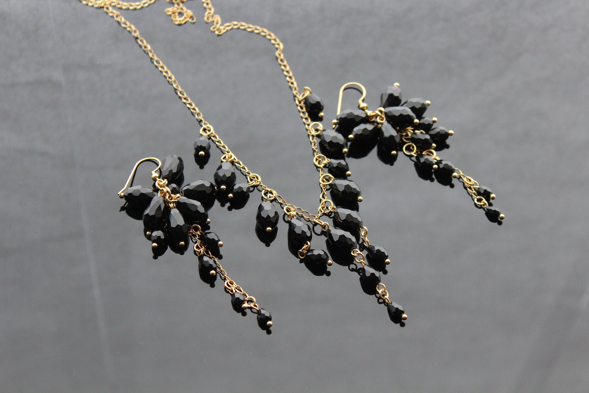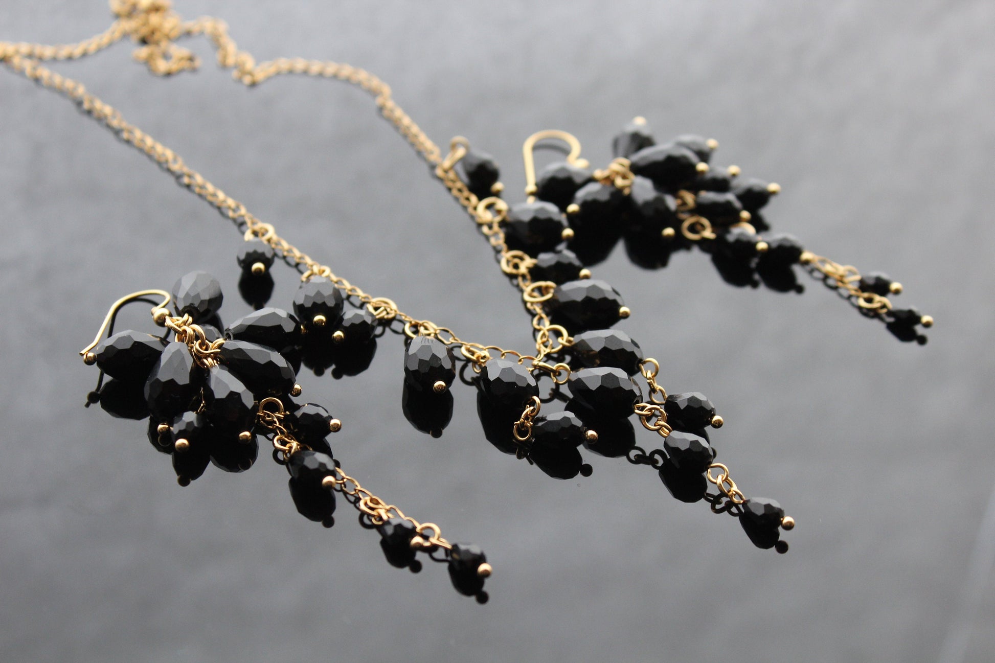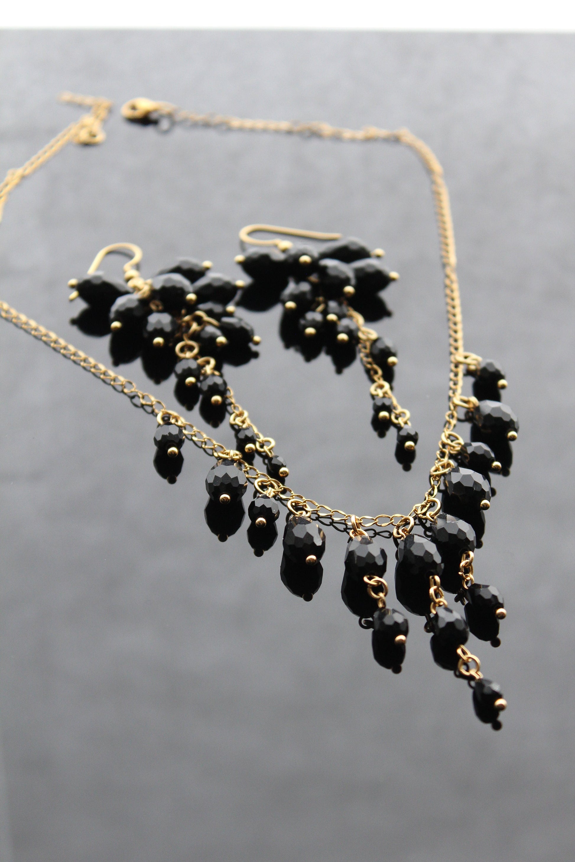 Indulge in the opulence of our handcrafted black glass jewelry set, featuring exquisite drop beads and 18K gold plated stainless steel accents. Elevate your style with this luxurious and exclusive piece.