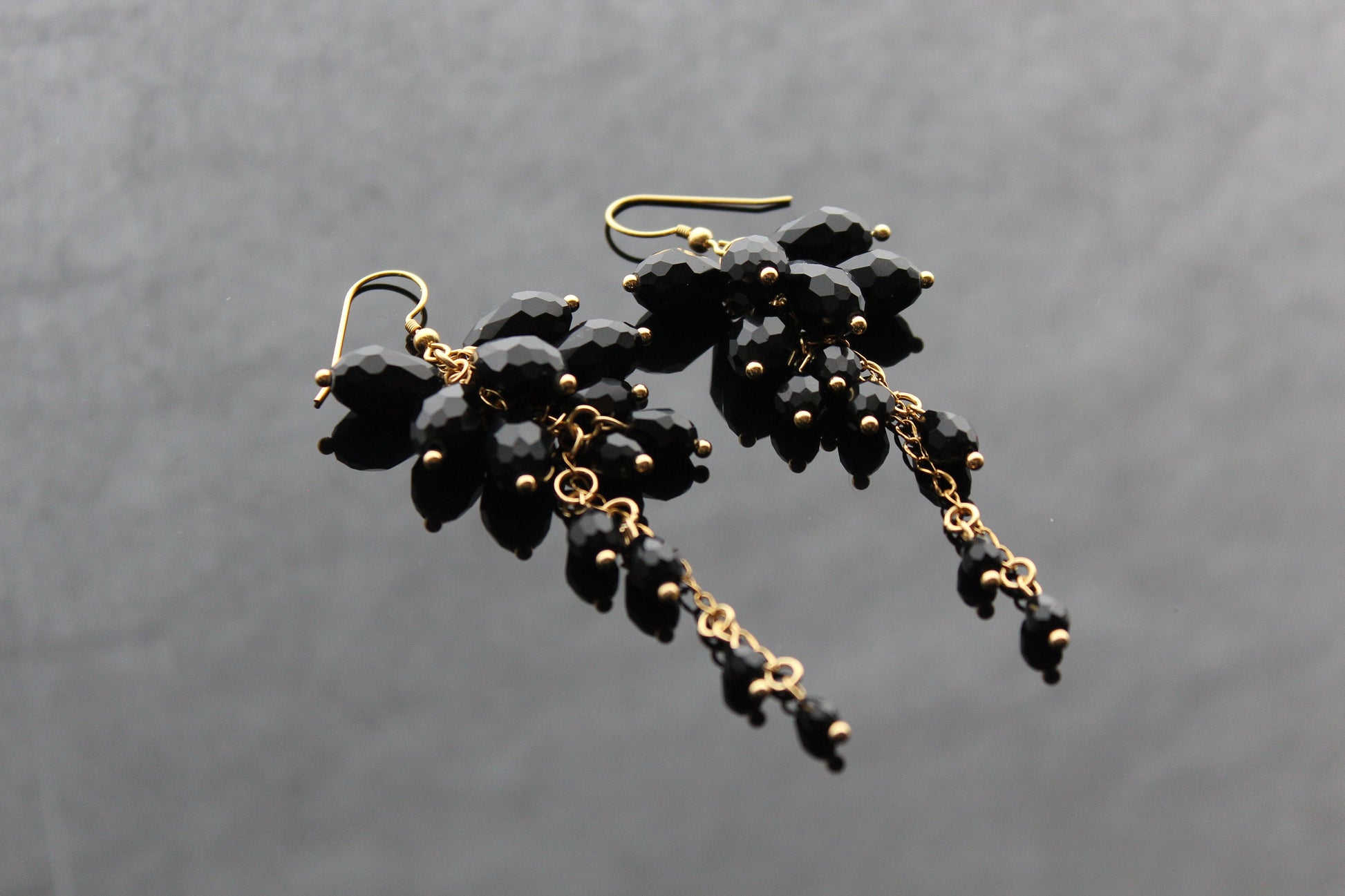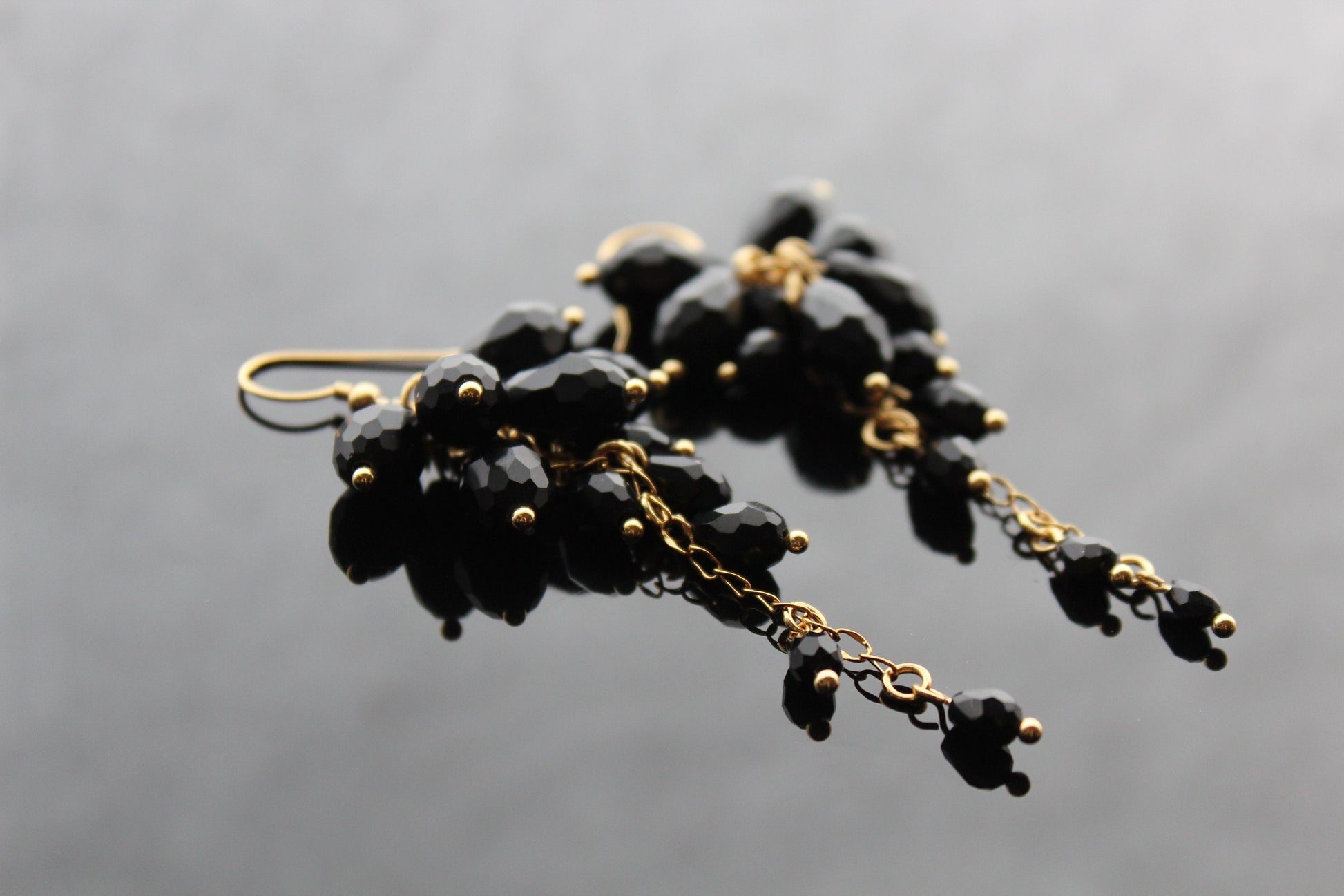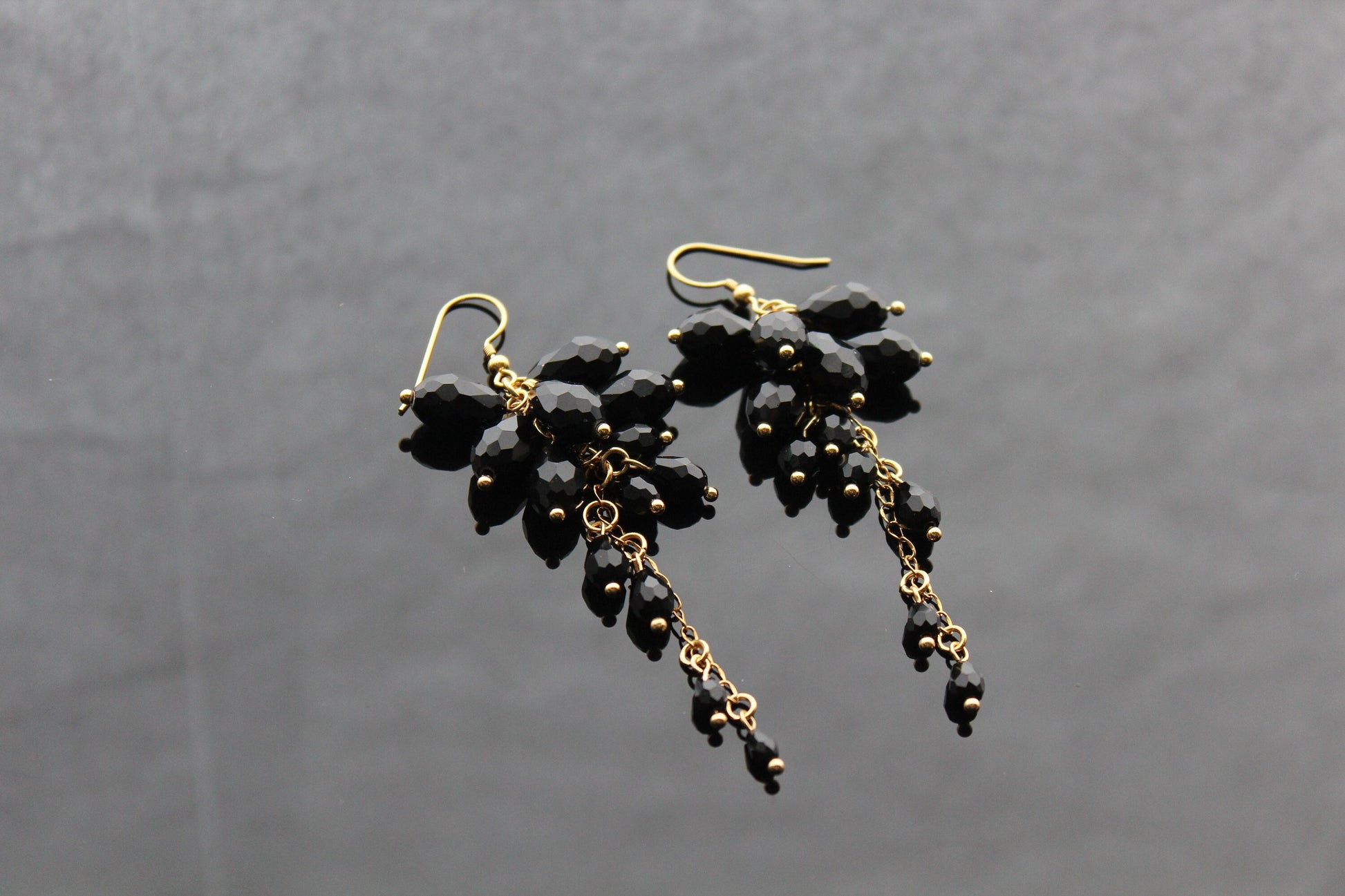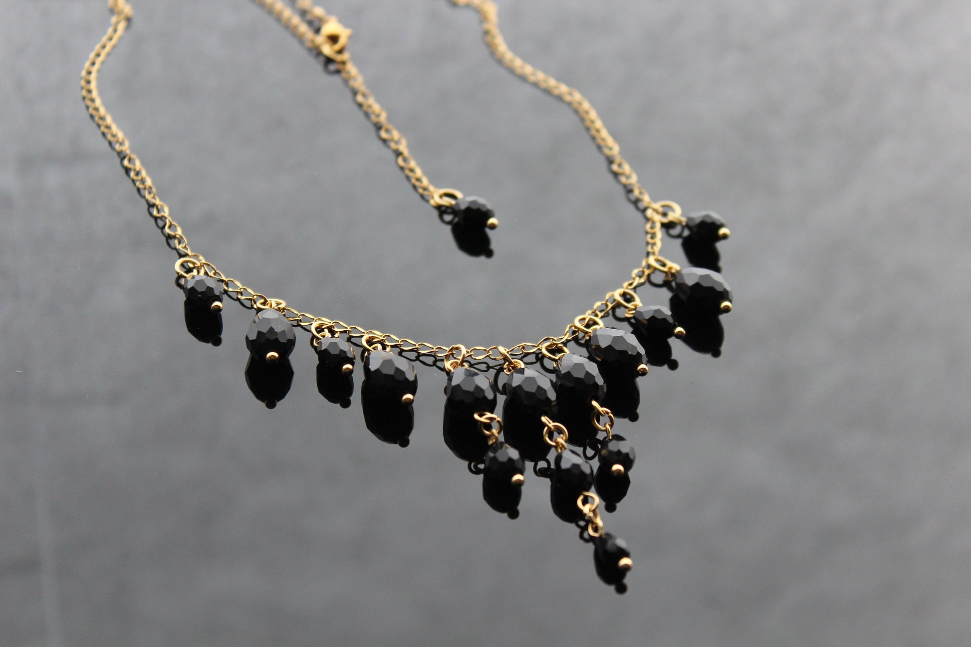 Indulge in the opulence of our handcrafted black glass jewelry set, featuring exquisite drop beads and 18K gold plated stainless steel accents. Elevate your style with this luxurious and exclusive piece.