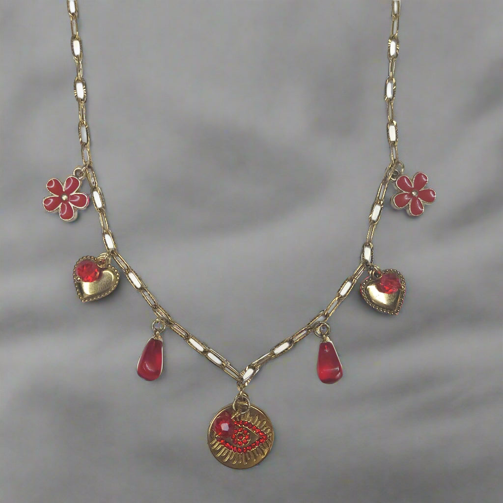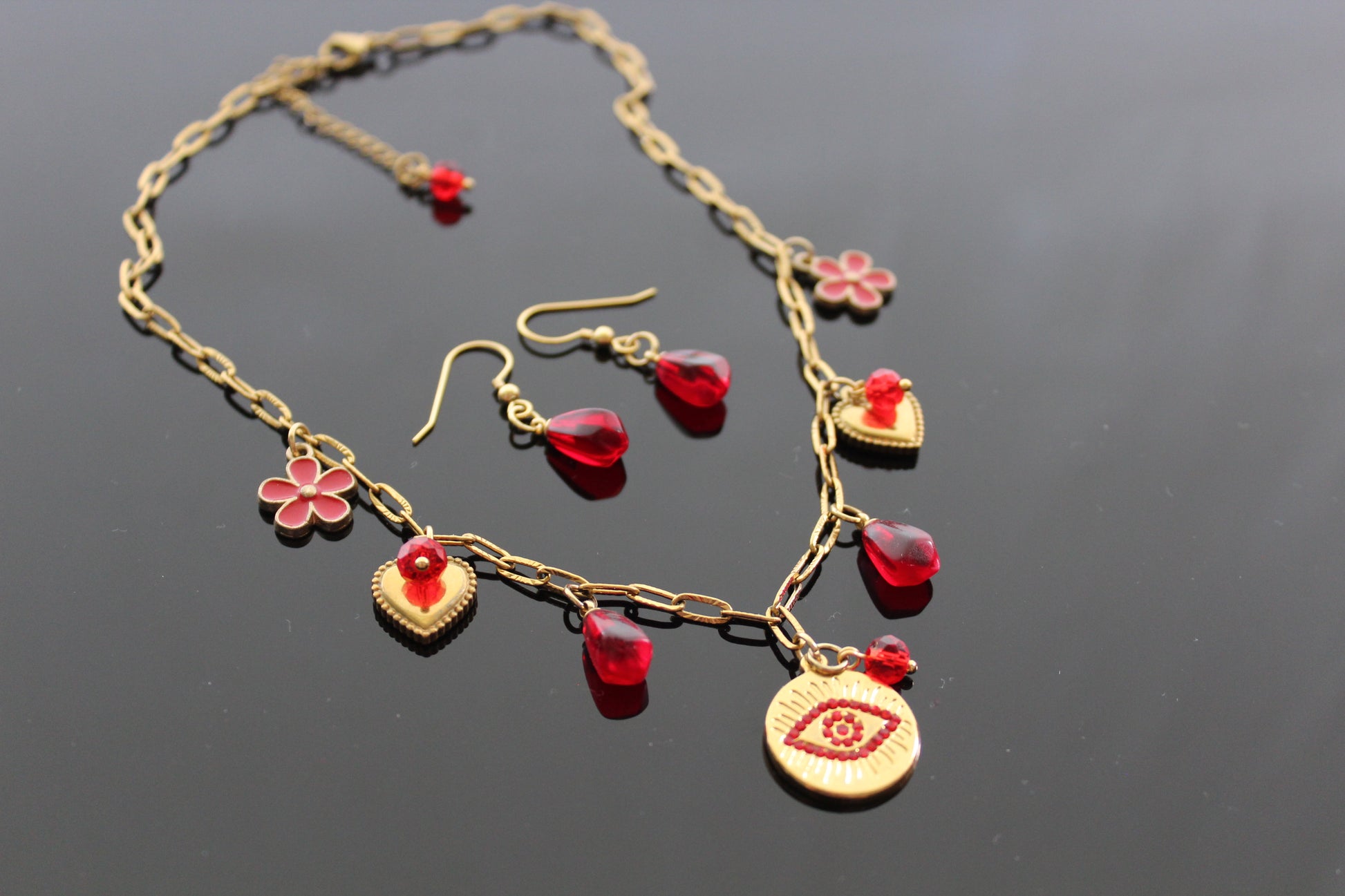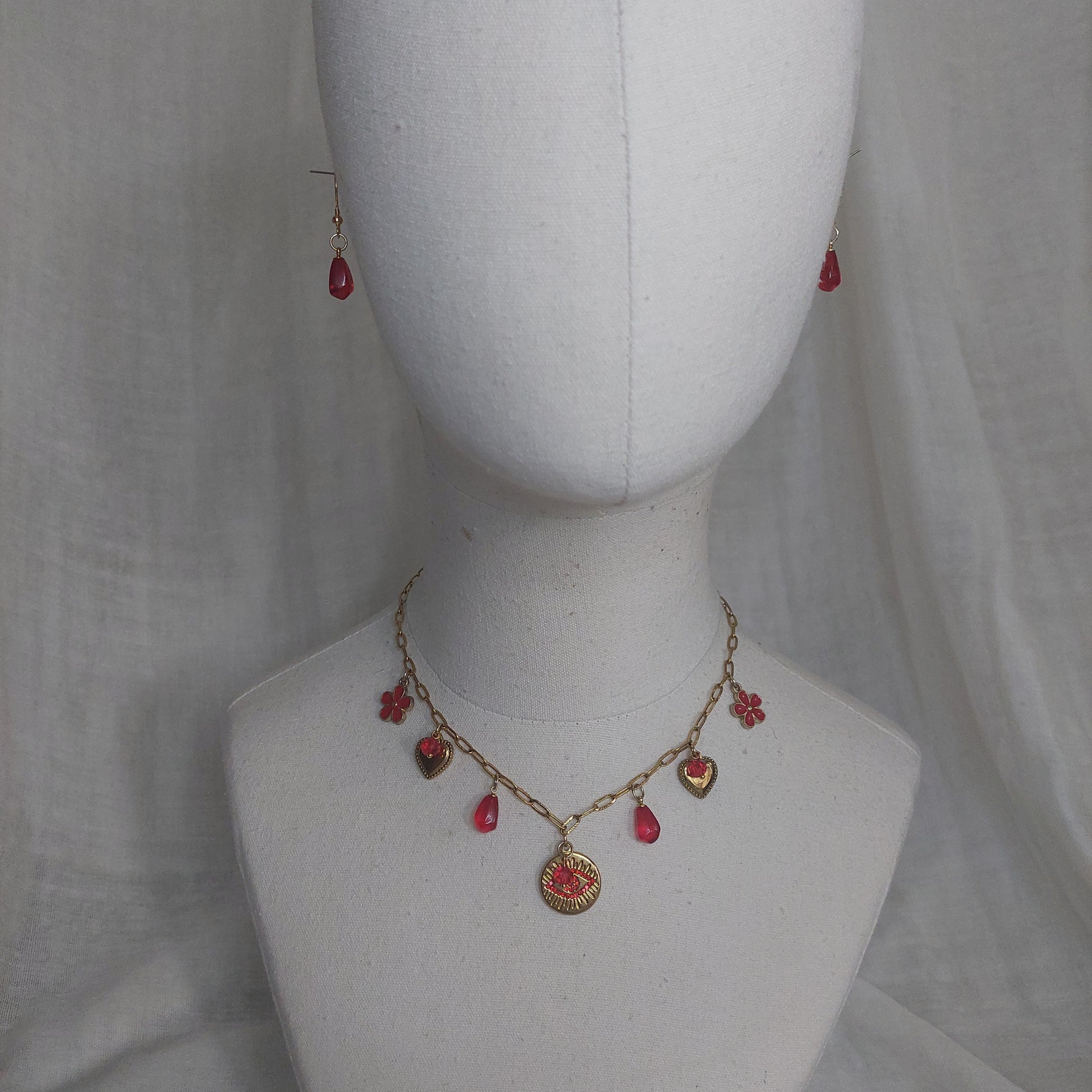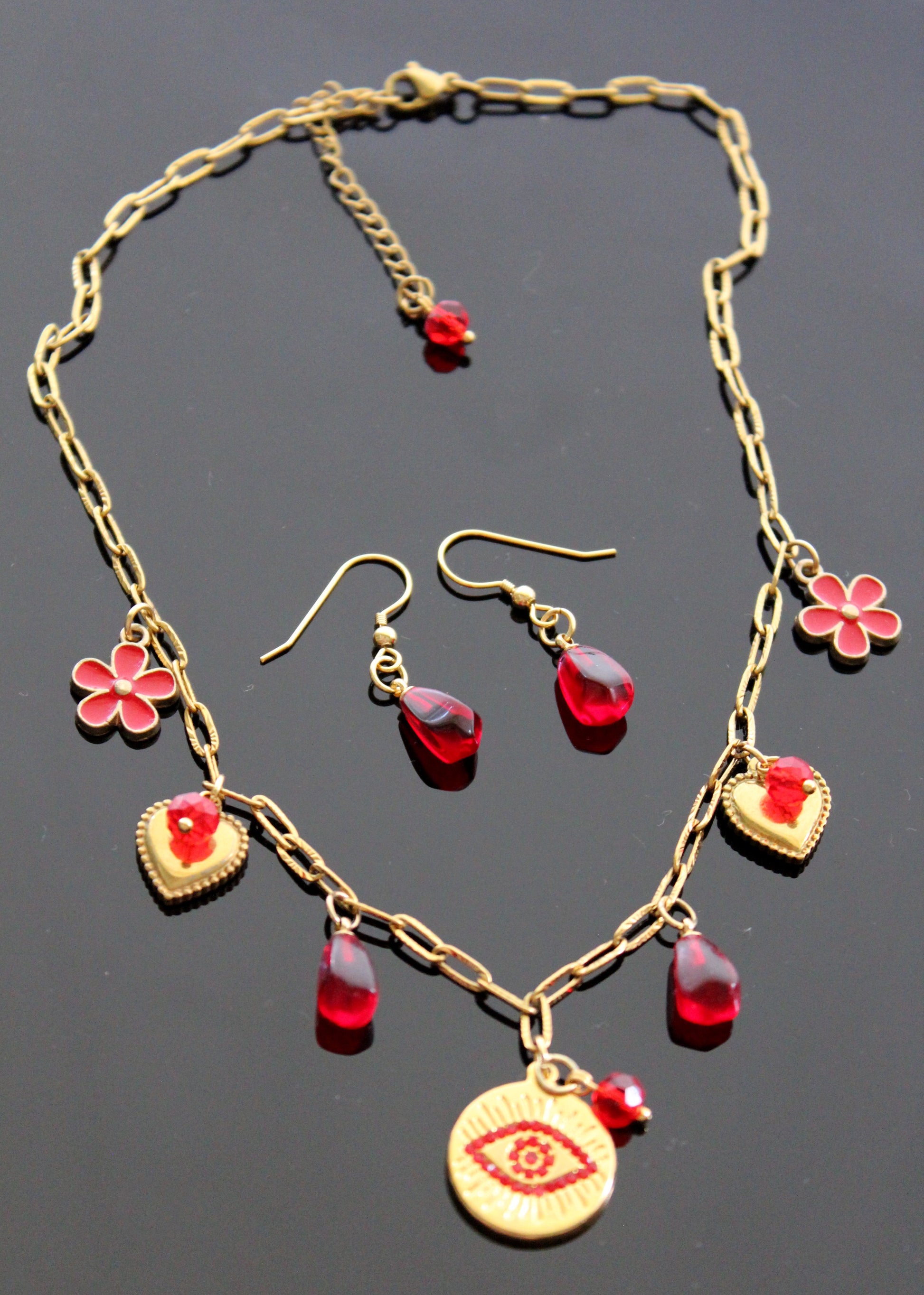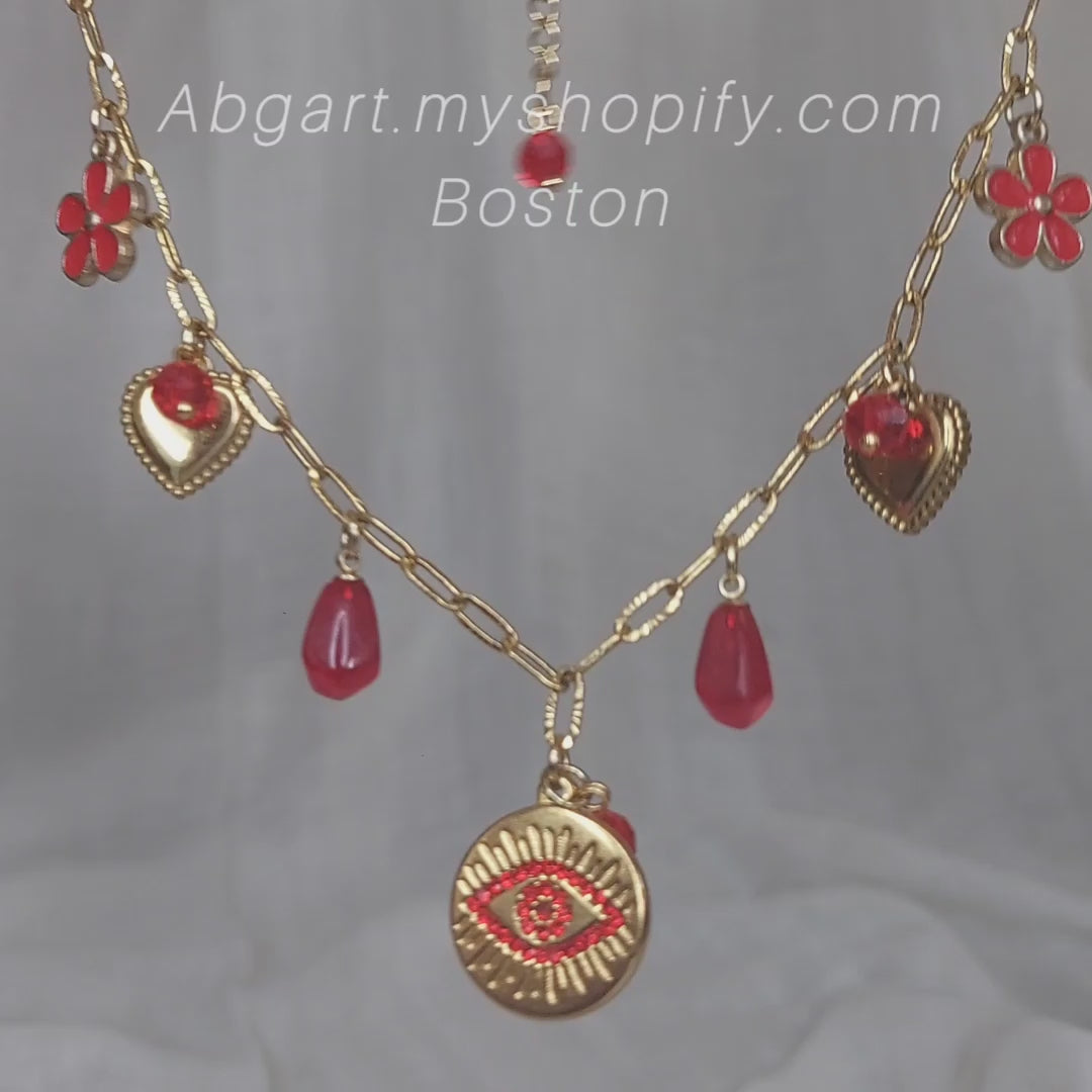 Handmade Evil Eyes Charm Pomegranate floral necklace with earrings