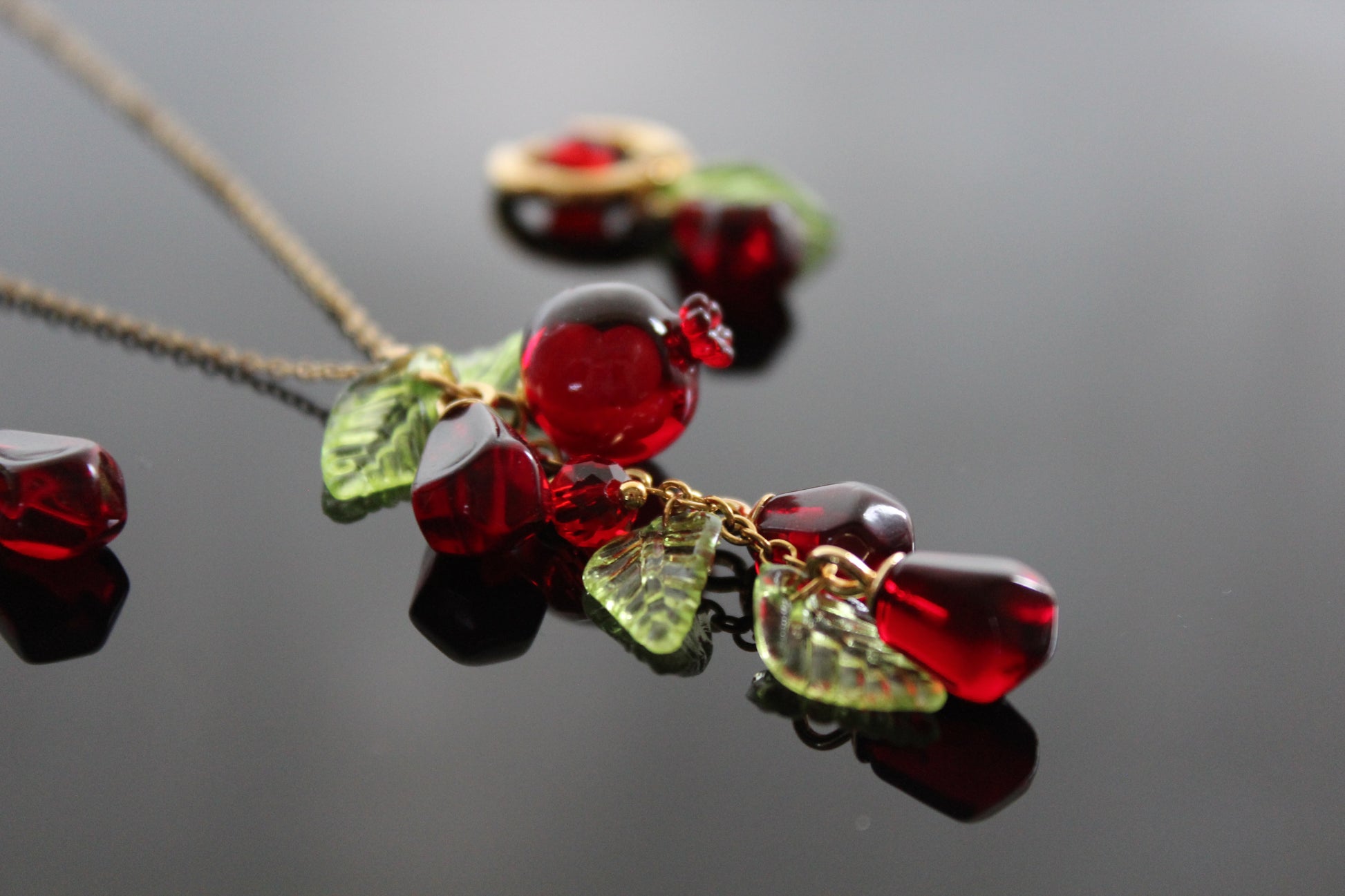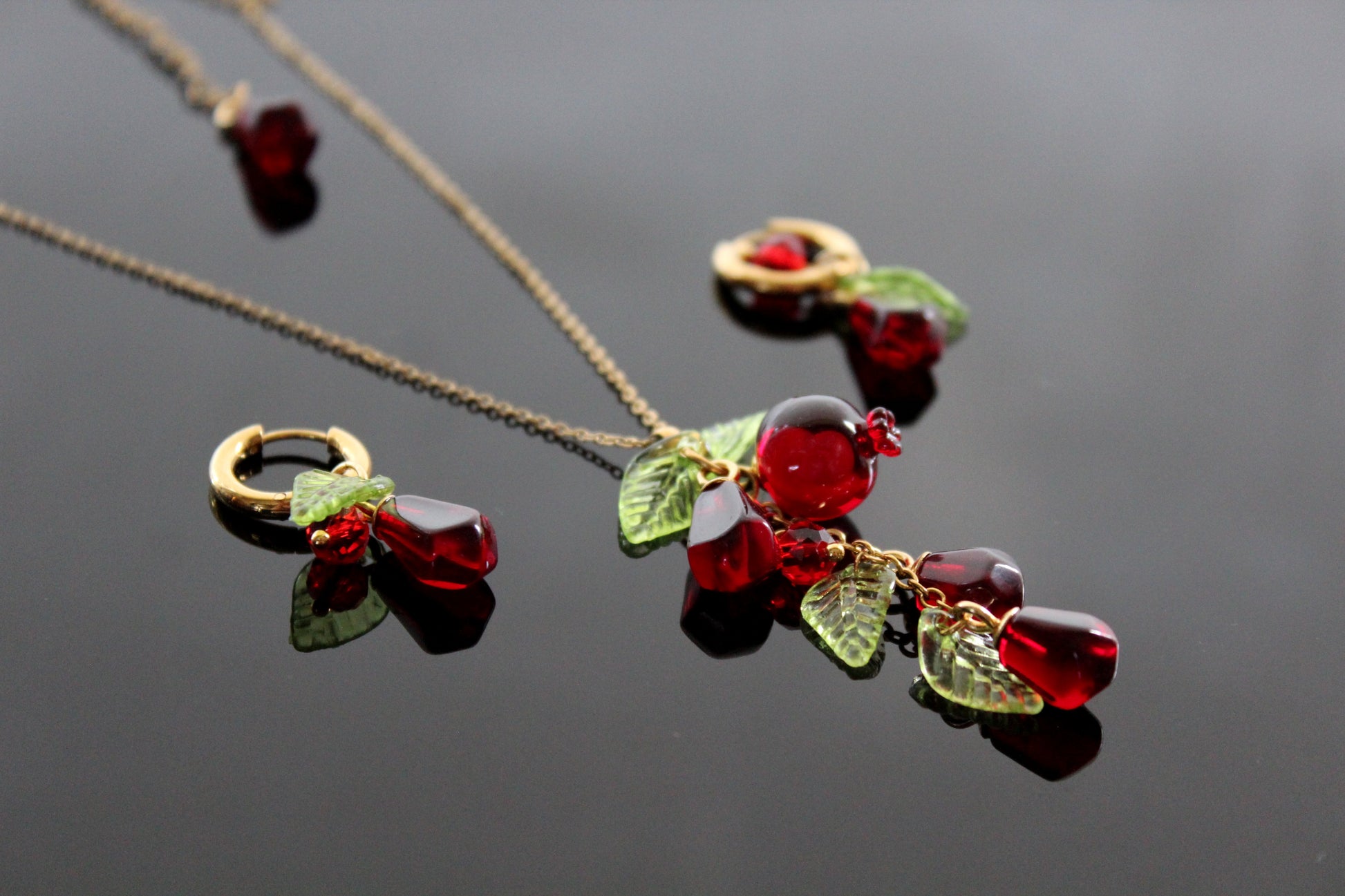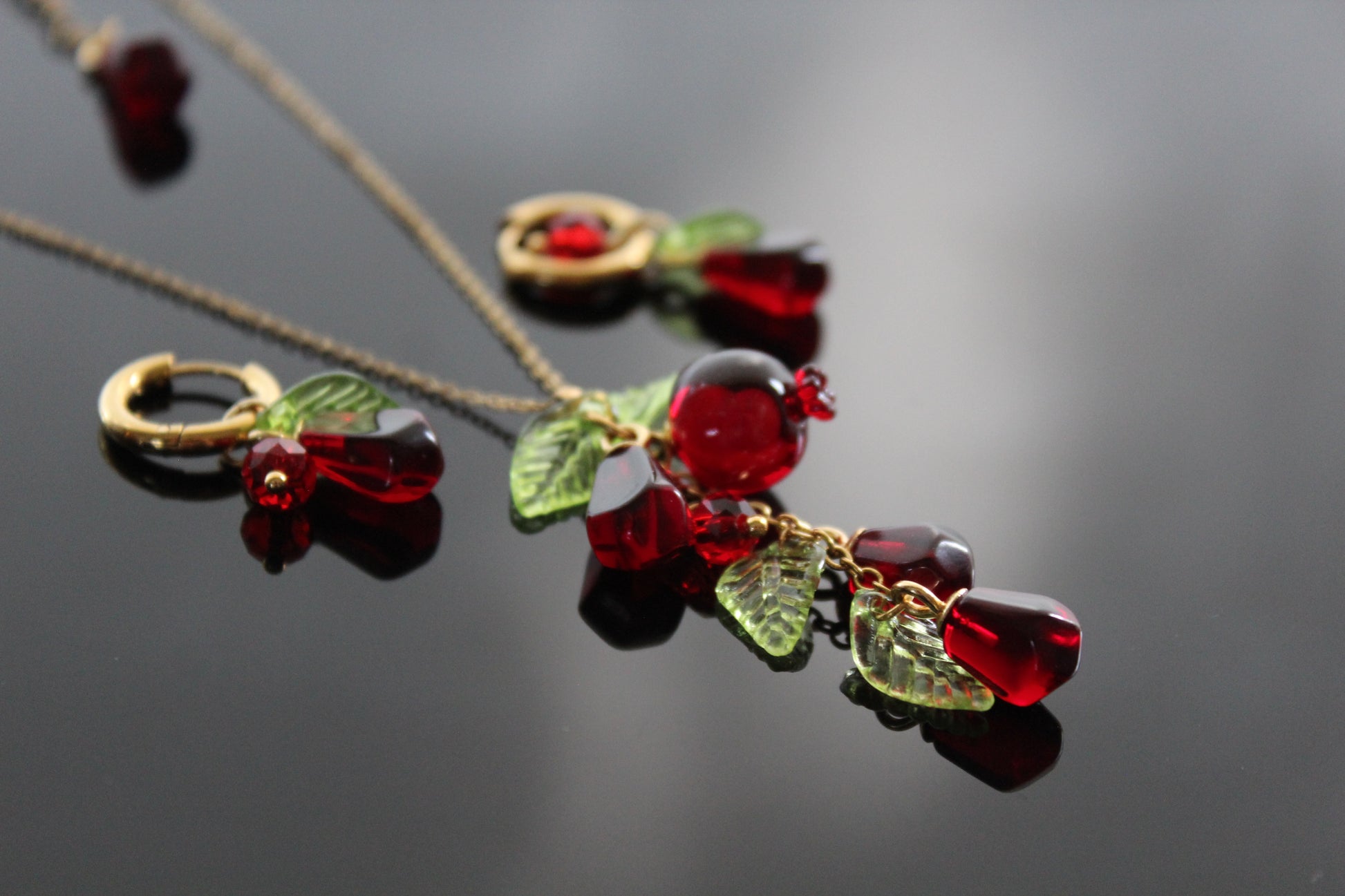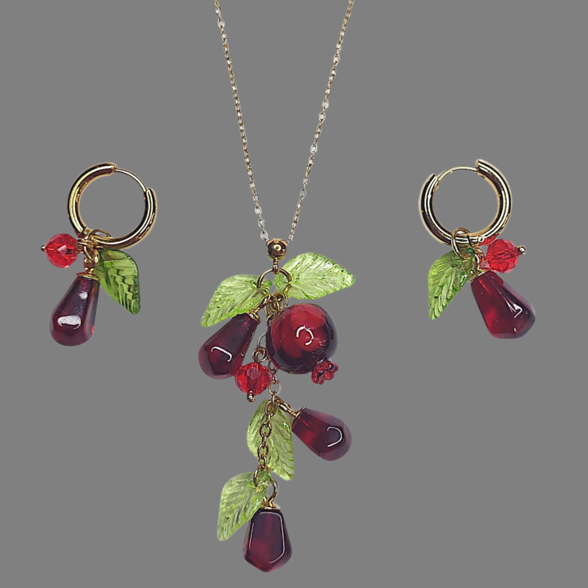 Handmade Fruit Jewelry Set, 18K Gold Plated Necklace and Earrings, Pomegranates