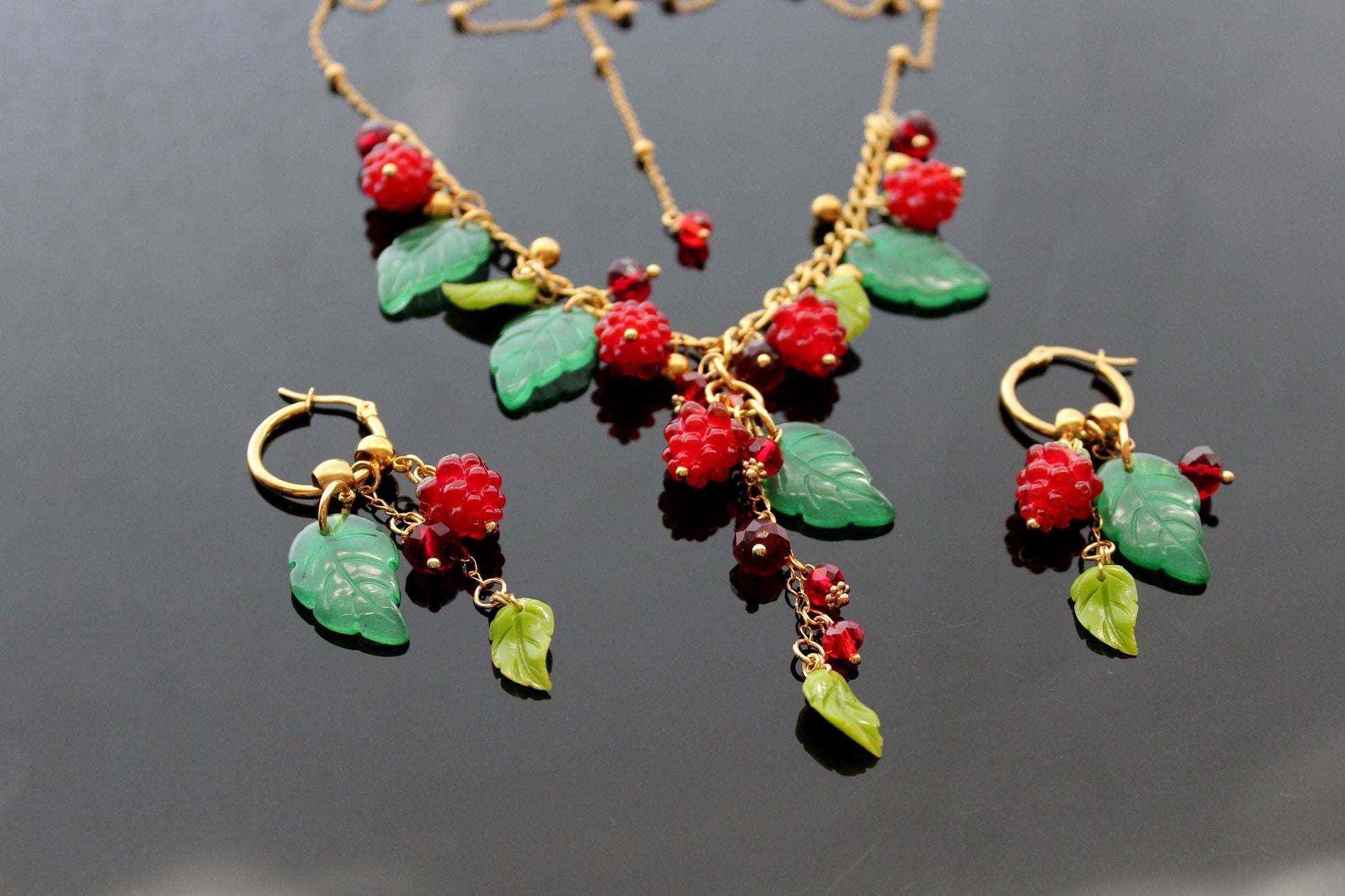 Handmade glazed glass raspberry jewelry set
