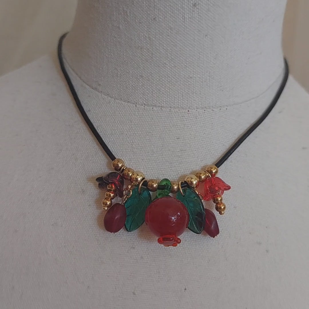 Handmade Pomegranate & Floral Glass Bead Necklace with Adjustable Leather Cord