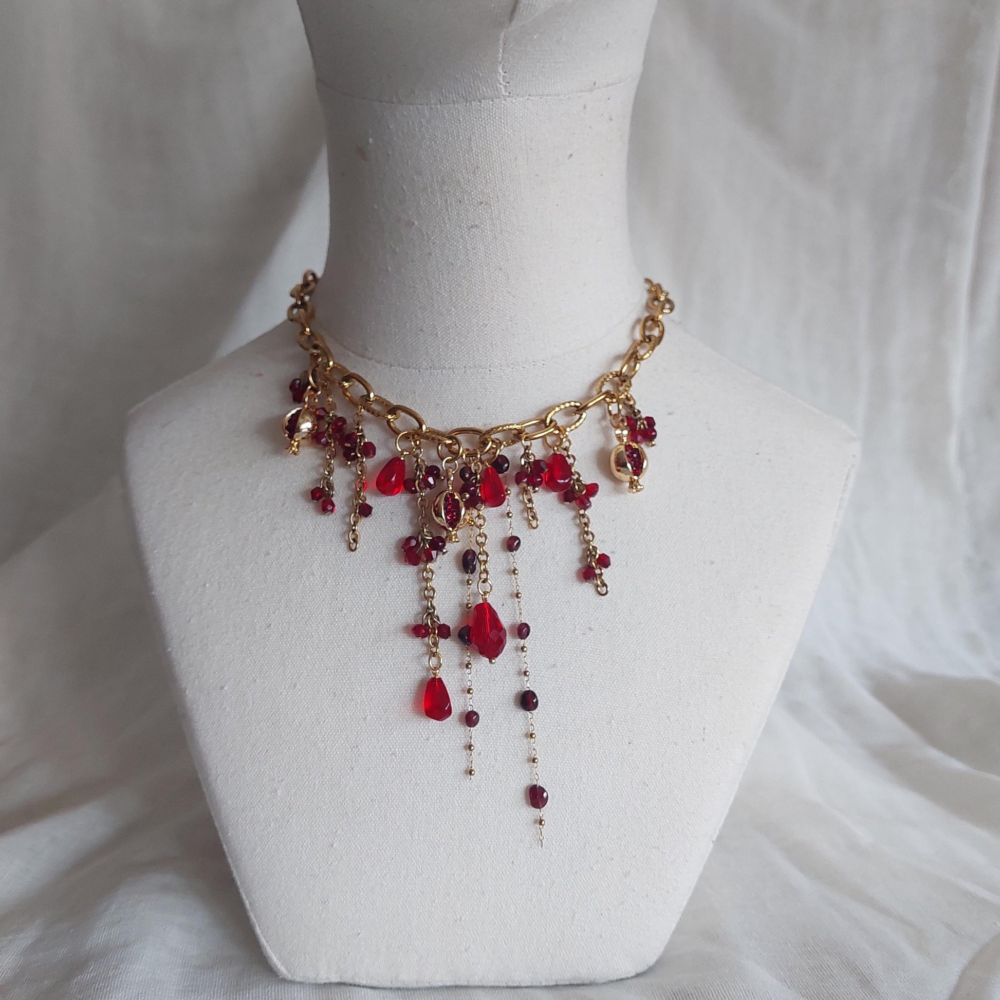 Inspired by the rich symbolism of the pomegranate, this stunning handmade cascade necklace features natural garnet and ruby, glass beads. Each element is carefully crafted to evoke the vibrant beauty of pomegranate seeds.