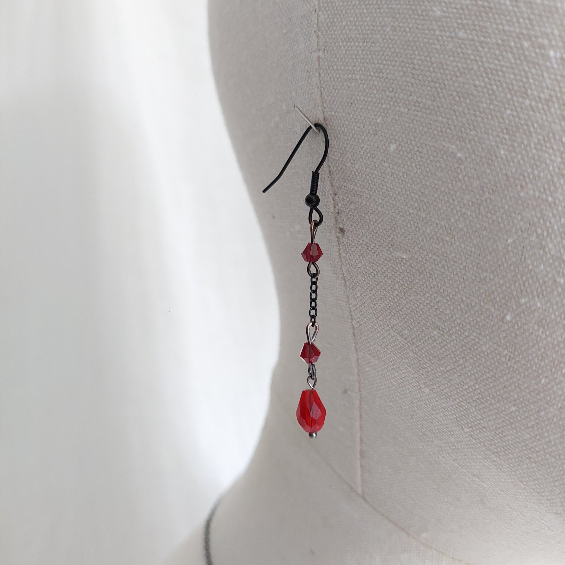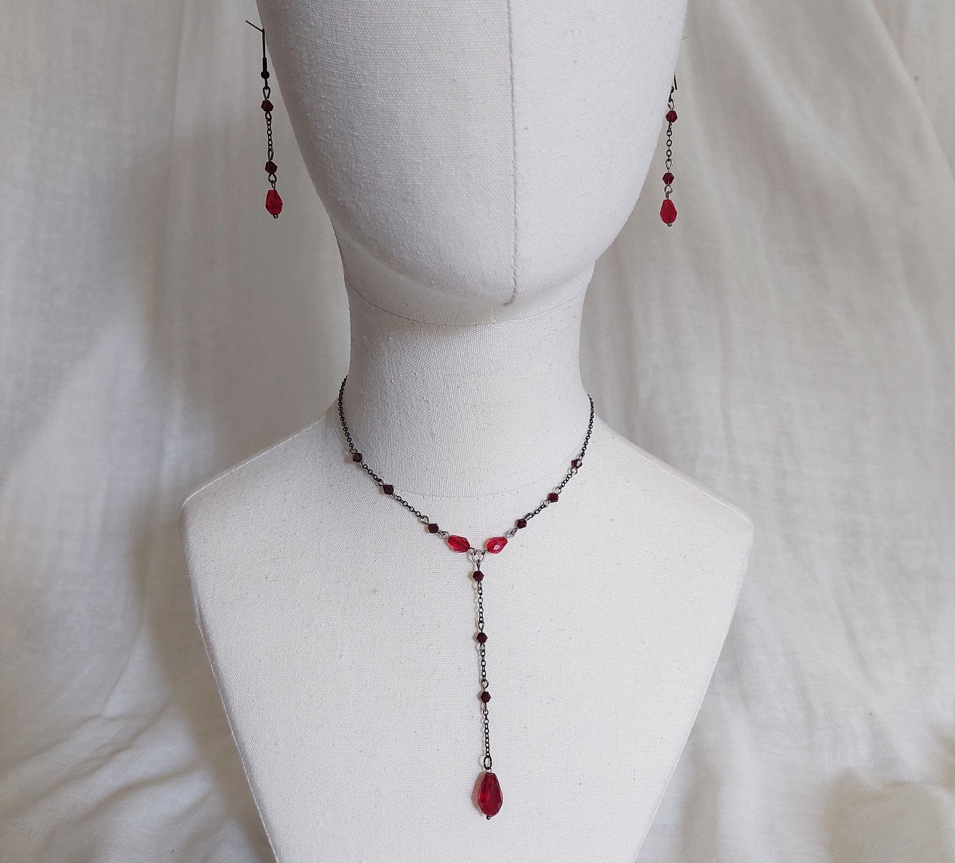 Versatile Matching Earrings: The matching earrings feature the same dazzling red crystals, perfectly coordinating with the necklace to complete the look. The earrings are designed to dangle gracefully, adding a subtle yet striking accent to your ears.
