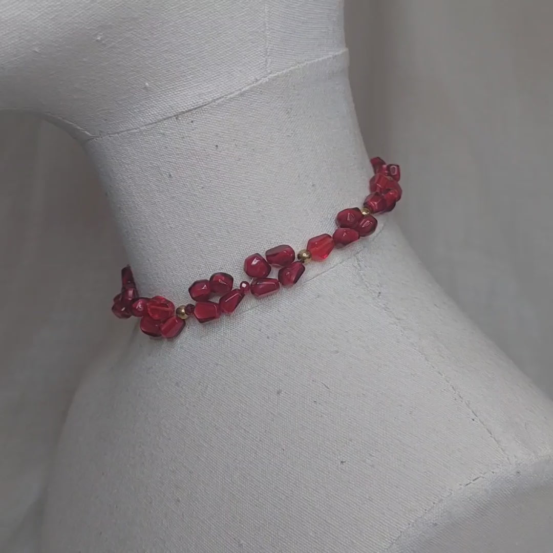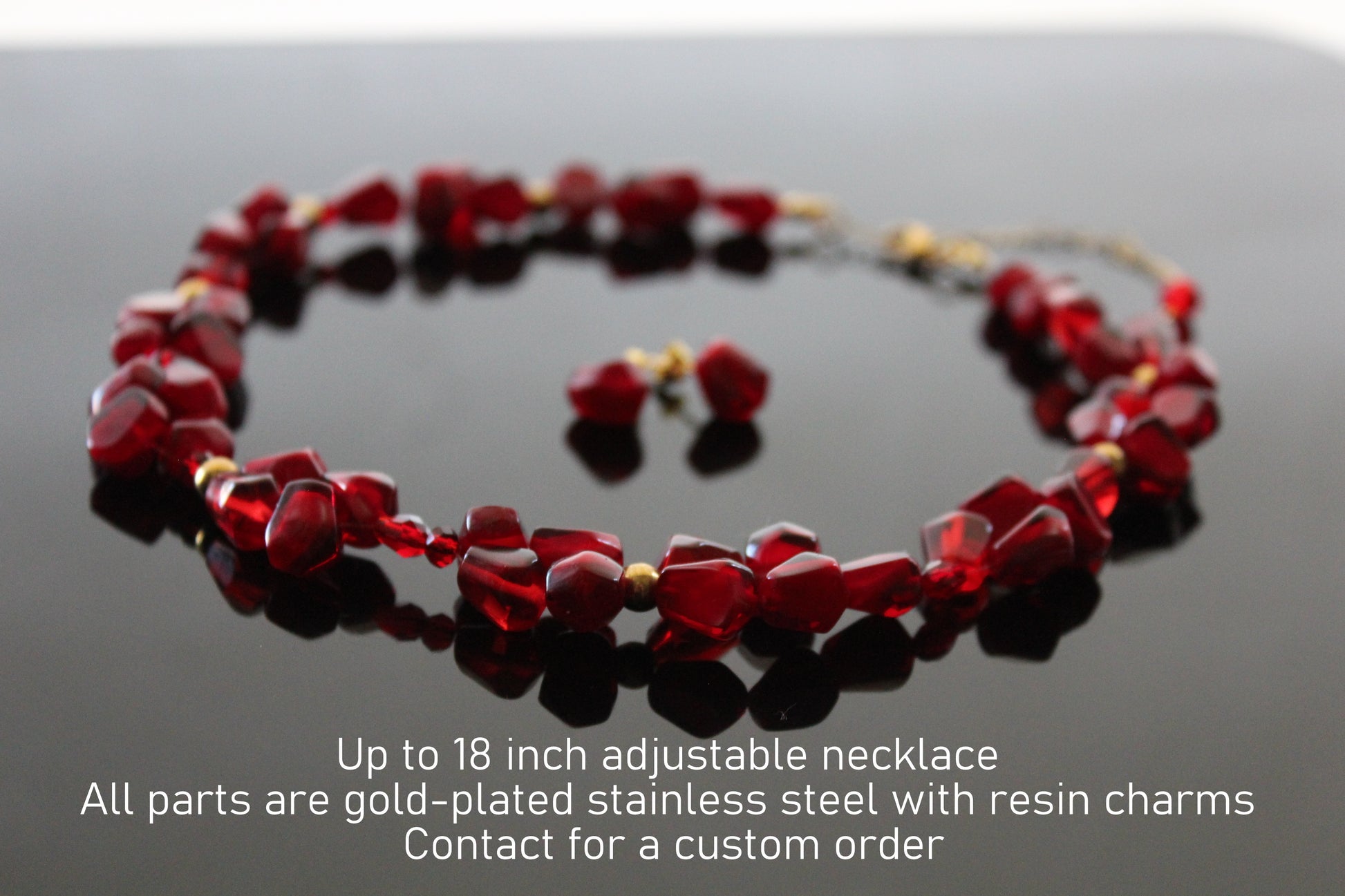 This handmade pomegranate-inspired jewelry set features a stunning necklace and matching stud earrings. The necklace is crafted with vibrant red faceted resin beads, designed to resemble pomegranate seeds, and accented with 18K gold-plated stainless steel components. Each bead is carefully arranged to create a rich, textured look, making this piece both eye-catching and elegant. The necklace is adjustable up to 18 inches, allowing for a perfect fit.